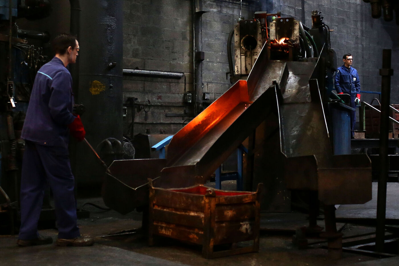 Des salaries travaillent dans les forges de l entreprise Lebronze Alloys a Trie-Chateau dans le nord de la France le 3 avril 2015. Lebronze alloys est un groupe industriel specialise dans la production de produits semi-finis et finis en alliages techniques de cuivre et de nickel de haute performance.