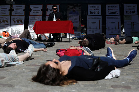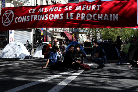 Activists from the Extinction Rebellion climate change action group block the Grand Boulevard in Paris during a demonstration in Paris on 17 April 2022.