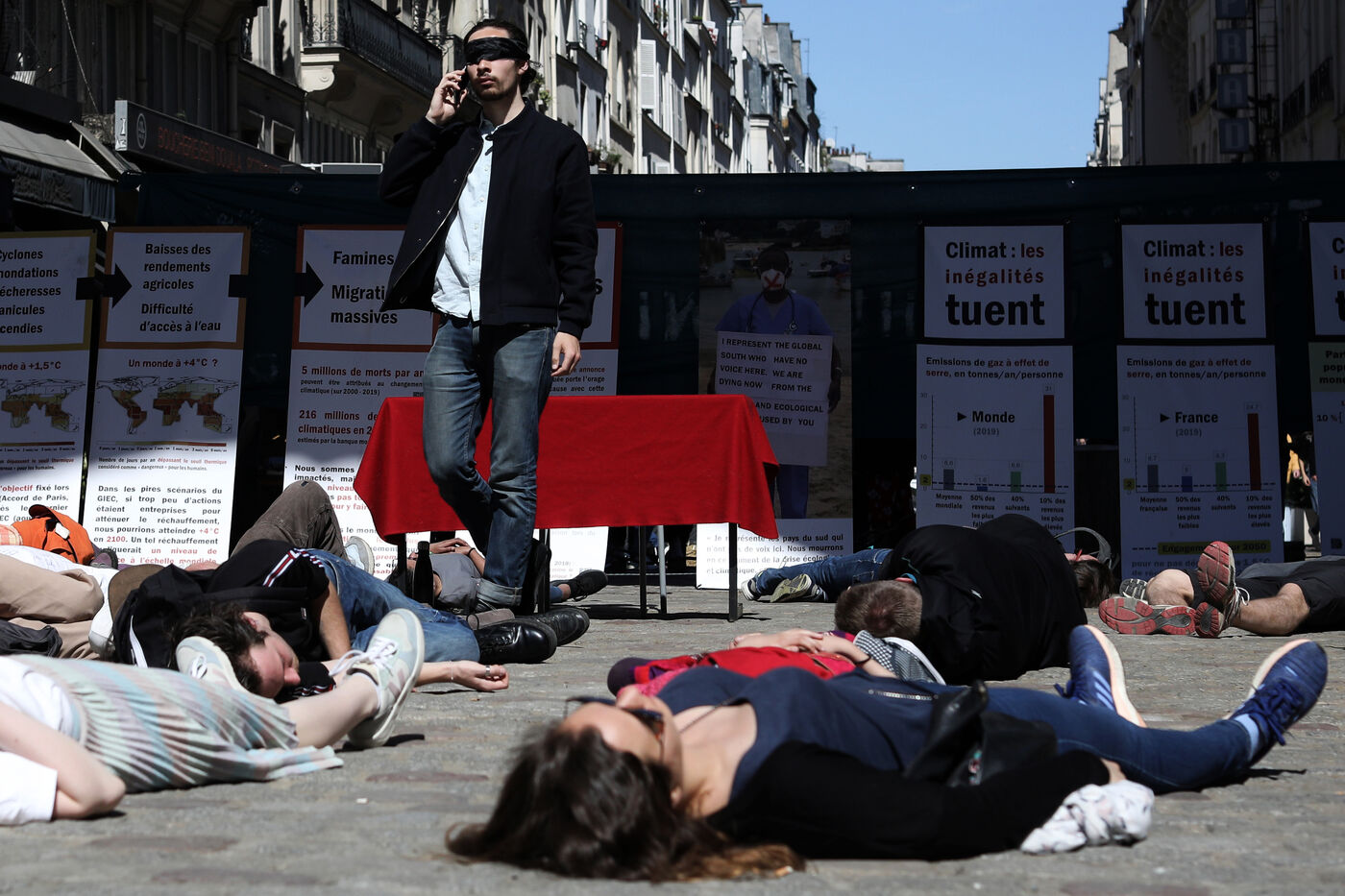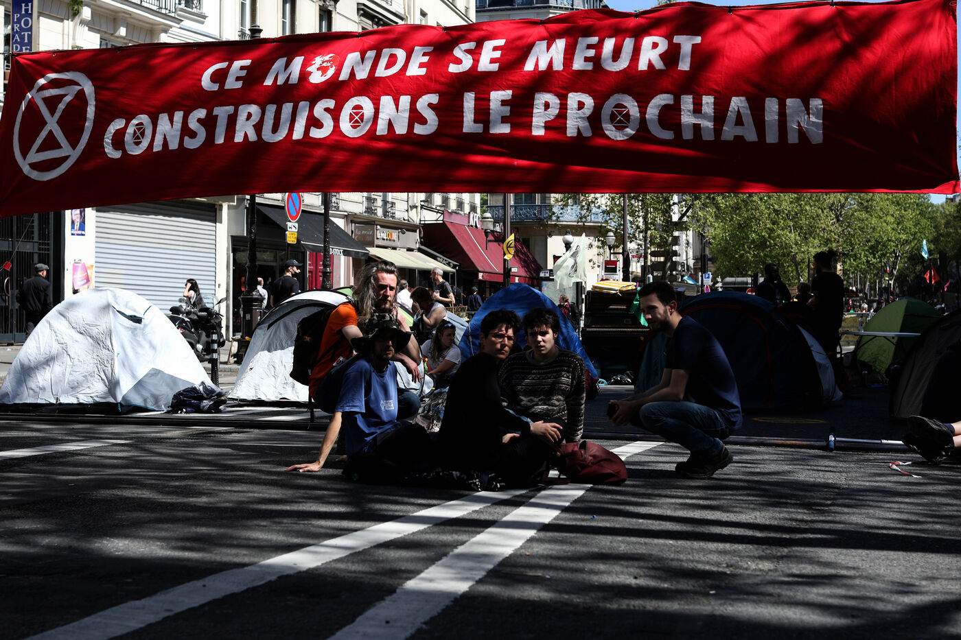 Des militants du groupe d action contre le changement climatique Extinction Rebellion bloquent le Grand Boulevard de Paris lors d'une manifestation a Paris le 17 avril 2022.