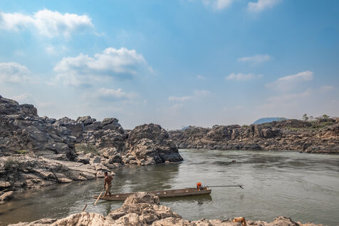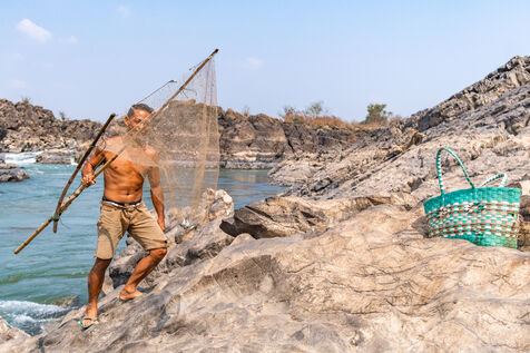 Traditional fisherman using a cast net in the meandering rapids of the Mekong River in Laos