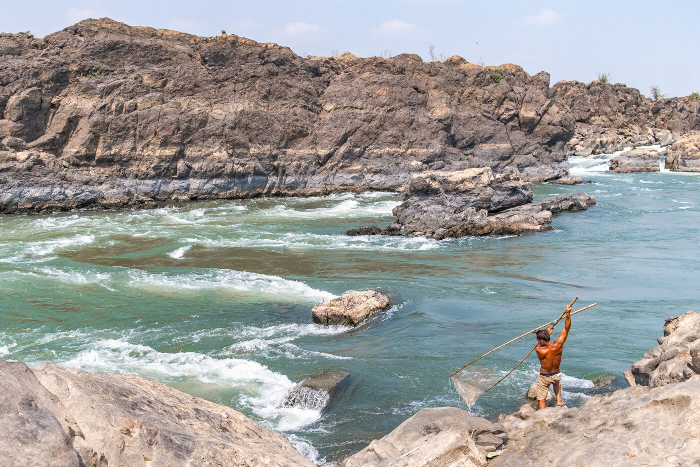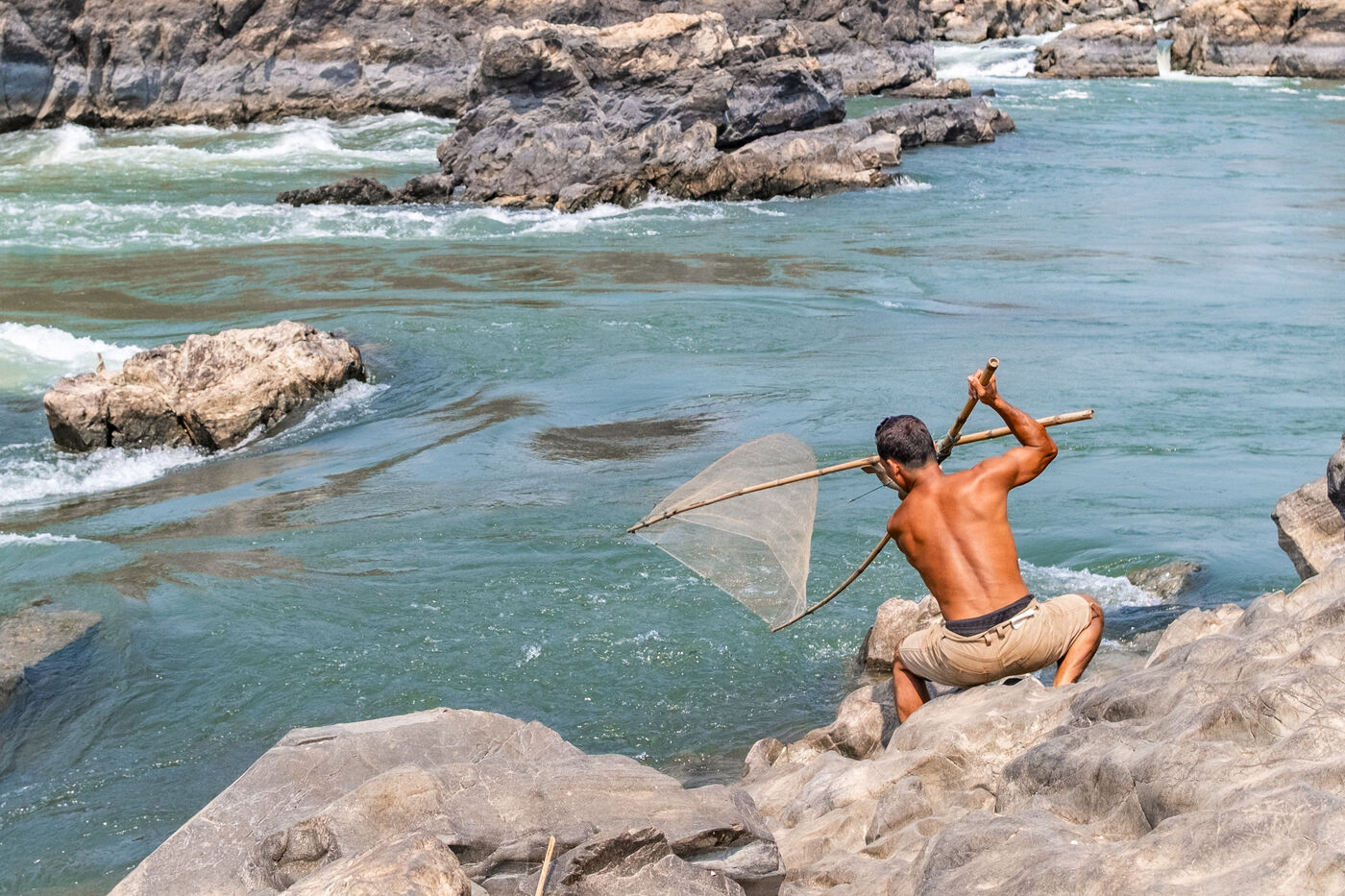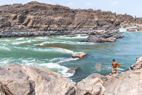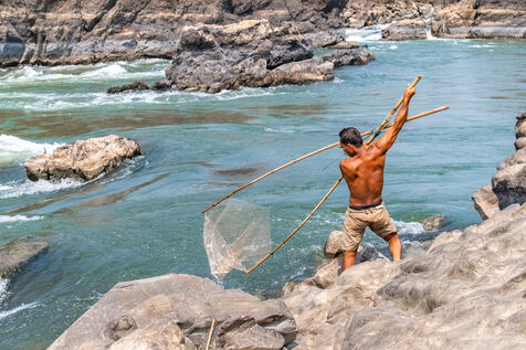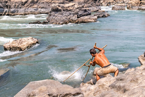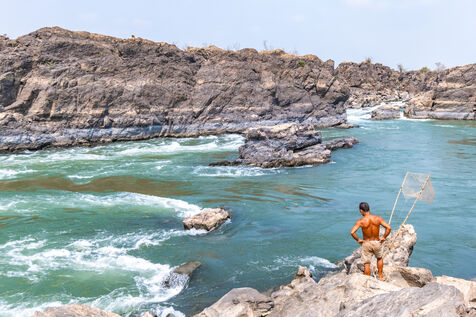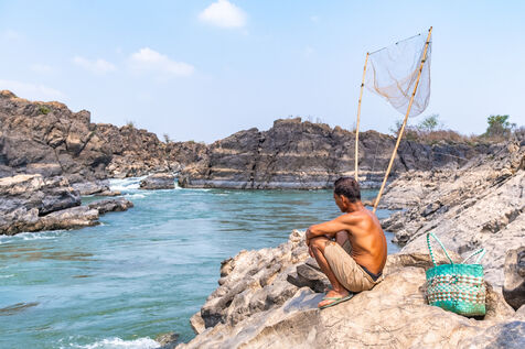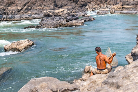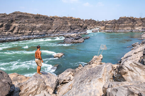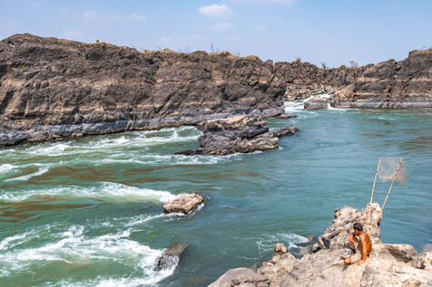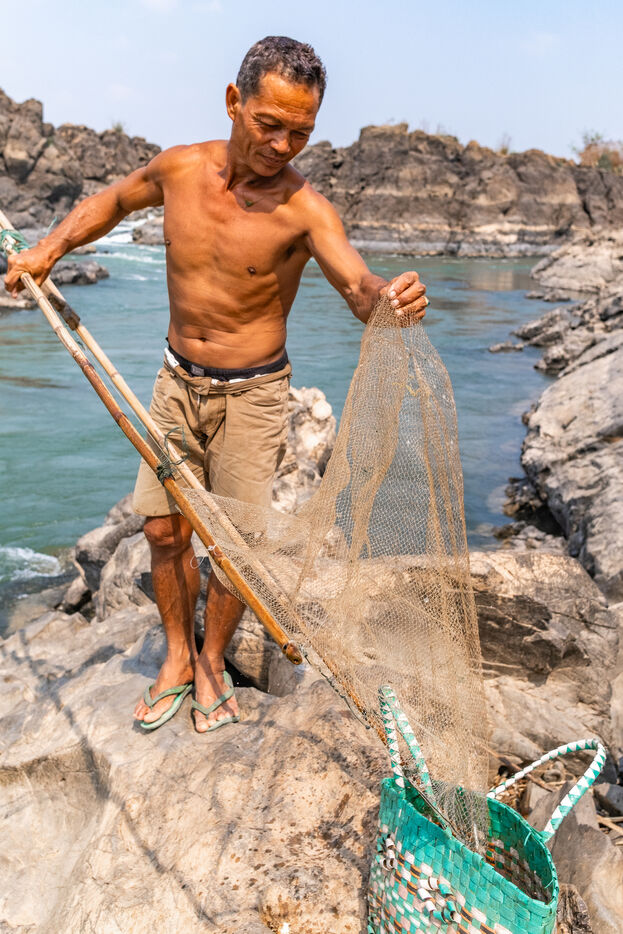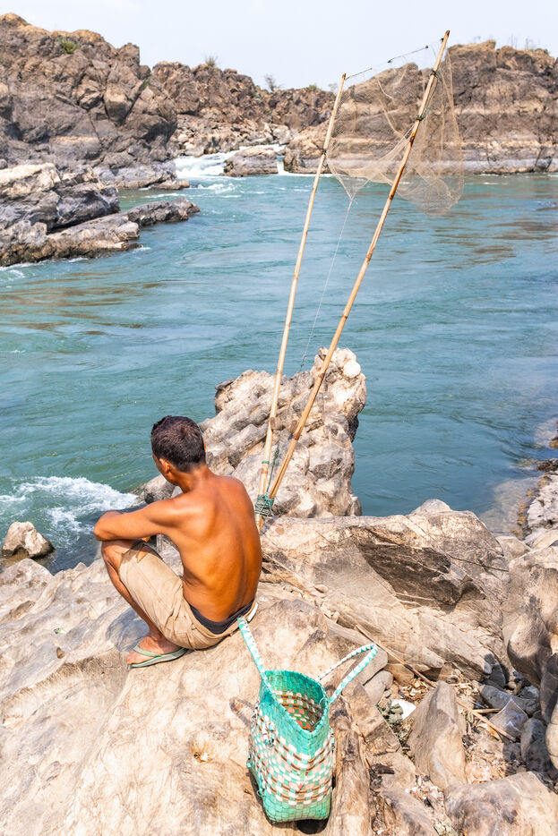 Traditional fishing with a cast net above rapids near the Khone Phapheng Falls at Don Det in Champasak Province, Laos. The fisherman stands above the rapids, watching for the glint of small fish, and then casts his net. He then dries the fish on the rocks in the sun.