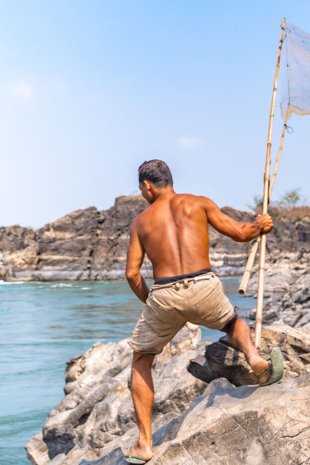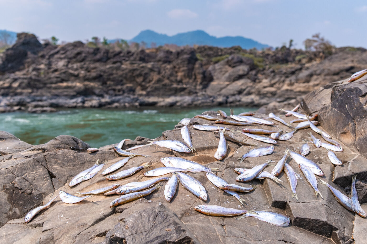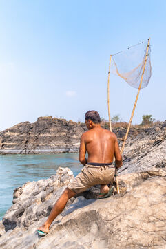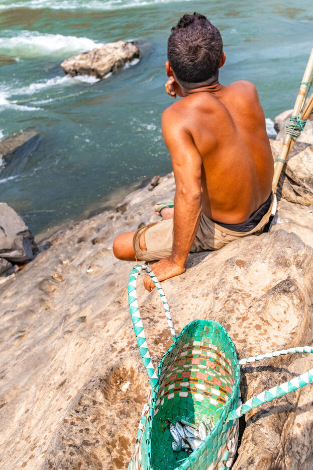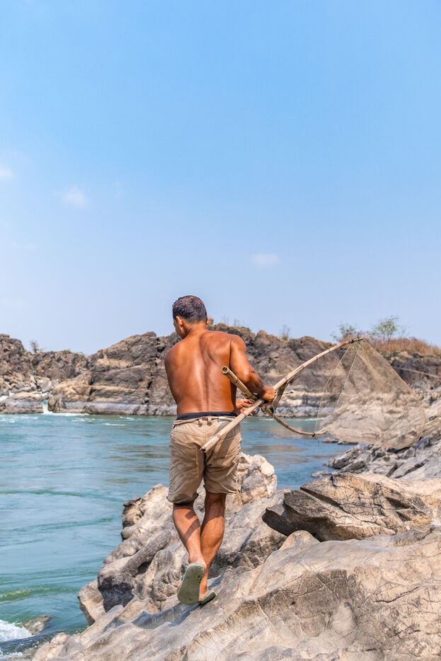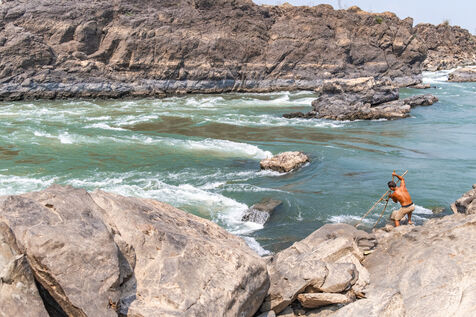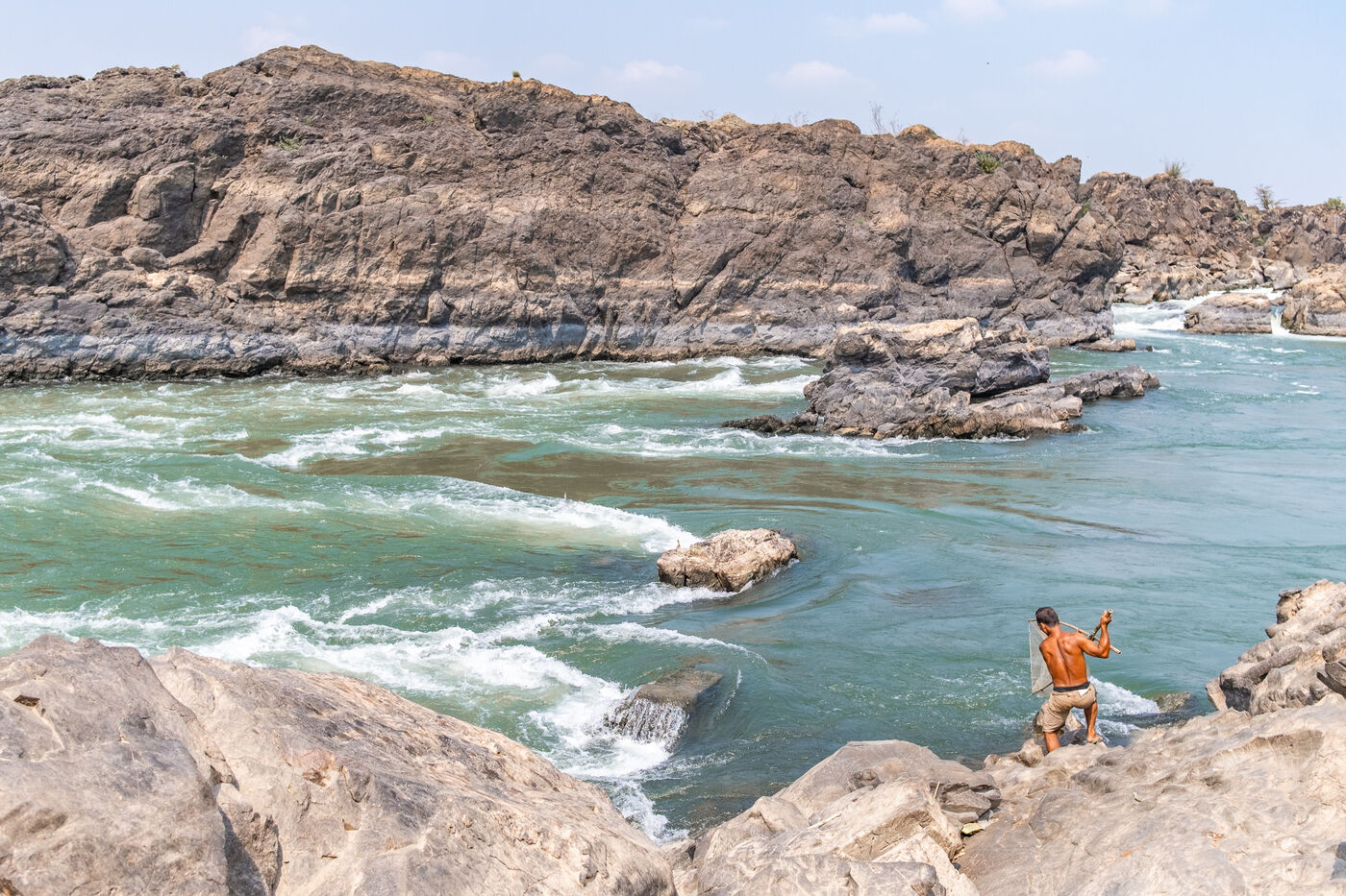 Traditional fishing with a cast net above rapids near the Khone Phapheng Falls at Don Det in Champasak Province, Laos. The fisherman stands above the rapids, watching for the glint of small fish, and then casts his net. He then dries the fish on the rocks in the sun.