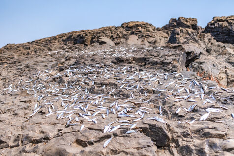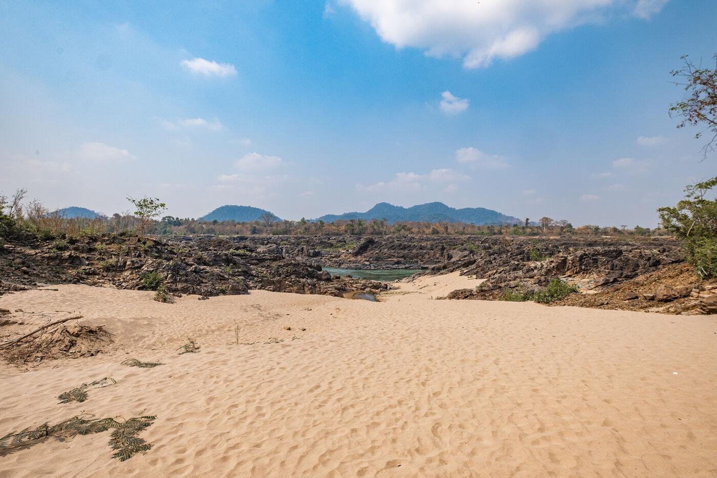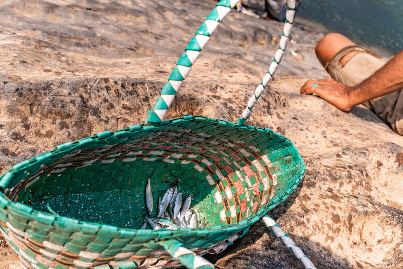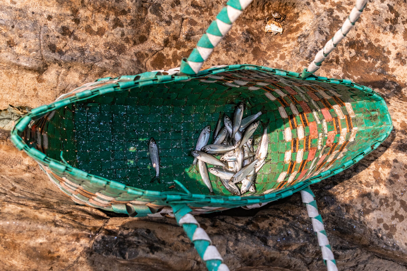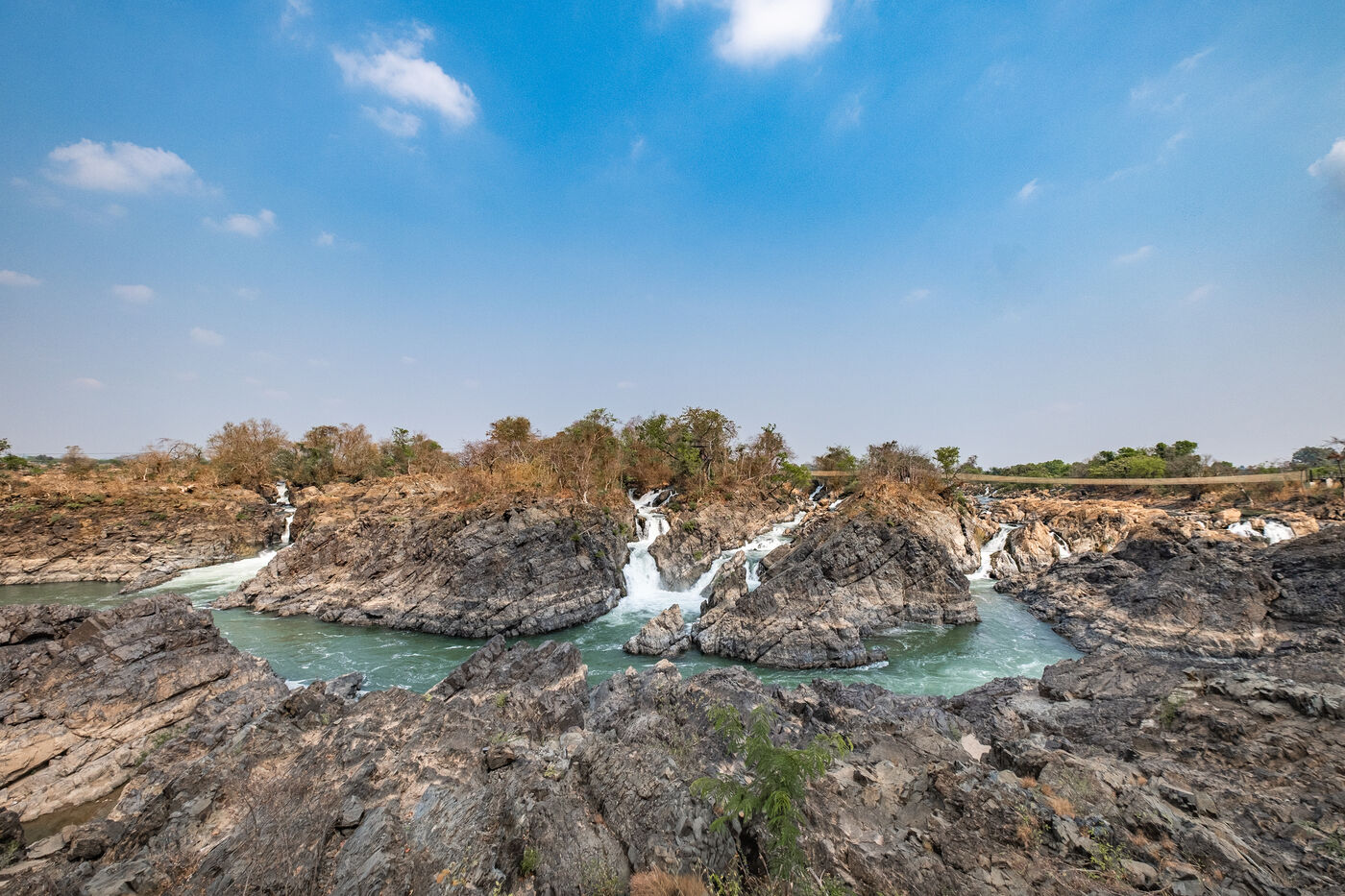Traditional fishing with a cast net above rapids near the Khone Phapheng Falls at Don Det in Champasak Province, Laos. The fisherman stands above the rapids, watching for the glint of small fish, and then casts his net. He then dries the fish on the rocks in the sun.
