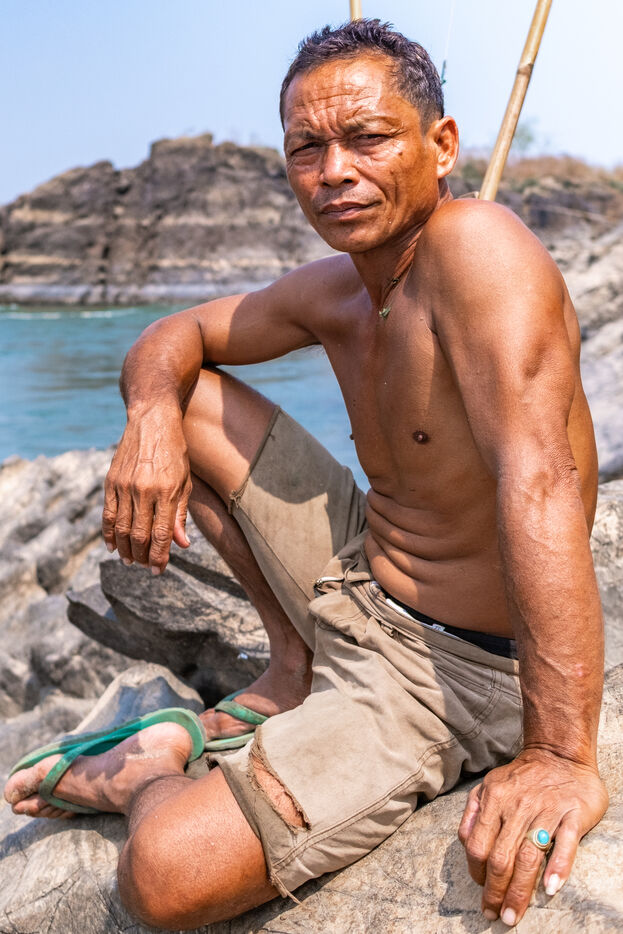 Pêcheur traditionnel au filet à l'épervier dans les méandres des rapides du Mekong au laos