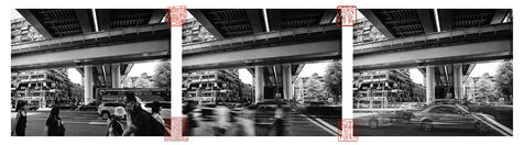Triptych on Fuxing Boulevard. The hum of engines, the back-and-forth of pedestrians drawn to the shop windows, and above it all, gliding like a thought in transit, the Wenhu line slips past the Zhongxiao intersection, indifferent to the chaos below.