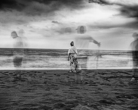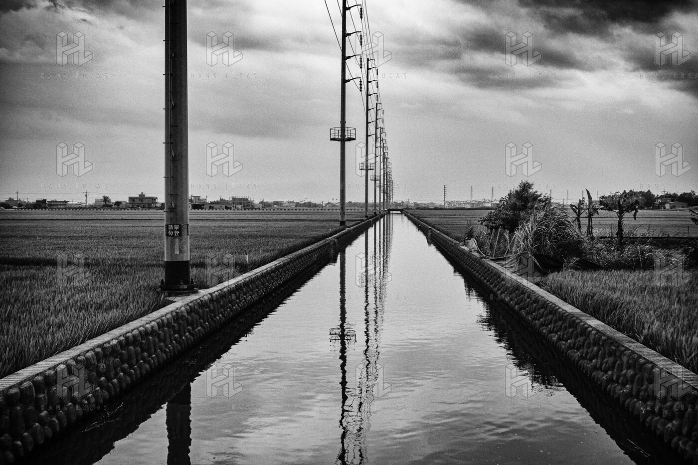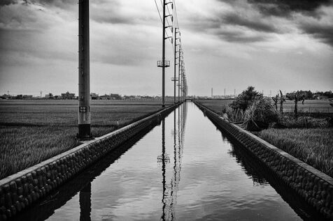 The rice fields split open beneath the pale sky, scored by slow-moving canals where the water whispers, and the mountains, massive and still, keep watch like beasts lying in the mist.