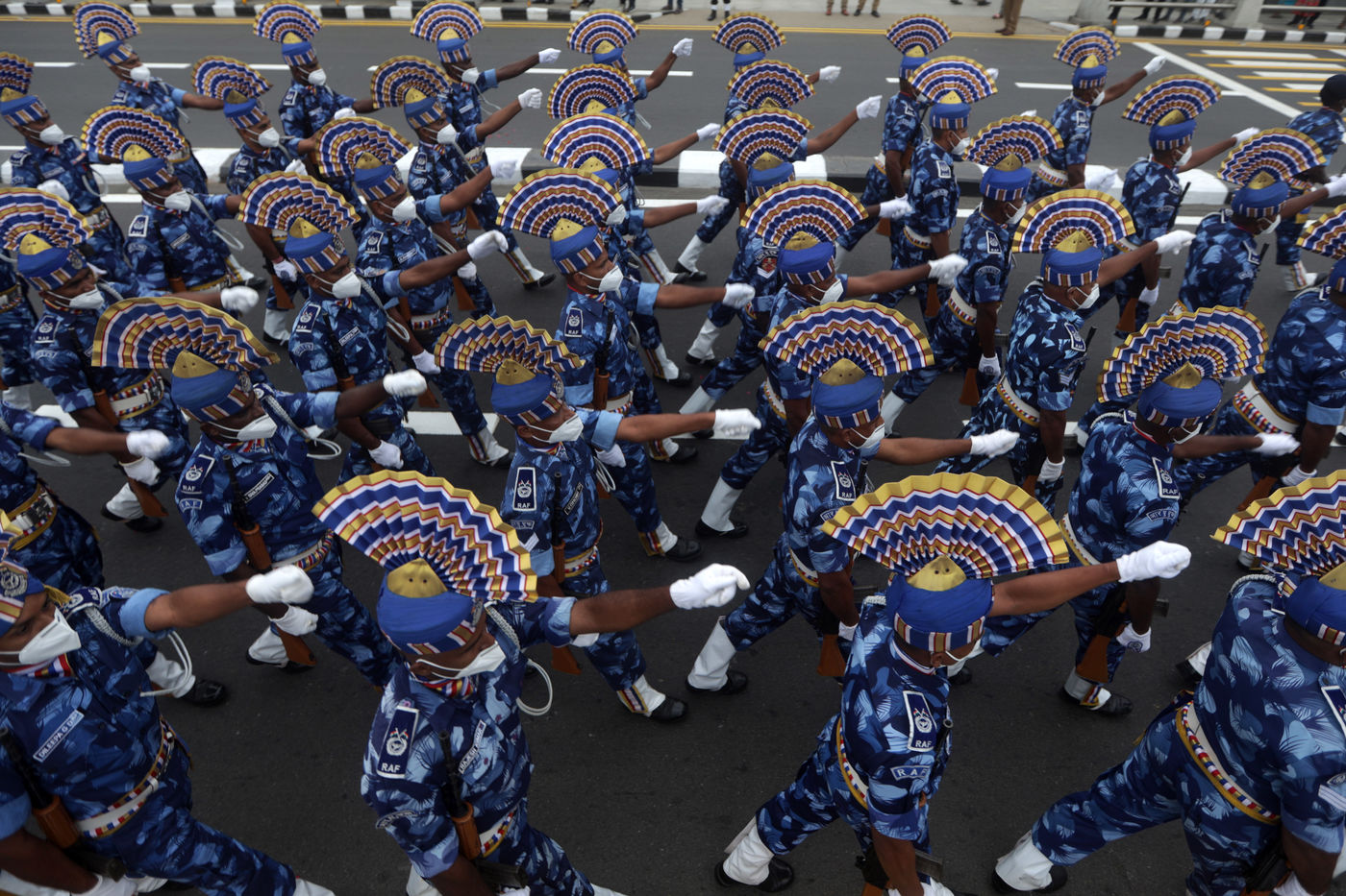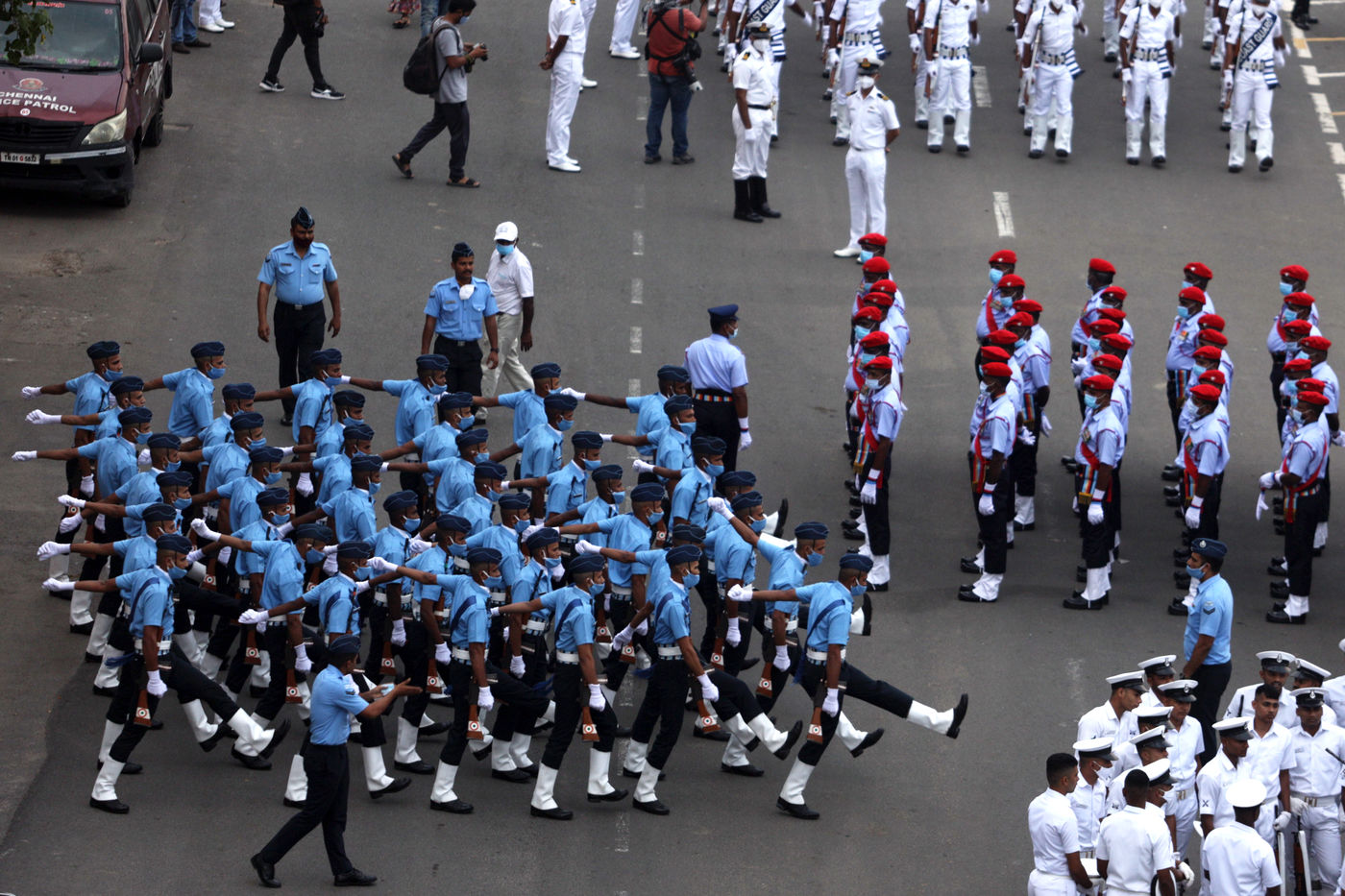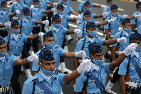 India, Chennai, 2022-01-24. Indian Air Force (IAF) soldiers participate in a full dress rehearsal ahead of the upcoming Republic Day parade in Chennai. On January 26, India will celebrate the 73rd Republic Day, which marks the enactment of the Constitution Of India on that day in 1950. Photograph by Sri Loganathan Velmurugan / Hans Lucas.