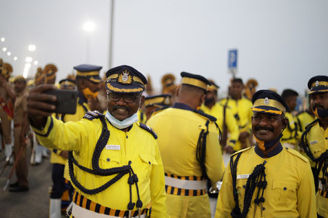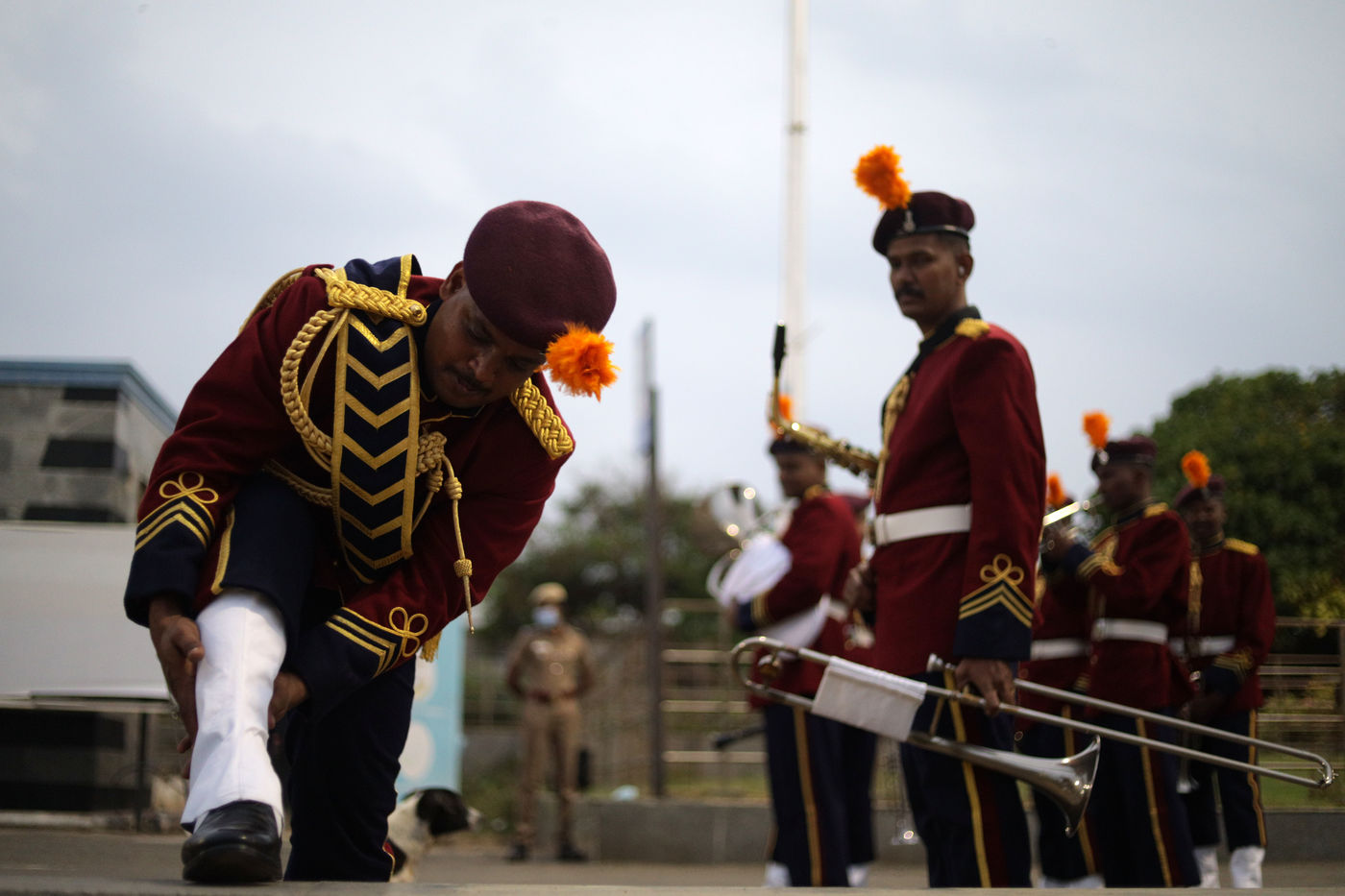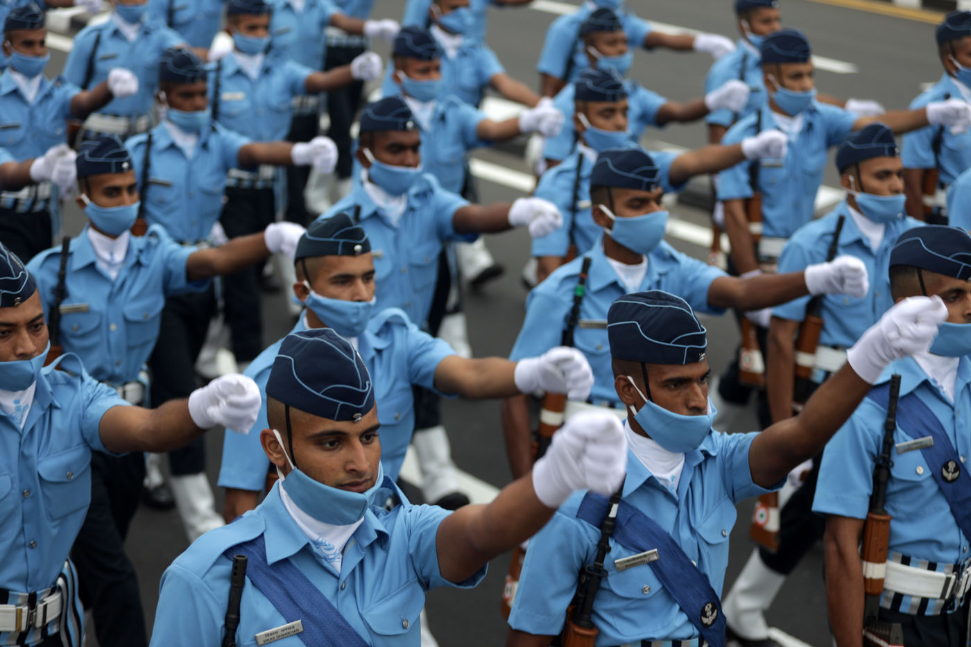 Inde, Chennai, 2022-01-24. Des soldats de l Indian Air Force (IAF) participent a une repetition generale avant le prochain defile du Jour de la Republique a Chennai. Le 26 janvier, l Inde celebrera le 73e jour de la Republique, qui marque la promulgation de la Constitution de l Inde ce jour-la en 1950. Photographie de Sri Loganathan Velmurugan / Hans Lucas.