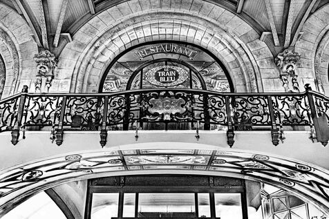 Inauguré pour l'Exposition Universelle de 1900, le restaurant Le Train Bleu est bien plus qu'une table : c'est un voyage immobile dans l'histoire de Paris. Cette série de trois clichés s'attache à saisir la grandeur de ce lieu classé monument historique. Du graphisme des structures métalliques de la Gare de Lyon aux courbes sculptées de sa balustrade, l'objectif souligne le dialogue entre l'ingénierie ferroviaire et l'opulence des décors intérieurs. Chaque image rend hommage à l'art de vivre "à la française" et à cette atmosphère unique où le temps semble s'être arrêté, entre deux départs de trains.