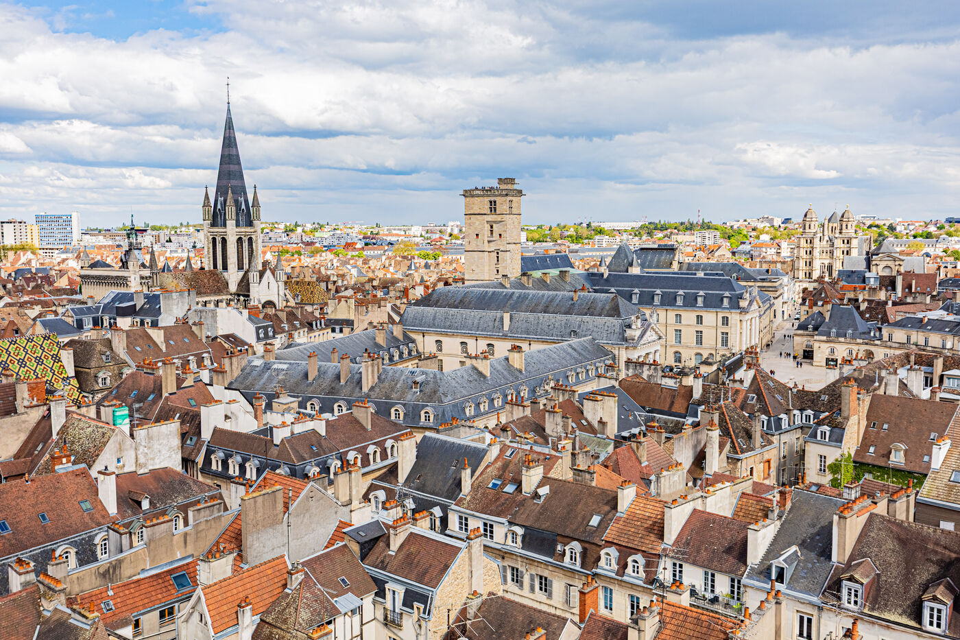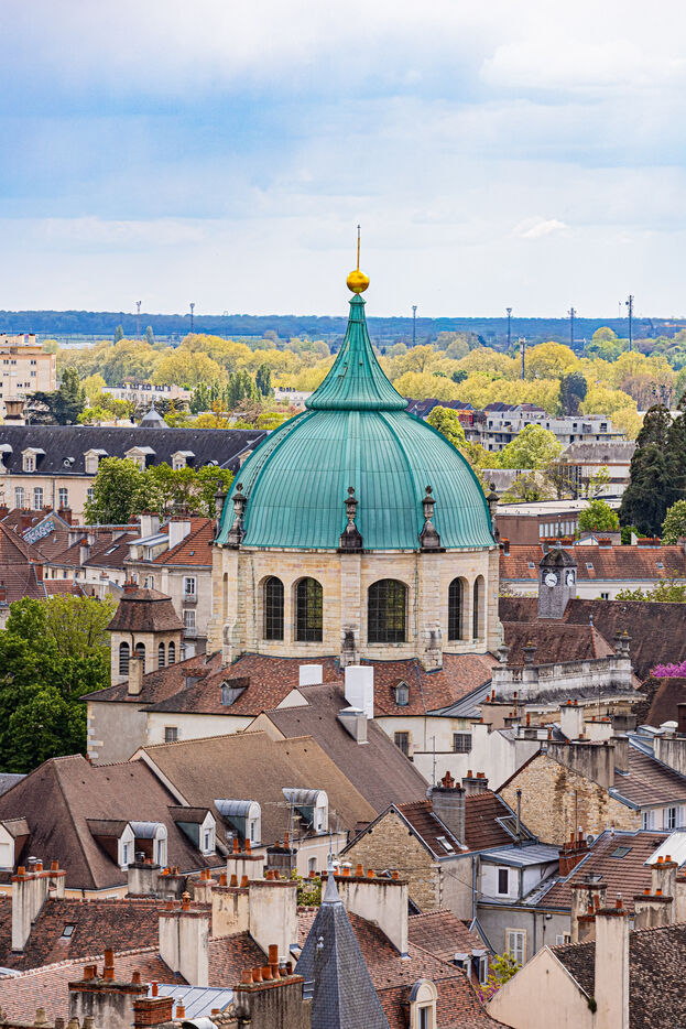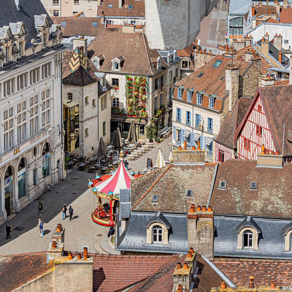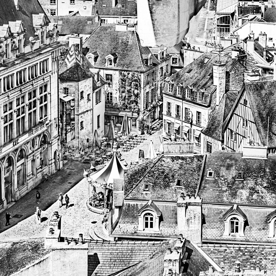 Gaining Heights: A vertical exploration of the Burgundian capital. This series, taken above the heart of Dijon from the top of the construction crane at the Centre Dauphine Dijon, offers an exceptional panorama from over 30 meters high, revealing the density and architectural beauty of Dijon's historic center. Rising to Rediscover: This series is a declaration of love for the City of the Dukes, captured from a unique perspective. Over 30 meters above the heart of Dijon, the view encompasses the jumble of terracotta roofs, the verticality of the bell towers, and the imposing silhouette of the Palace of the Dukes. Taken from the crane's boom overlooking the Centre Dauphine Dijon construction site, these photographs offer a fresh graphic interpretation of Dijon's urban landscape. Between sky and stone, the viewer flies over medieval streets and lively squares, capturing the poetry of a city which, seen from above, seems to reveal its most intimate secrets in a suspended calm.