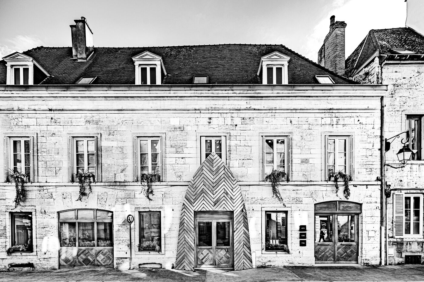The CIBO gastronomic restaurant, a must-visit destination on Dijon's culinary scene, is embarking on a new chapter in its history. Having just had its Michelin star confirmed, the restaurant is reopening its doors to the public after extensive renovations. This photographic series focuses on the architectural metamorphosis of its exterior. The eye is immediately captivated by the new entrance: a majestic wooden gate with tapered lines, whose chevron pattern adds a touch of organic modernity. This sculptural structure blends with rare elegance into the traditional ashlar façade, typical of the local heritage. Through these frontal views, presented in color and in timeless black and white, the lens captures the essence of the place: a perfect alliance between respect for heritage and creative audacity, reflecting the excellent cuisine served behind these doors.