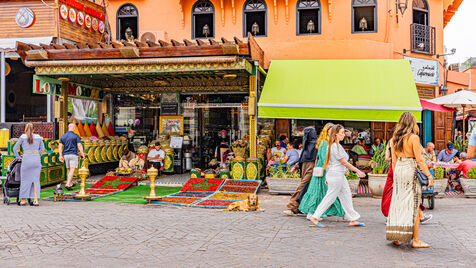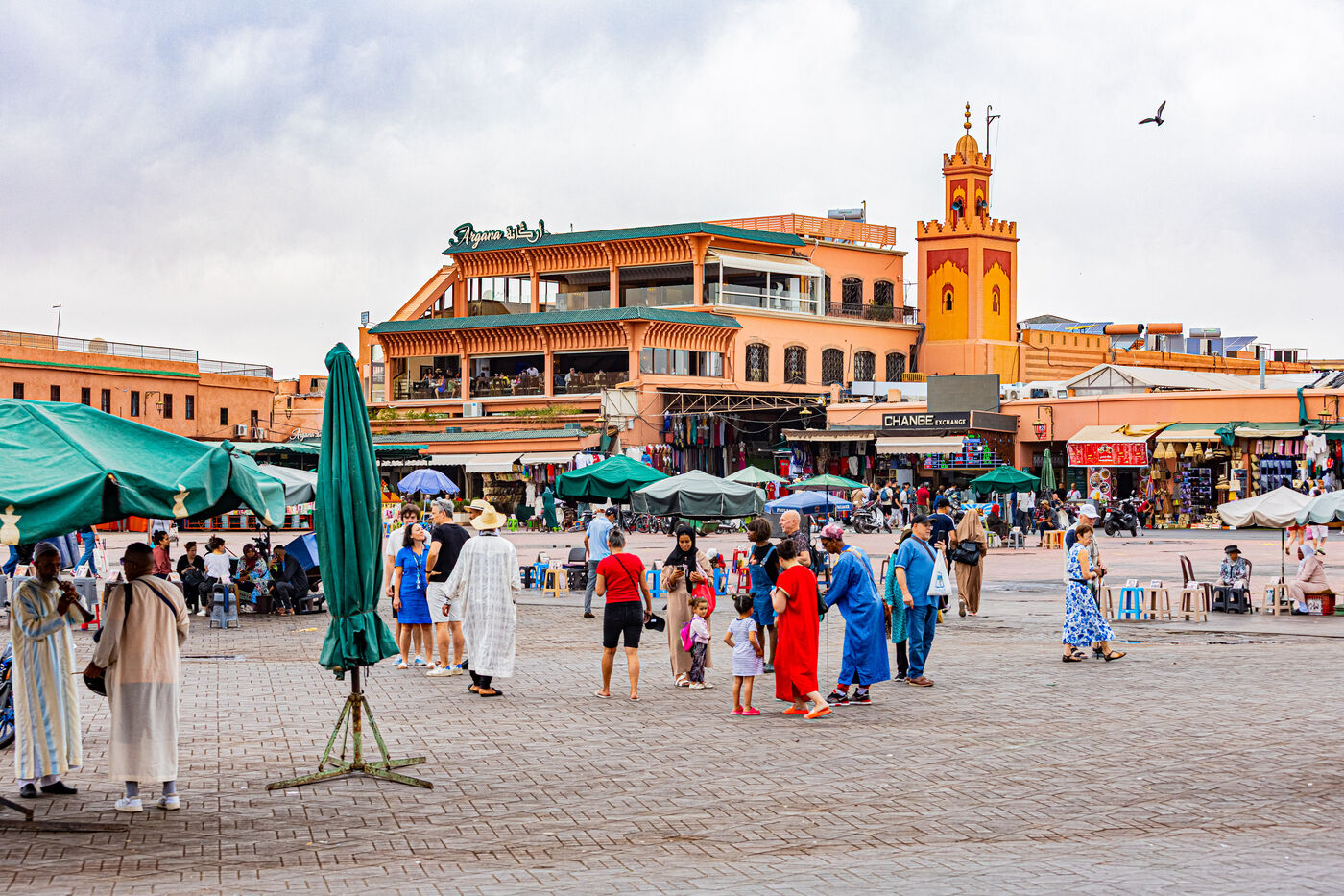 The lens lingers on the mosaic of scenes of daily life that animate it: the explosion of colors on the fresh juice stalls, the ballet of merchants, the labyrinth of traditional shops, and the breathtaking view from the terraces where the famous mint tea is savored. Through wide shots embracing the immensity of the square and perspectives highlighting the iconic silhouette of the Koutoubia Mosque minaret in the background, this report documents the vitality of a crossroads where historical heritage, world tourism and Moroccan culture harmoniously intersect.