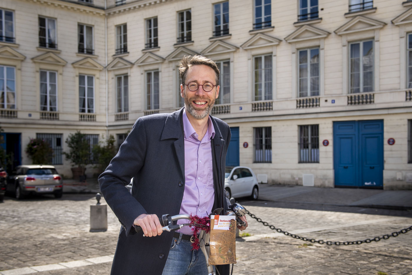 Stein van Oosteren sur son vélo devant l'Assemblée Nationale à Paris. Il est l'auteur du livre "Pourquoi pas le vélo" et président de l'association cycliste Faravelo près de Paris. Paris, France, 7 mai, 2021.