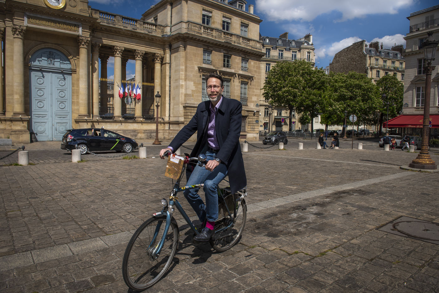 Stein van Oosteren bikes in front of the Assemblée Nationale in Paris. He is the author of the book "Pourquoi pas le velo" and president of bicycle association near Paris., Paris, France, May 7, 2021.