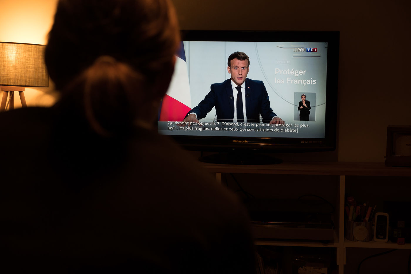 Television announcement of the reconfinement until December 1 by French President Emmanuel Macron seen from a Toulouse sofa.