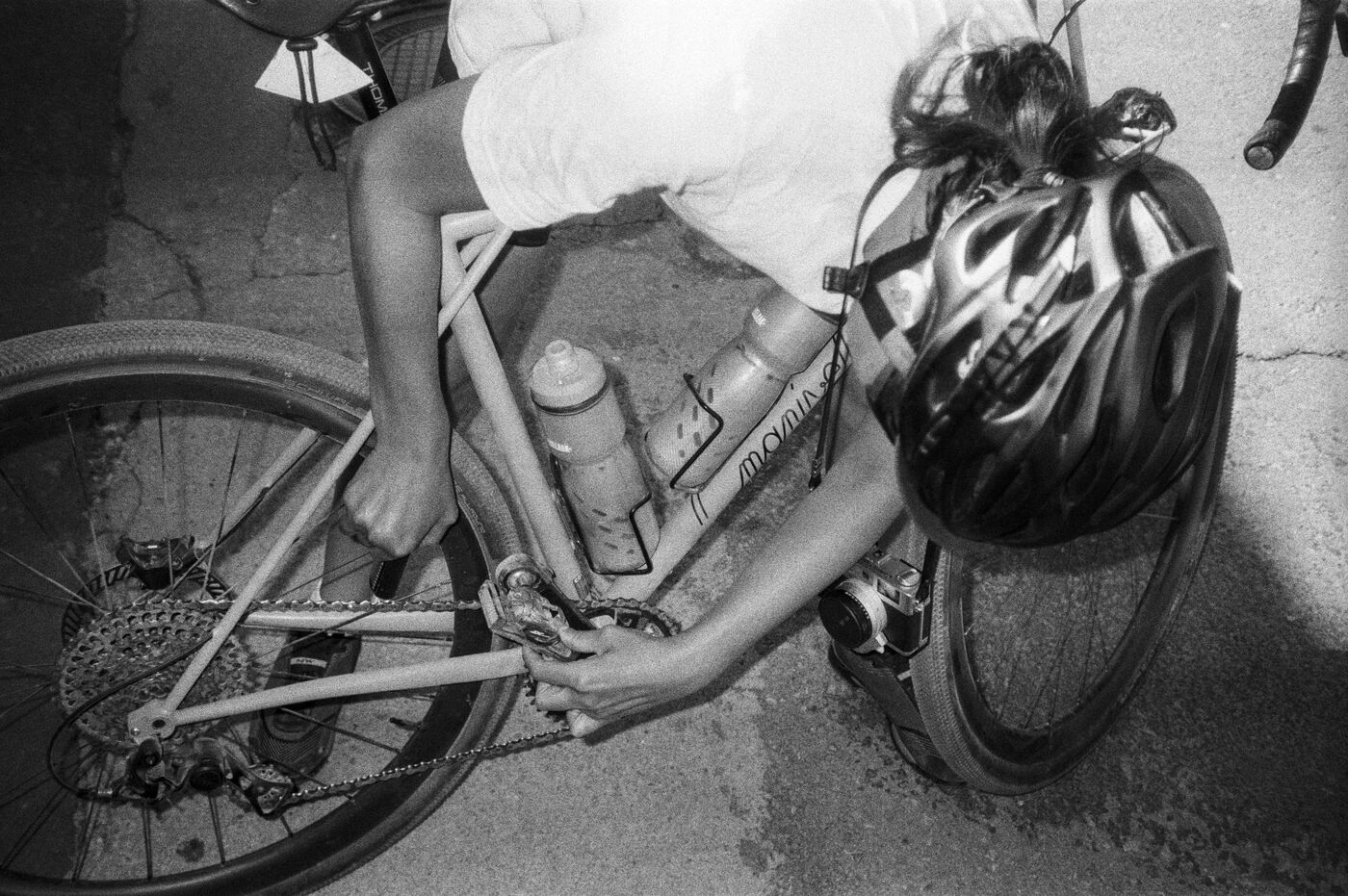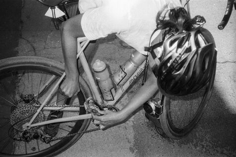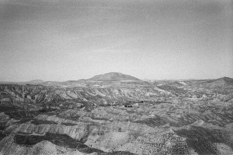 Strapped to my back each time, my film camera followed us on these crossings, despite its weight, which made it sway at the slightest impact. Like a spectator's eye, it allowed me to bear witness to this cycling adventure alongside Caroline or a few meters behind her, always following her as she led the way through the deserts.”