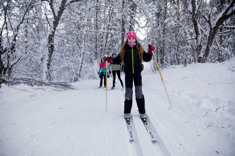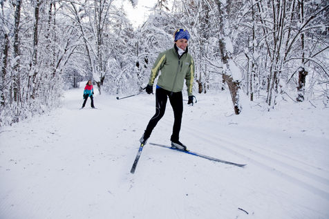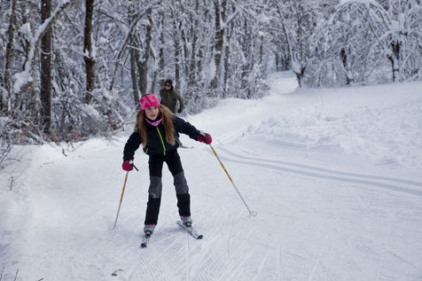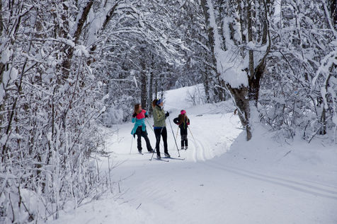 Une famille glisse à travers une forêt enneigée en ski de fond. L'ambiance y est féerique, les arbres sont charger d'un manteau blanc qui ne les quitte plus, au bord de la rivière de l'Onde d'une beauté incroyable.