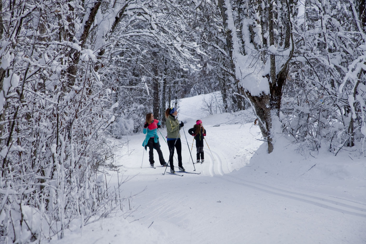 A family slides through a snowy forest on cross-country skiing. The atmosphere is magical because the trees are loaded with a white coat that never leaves them at the edge of the Onde River, which is just incredibly beautiful.