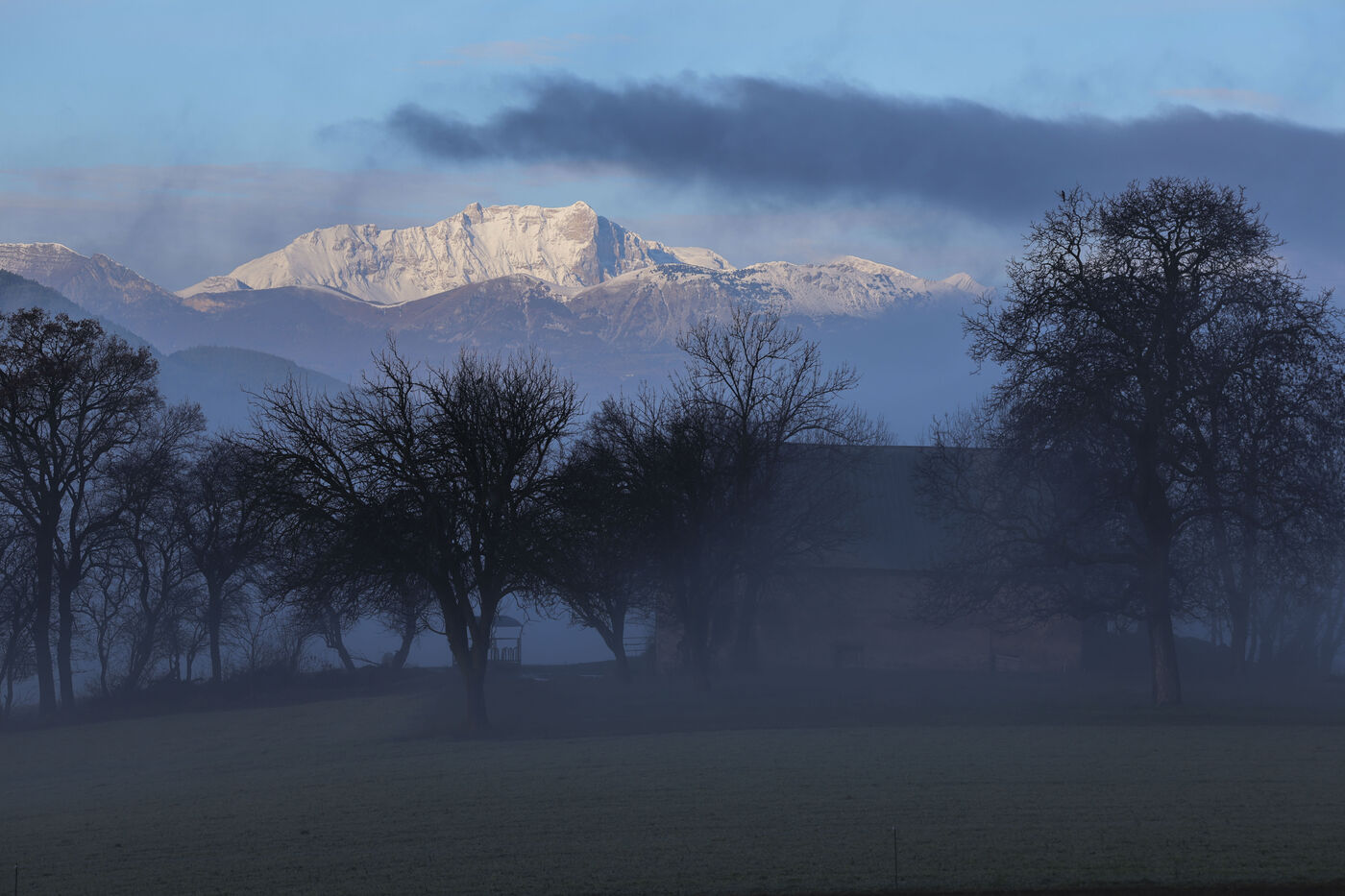 Des images de paysages prises dans la campagne des Alpes, au petit matin, avec une brume et des sommets enneigés, créant une impression de lieu mystique.