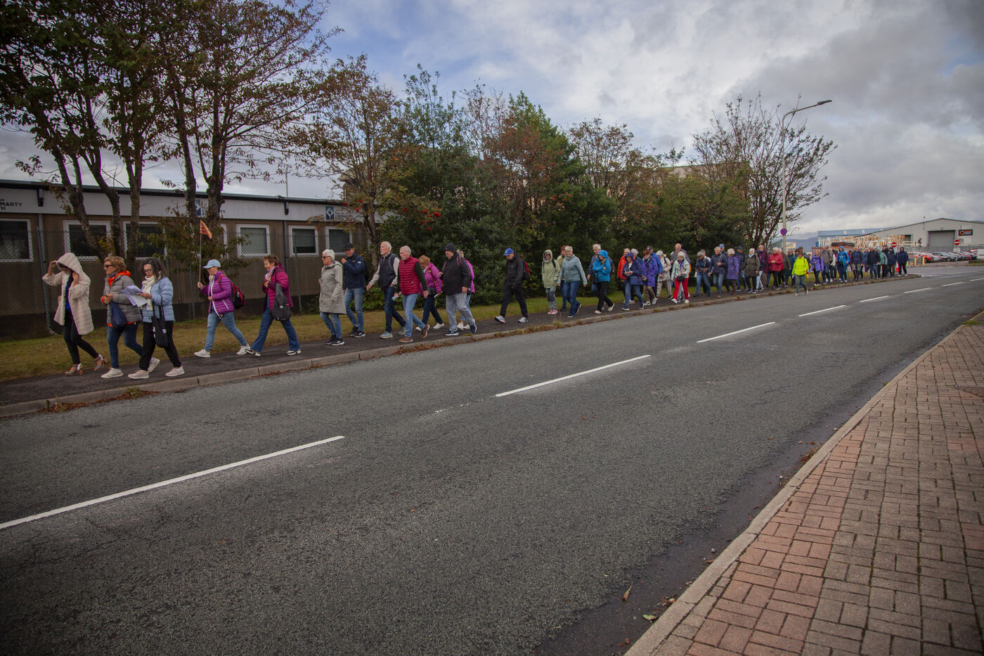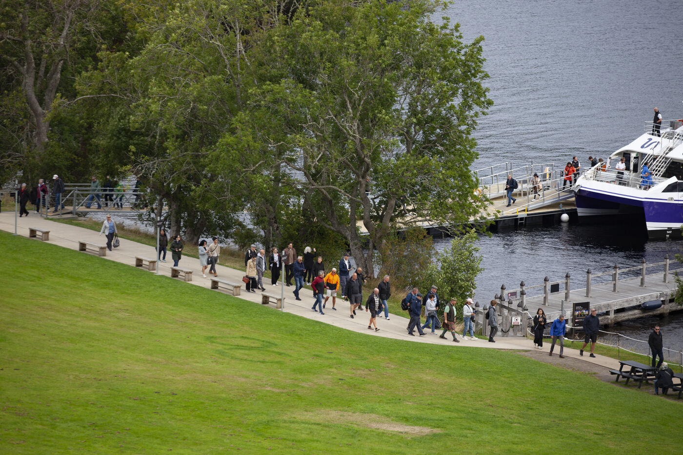 Photo 6 : Au port d’Invergordon, des passagers d’un bateau de croisière descendent pour profiter de leurs excursions d’une journée. Une longue file s’étire derrière le guide, qui agite un parapluie au-dessus de sa tête pour se faire repérer.