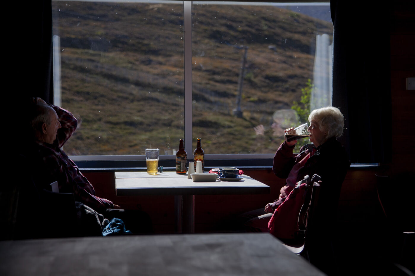 Photo 13: A couple enjoys a beer in a bar with a breathtaking view — that of Cairngorm Mountain ski resort, one of the most renowned in Scotland.