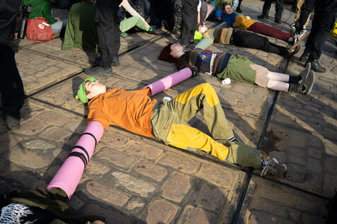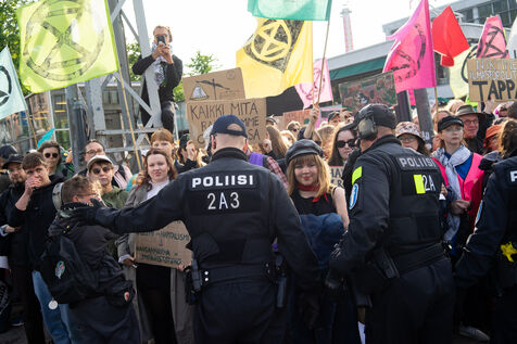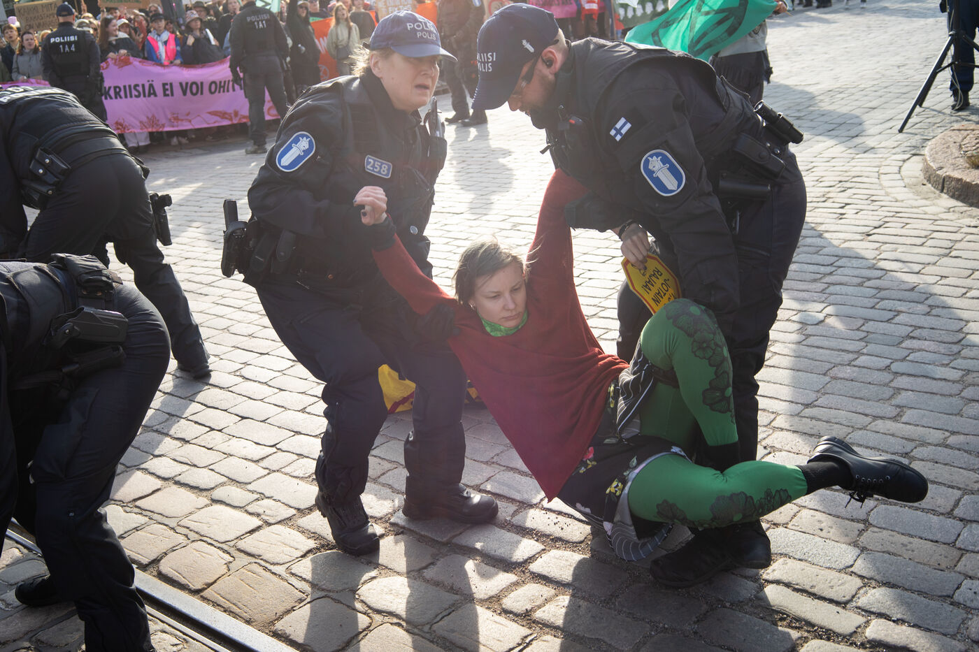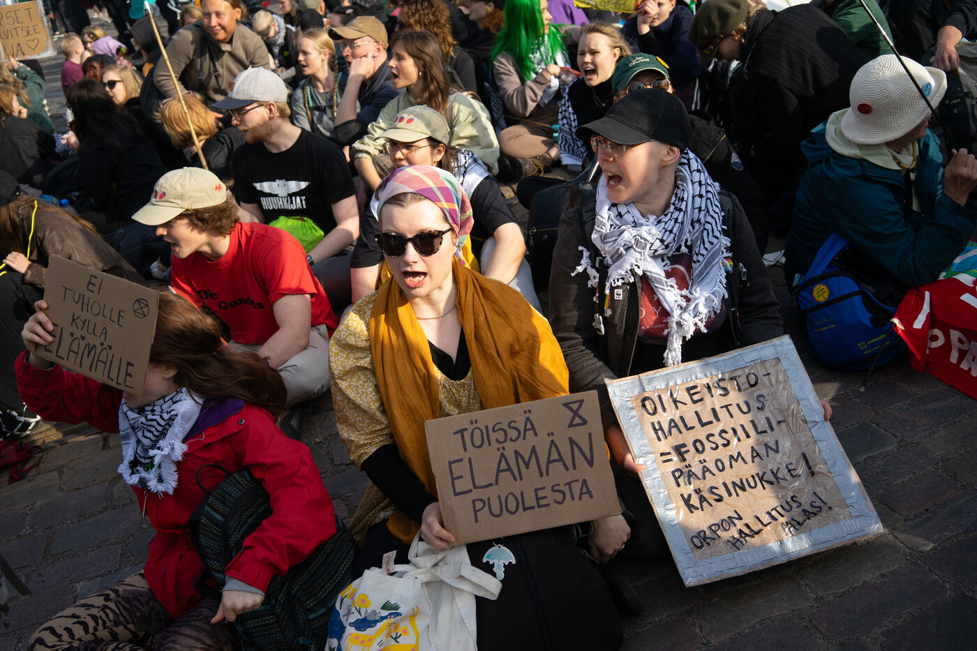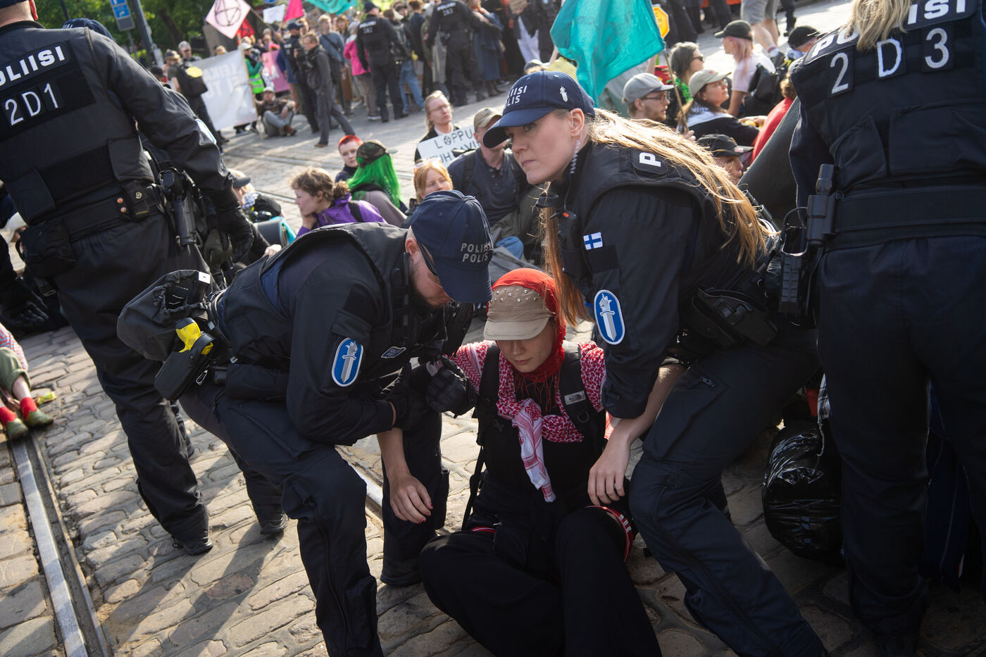 Activists from the environmental group Extinction Rebellion Finland or Elokapina protest by blocking a road as a form of civil disobedience during a demonstration in the centre of Helsinki, Finland on June 10, 2025. The group demands that the Finnish government comply with its own climate law and international agreements such as to reach the 2035 carbon neutrality target for Finland as well as better measures to tackle climate change.