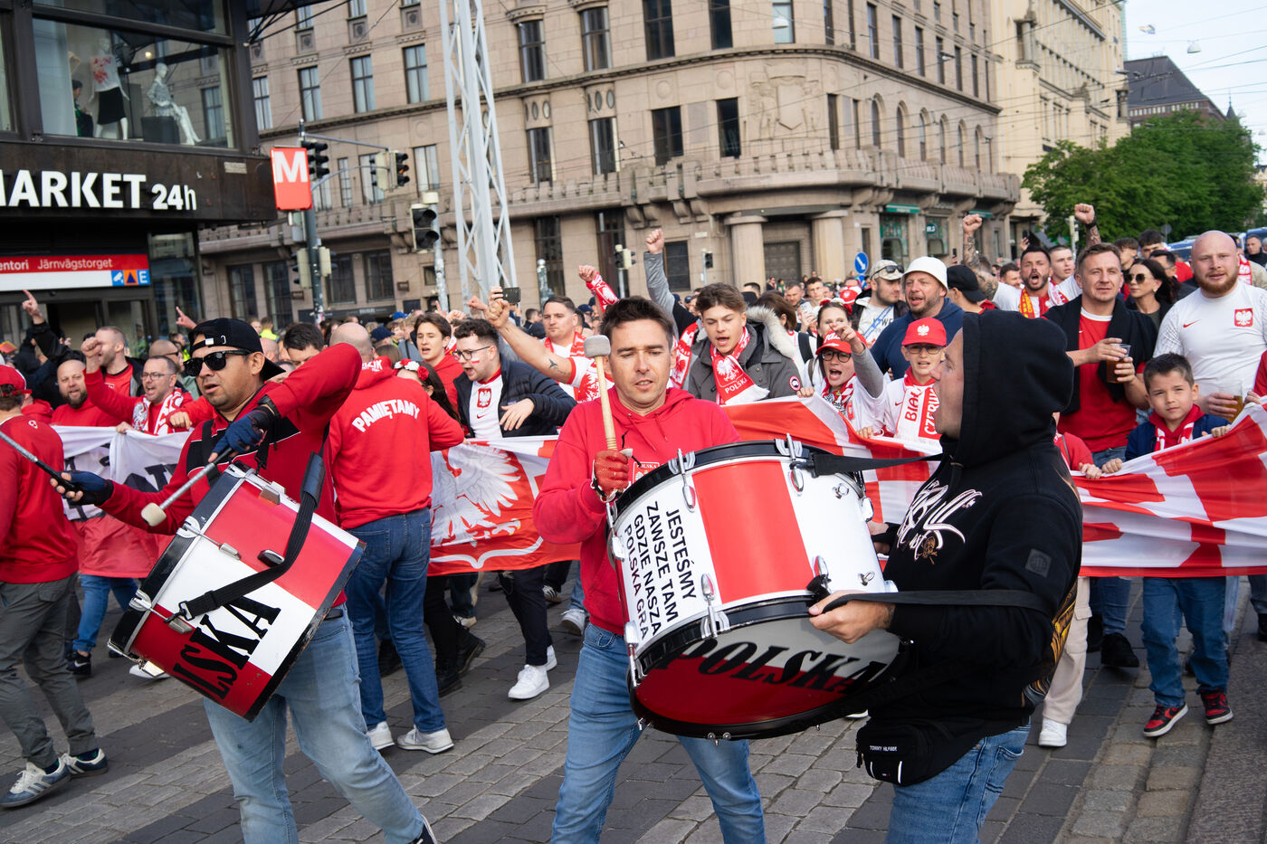 A crowd of football supporters from Poland march through the centre of Helsinki, Finland while they are heavily escorte by the police, on their way to the 2026 FIFA World Cup qualifying football match between Finland and Poland on June 10, 2025.