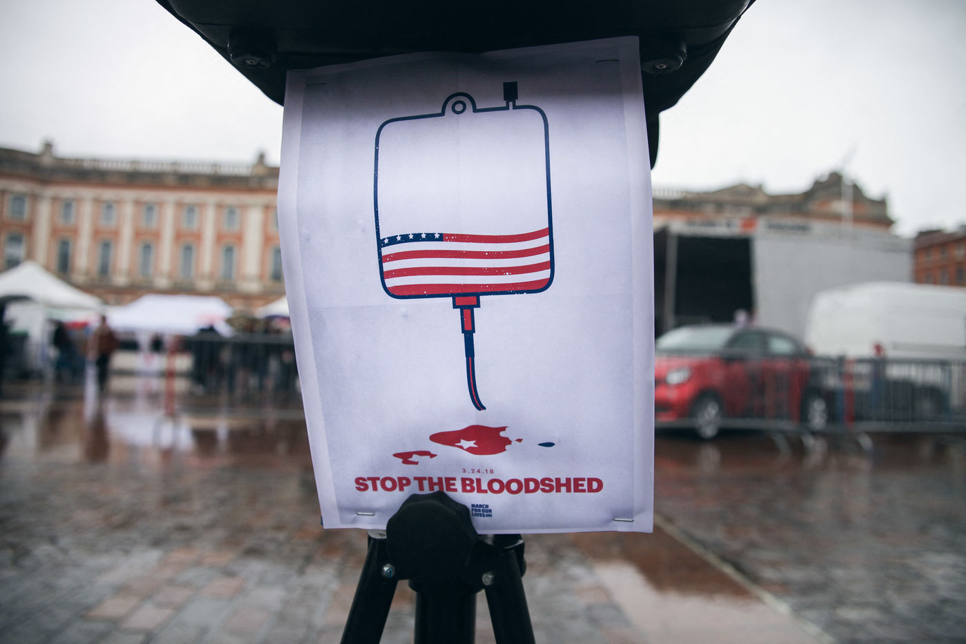 Toulouse, le 24 mars 2018. Plusieurs dizaines de personnes se sont rassemblées Place du Capitole avec des pancartes affichant leur refus des armes à feu. Ils ont suivis l'événement mondial "March for Our Lives", en réaction au massacre de 17 personnes perpétré le 14 février à Parkland, un lycée de Floride. Cet énième tuerie de masse a provoqué un soulèvement de l'opinion publique frustrée par l'inaction du législateur et des pouvoirs publics, apathiques face à la NRA (National Rifle Association) et le puissant lobby des armes. Les armes font plus de 30.000 morts par an aux Etats-Unis