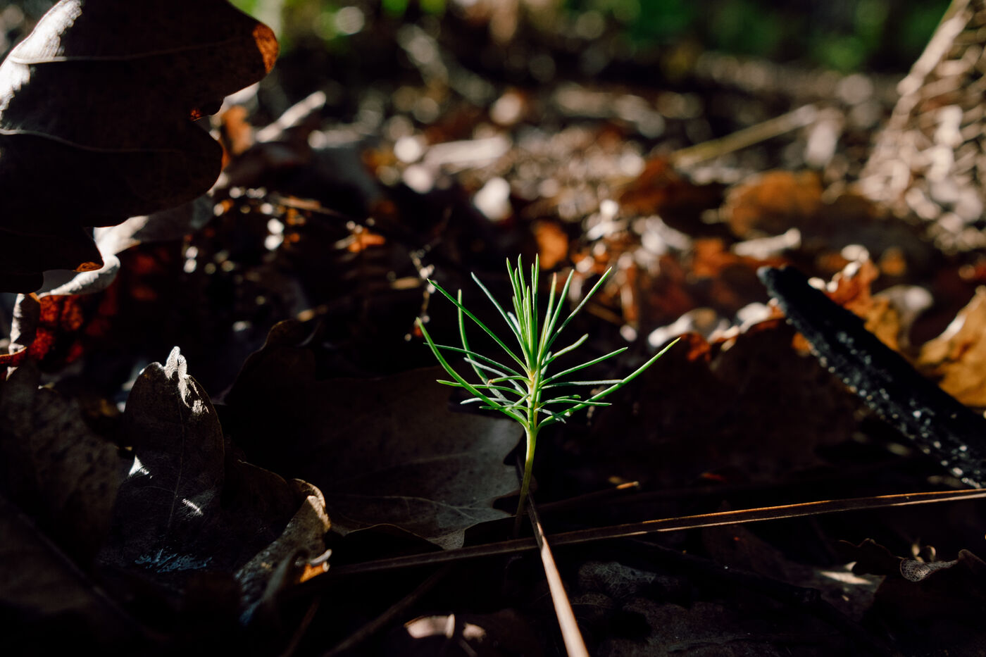 Après les incendies de cet été en Gironde, les stigmates du feu sont encore bien visibles. Lentement, la nature repend ses droits. Le gris poussiéreux de la terre est désormais colorié du vert des fougères. Un décor parfois lunaire et triste, mais teinté d'un espoir printanier.
