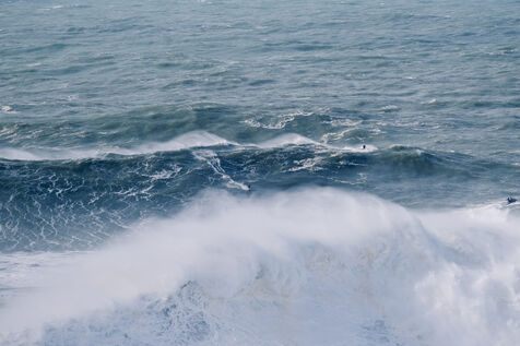 En Janvier 2025, à Nazaré, des surfeurs glissent sur les plus grosses vagues de la planète lors de cette houle géante.