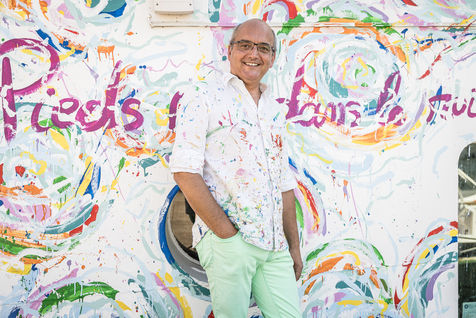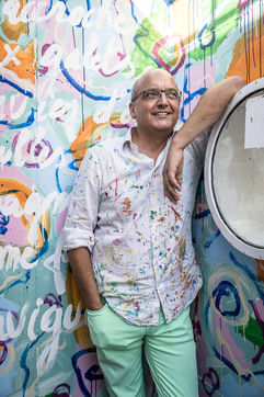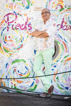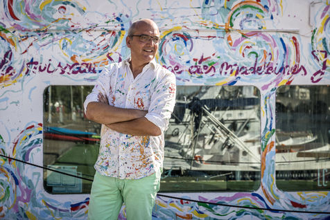 Namur, Belgique. 2022-07-19. Portrait de Christophe de Fierlant, peintre et poete, devant une fresque qu il realise sur un des bateaux de la Capitainerie de Namur, en bord de Meuse.