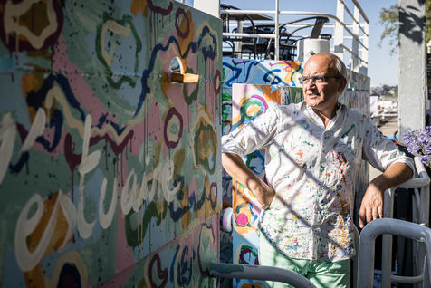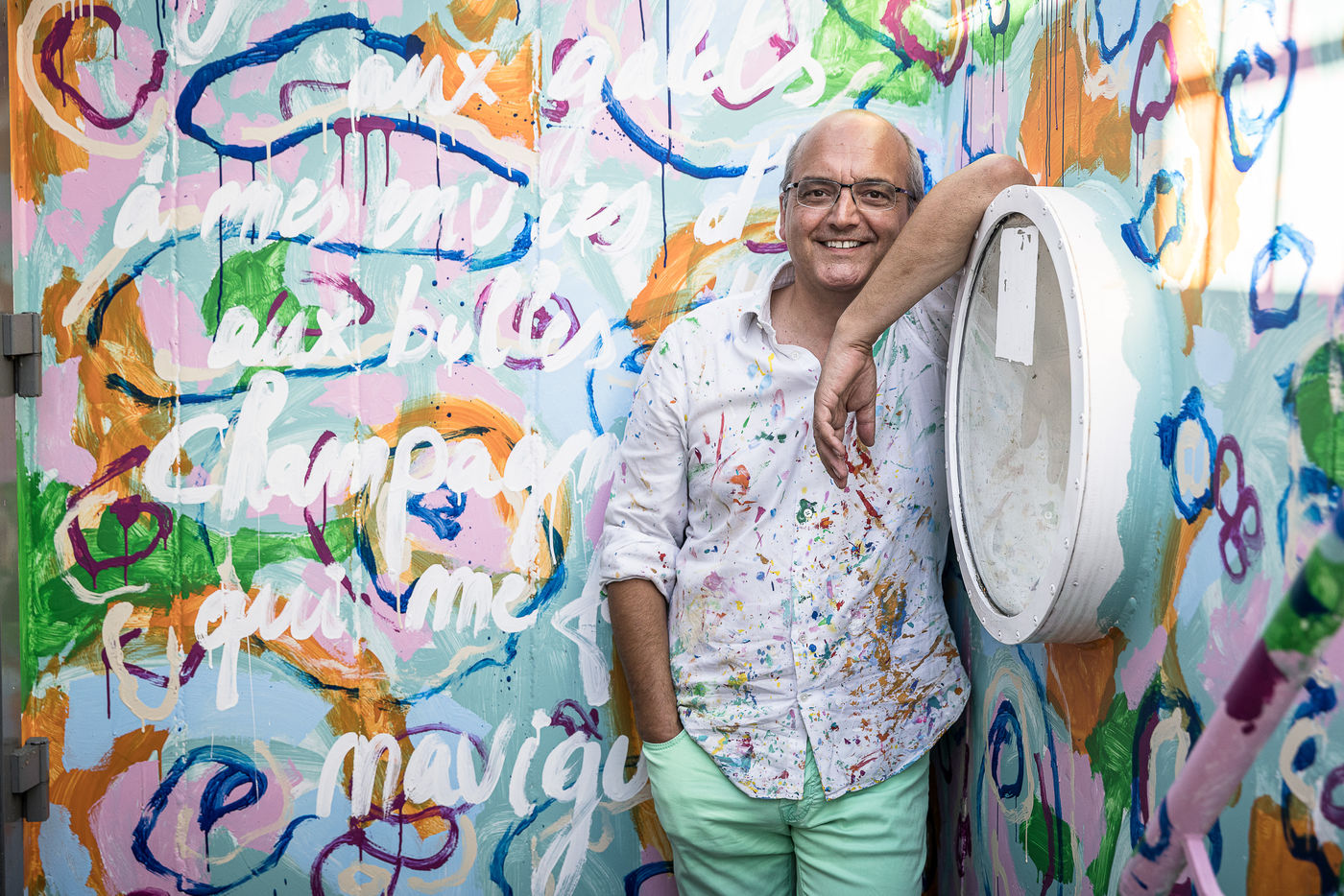 Namur, Belgium. 2022-07-19. Portrait of Christophe de Fierlant, painter and poet, in front of a wall fresco he made on one of the boats of the Namur Capitainerie, on the Meuse river.