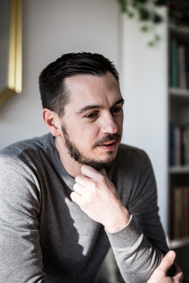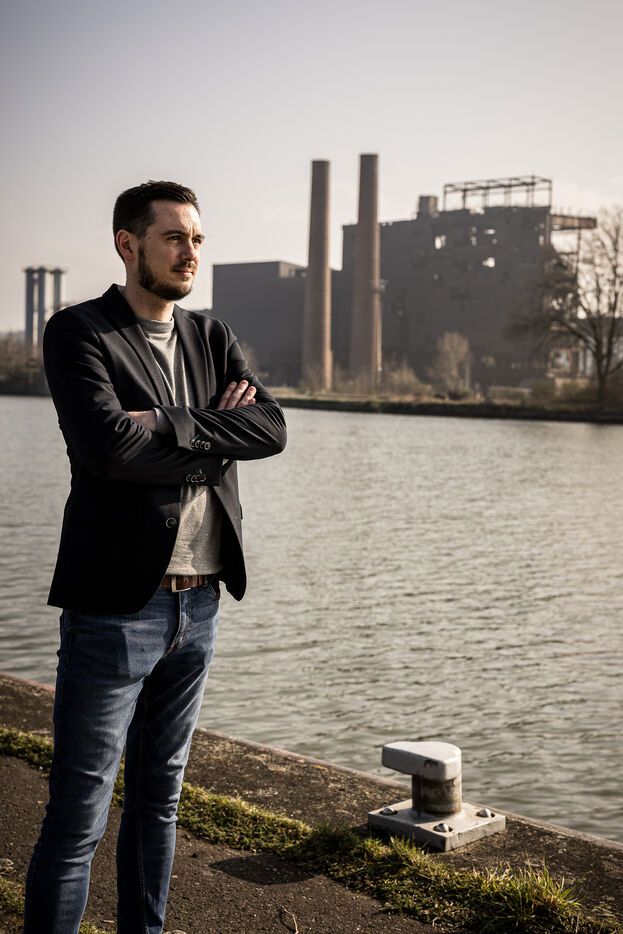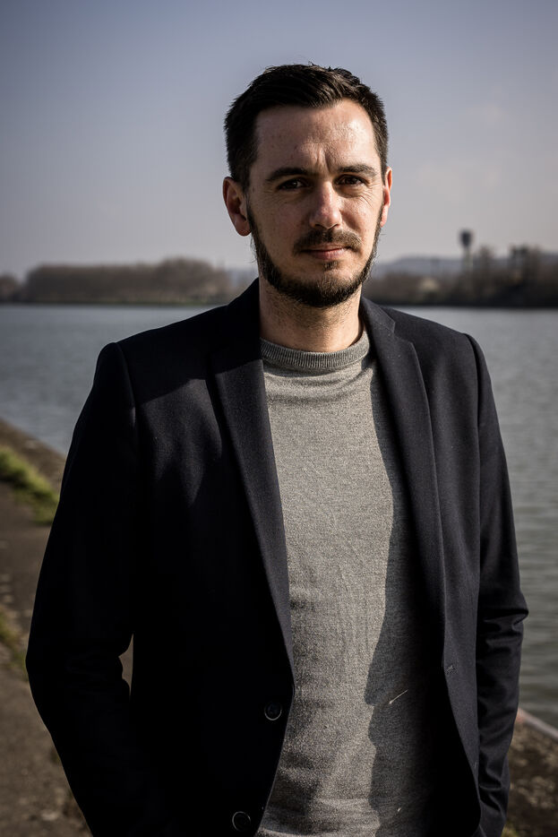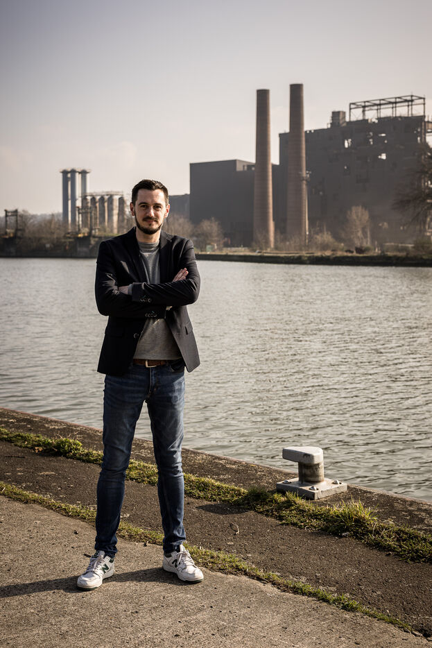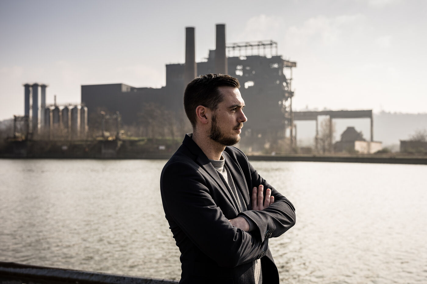 Herstal, Belgium. 2024-03-06. Portrait of Julien Liradelfo, deputy and member of the PTB. Photograph by Valentin Bianchi / Hans Lucas
