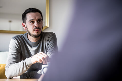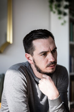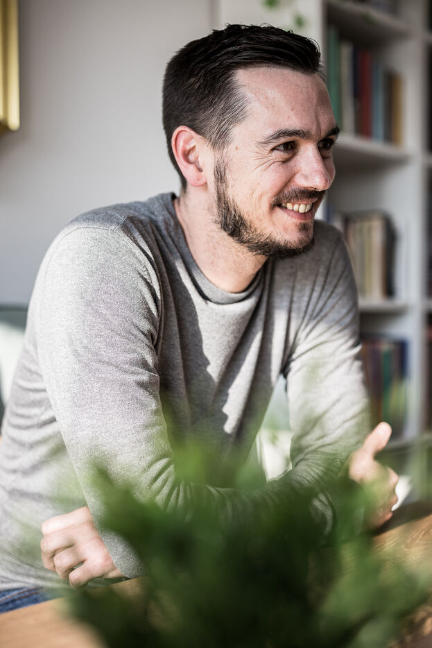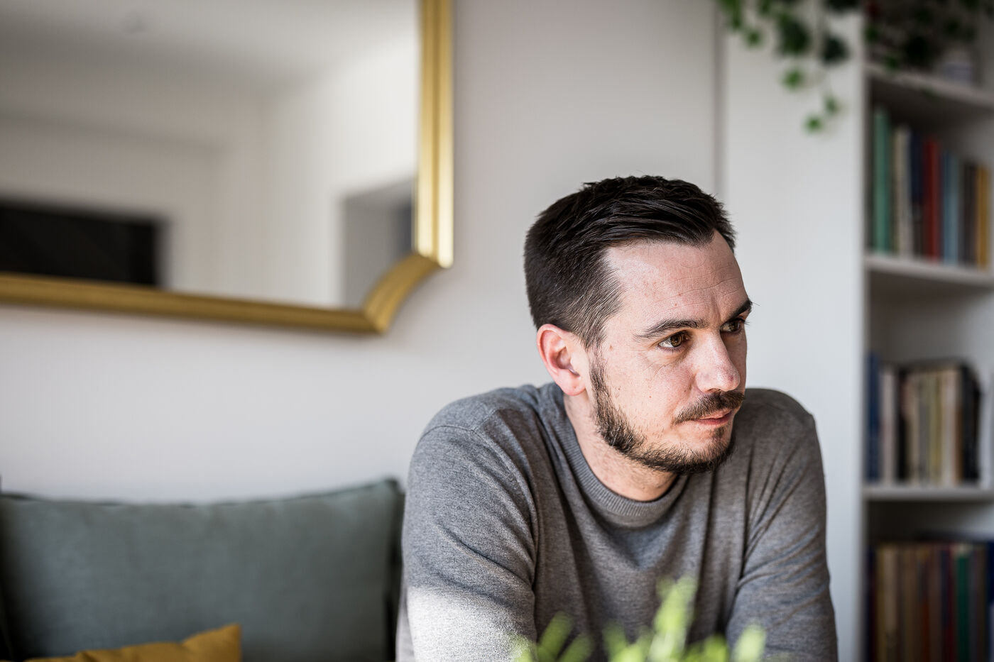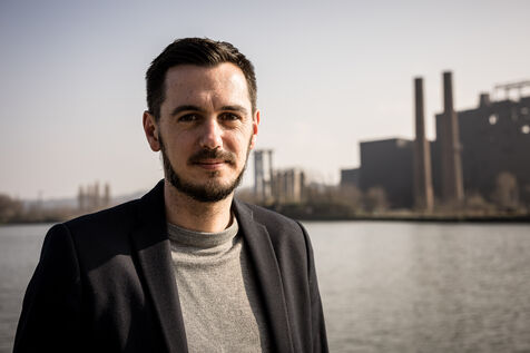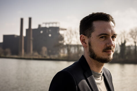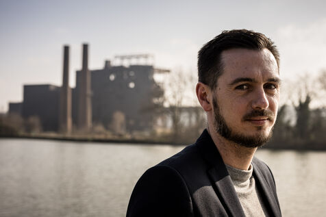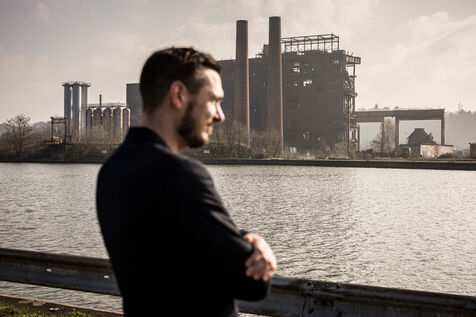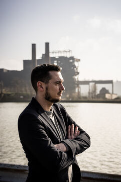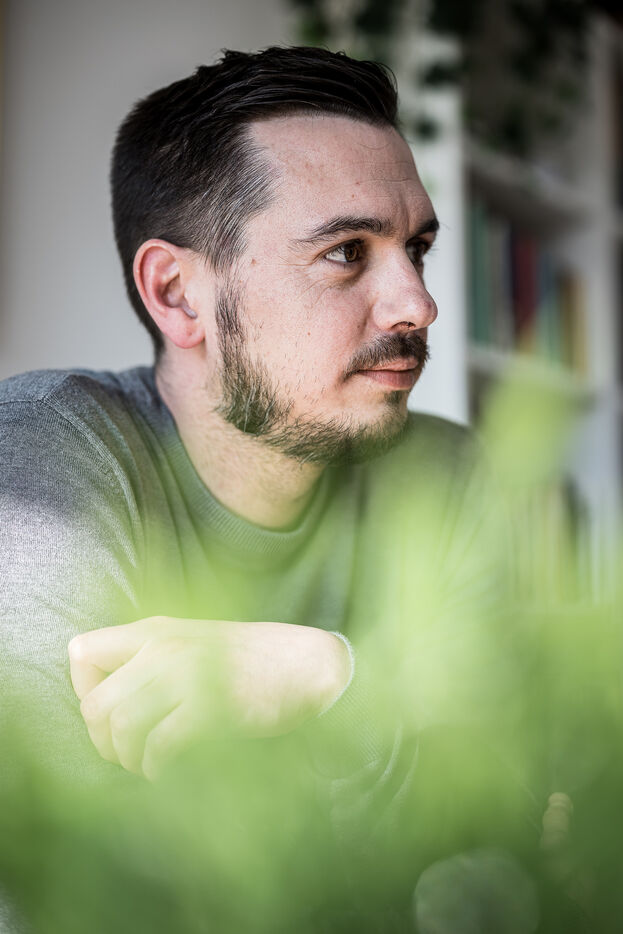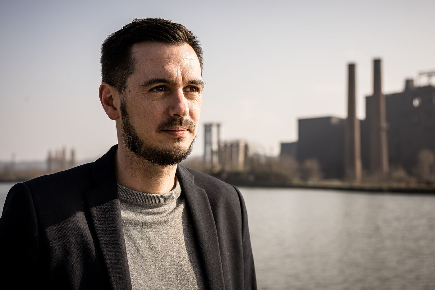 Herstal, Belgium. 2024-03-06. Portrait of Julien Liradelfo, deputy and member of the PTB. Photograph by Valentin Bianchi / Hans Lucas