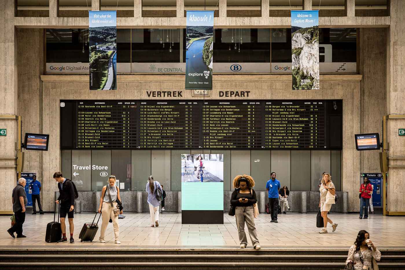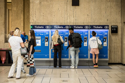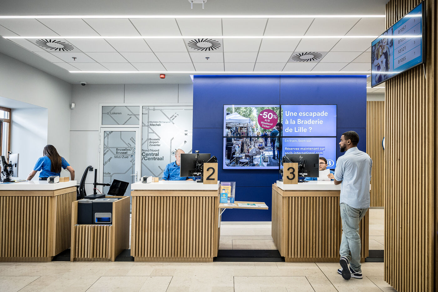 Dans les grandes gares de la capitale comme Gare Centrale ou Gare du Midi, les guichets de la SNCB commencent aussi a se fermer, remplaces par des Travel Store et des bornes automatiques a Bruxelles, Belgique, 20 Aout 2025.