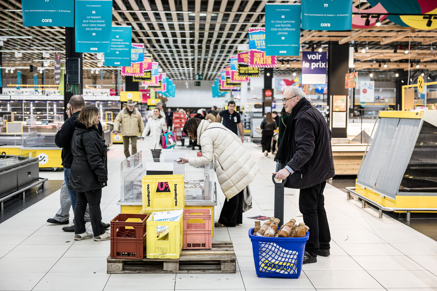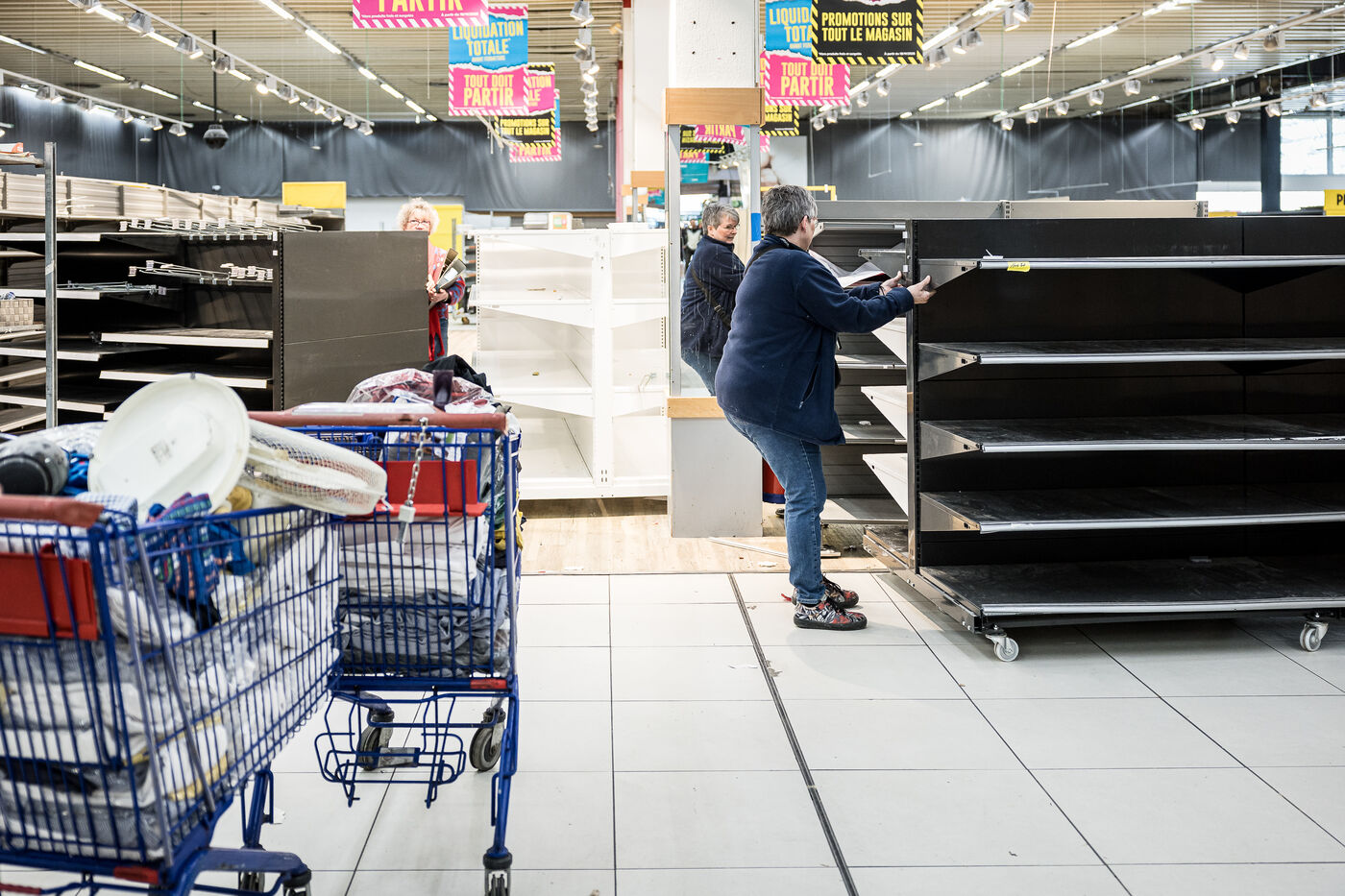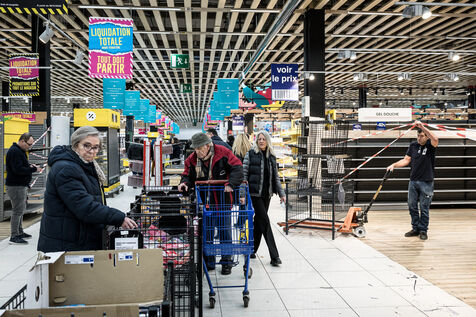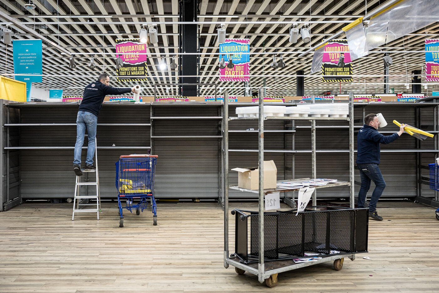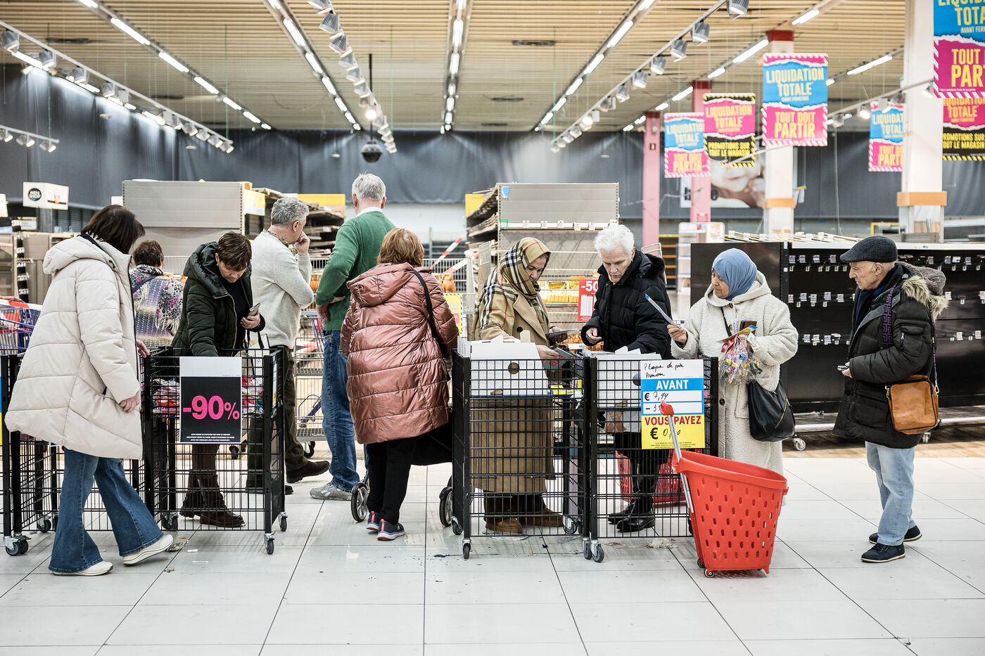 After more than 50 years, the Cora hypermarket is closing its doors for good. A few customers come to clear out what remains on the shelves, while only a handful of employees are still present before the announcement of the closure in Rocourt, Belgium, January 30, 2026.