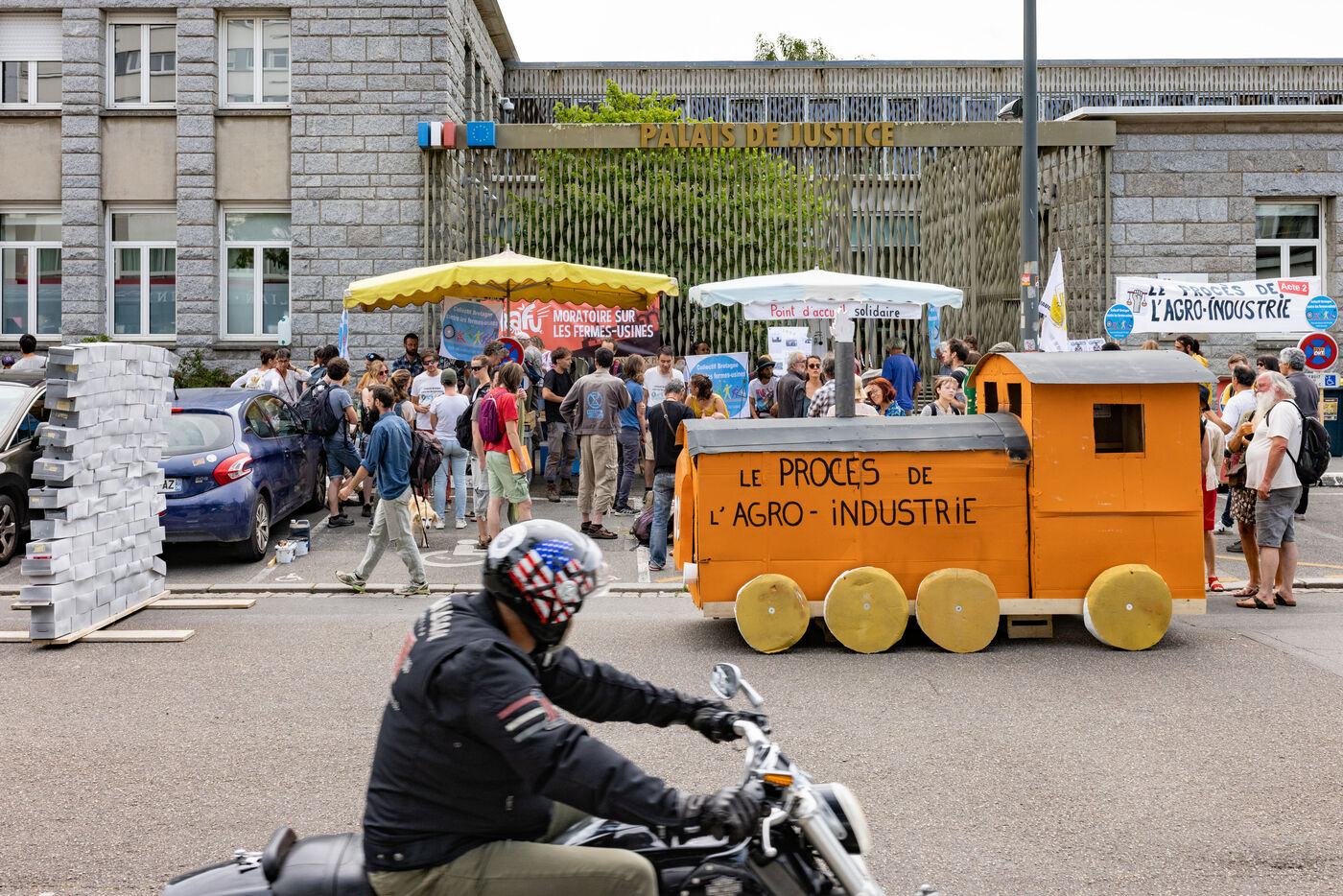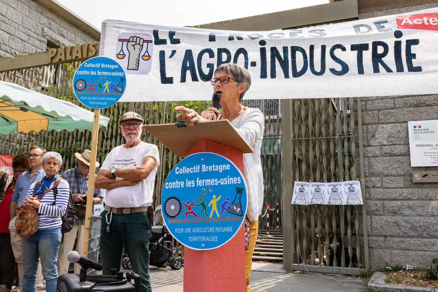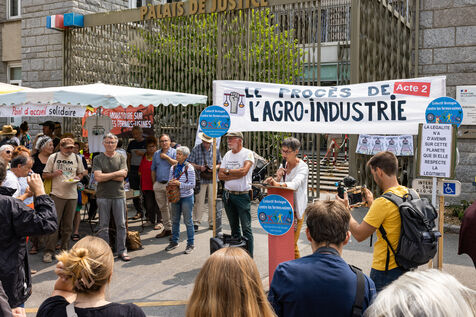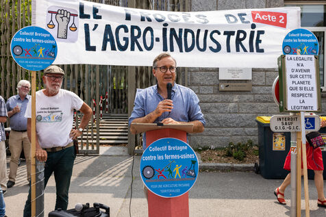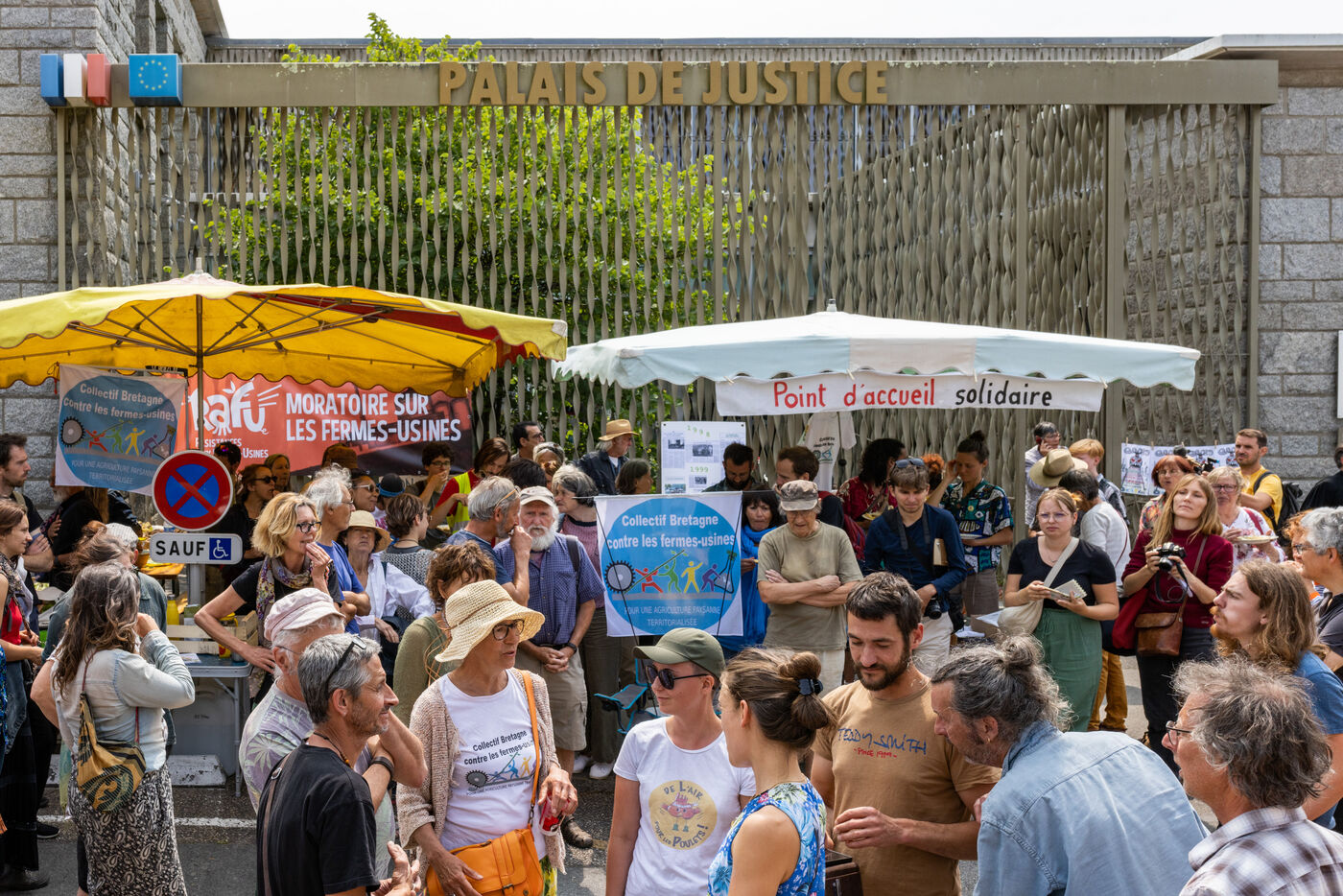 Support gathering for the indictment of environmental activists for blocking a fret train organized by the collective Bretagne against industrial farms in front of the legal tribunal of Lorient. Indictees are charging for stopping and emptying the cereals destined for the agribusiness of a fret train in march 2022, an action meant to denounce the harmful environnemental impact of the industrial farming in Bretagne.