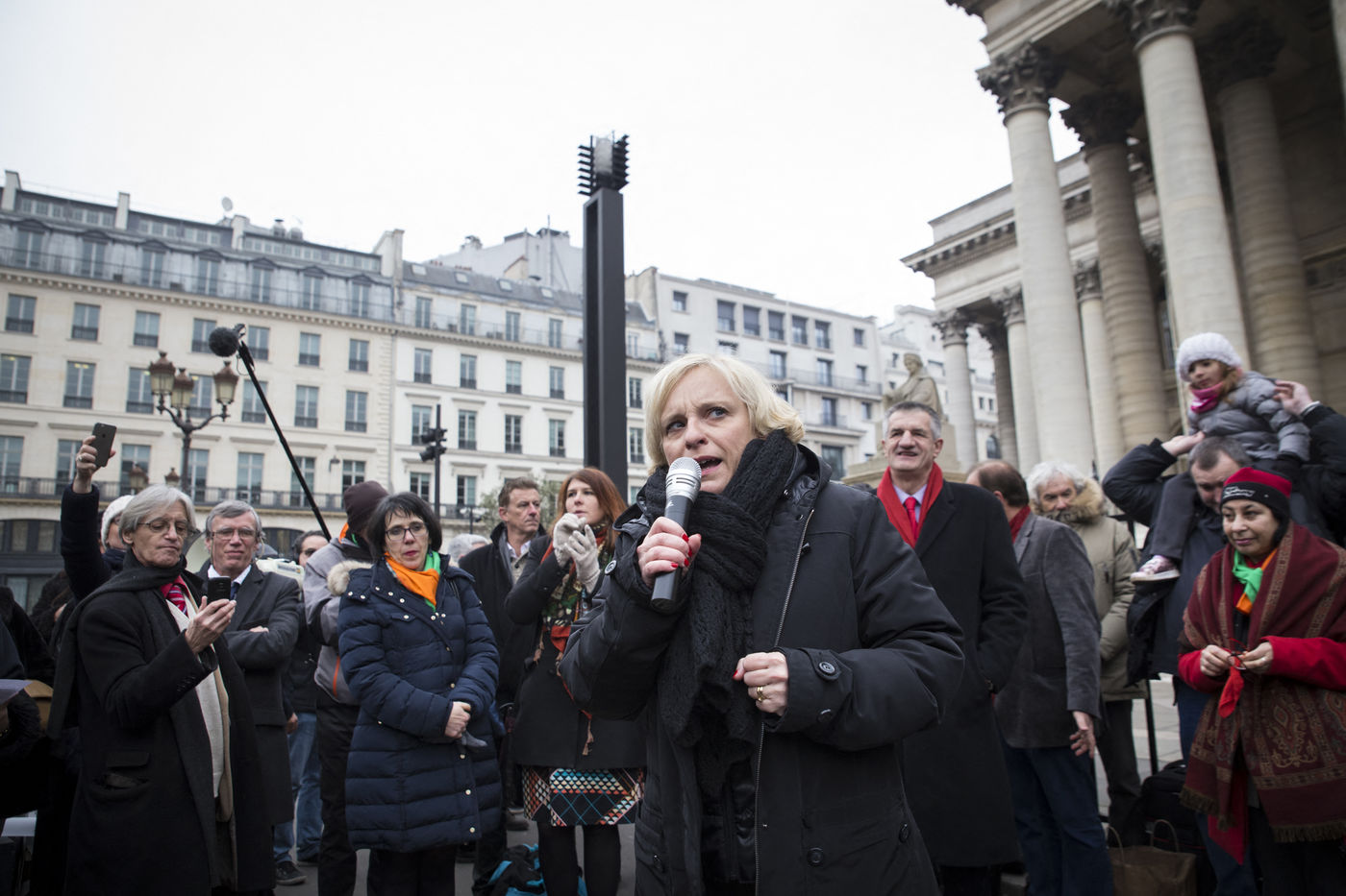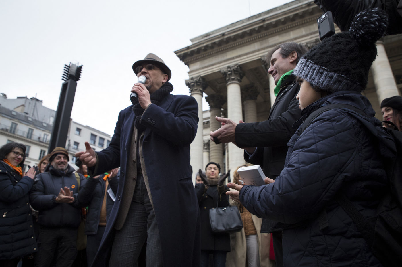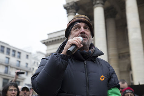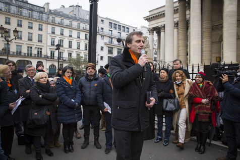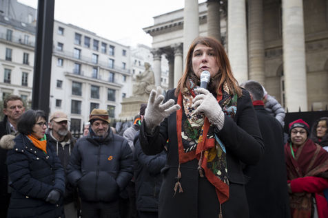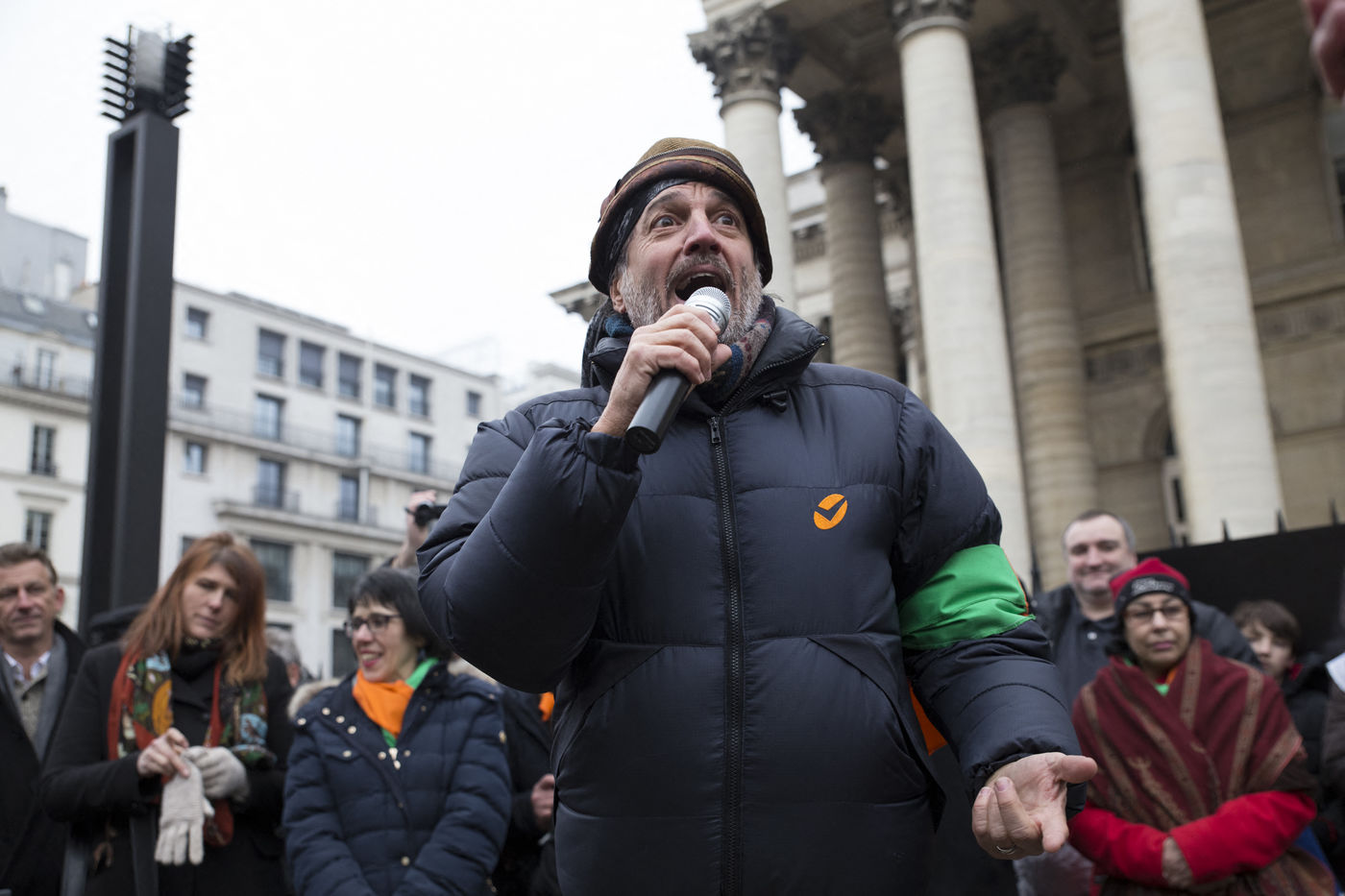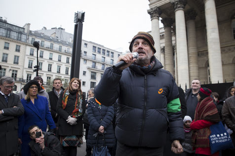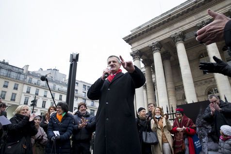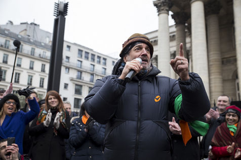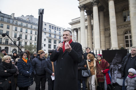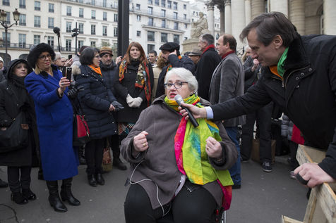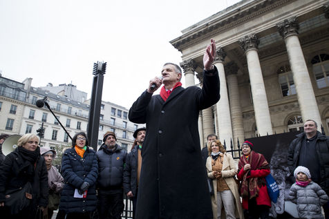 France, Paris, February 11, 2017. The alternative movement 100% is preparing for the next electoral events. After the designation of a presidential candidate, by means of an open primary on the internet, the eco-citizen movement "100%" was officially launched this Saturday during a gathering at Place de la Bourse in Paris. In the presence of the singer Francis Lalanne, co-president of the movement, the deputy of the Pyrénées-Atlantiques Jean Lassalle and the presidential candidate Charlotte Marchandise. 28 citizen and environmentalist political movements have decided to join forces to propose an alternative to outdated parties and extremes.