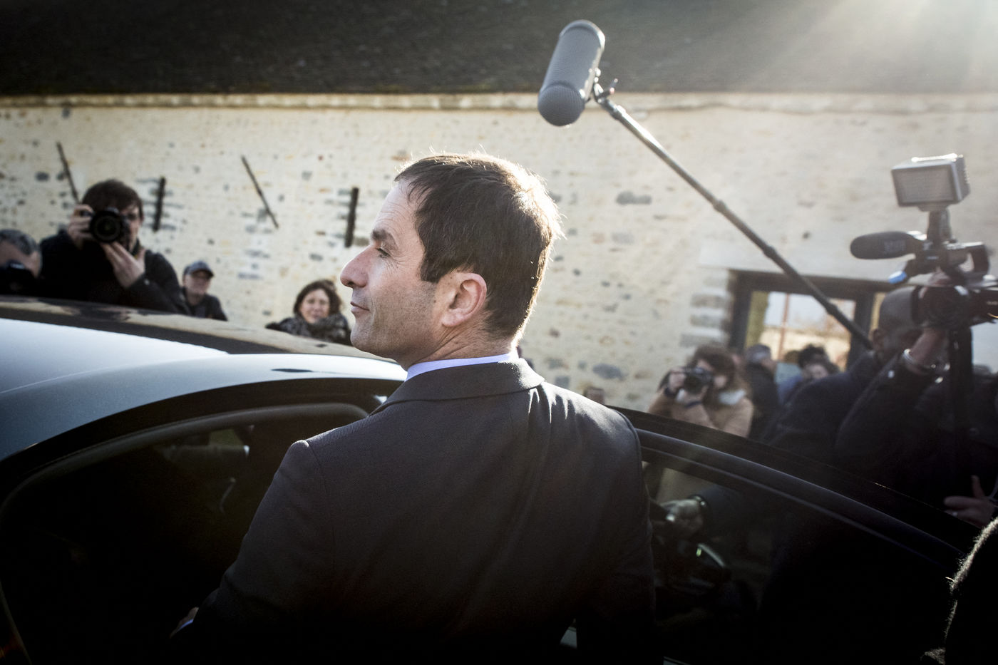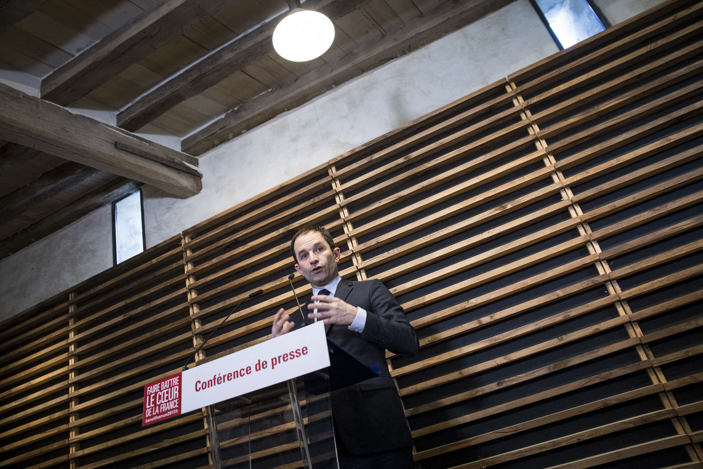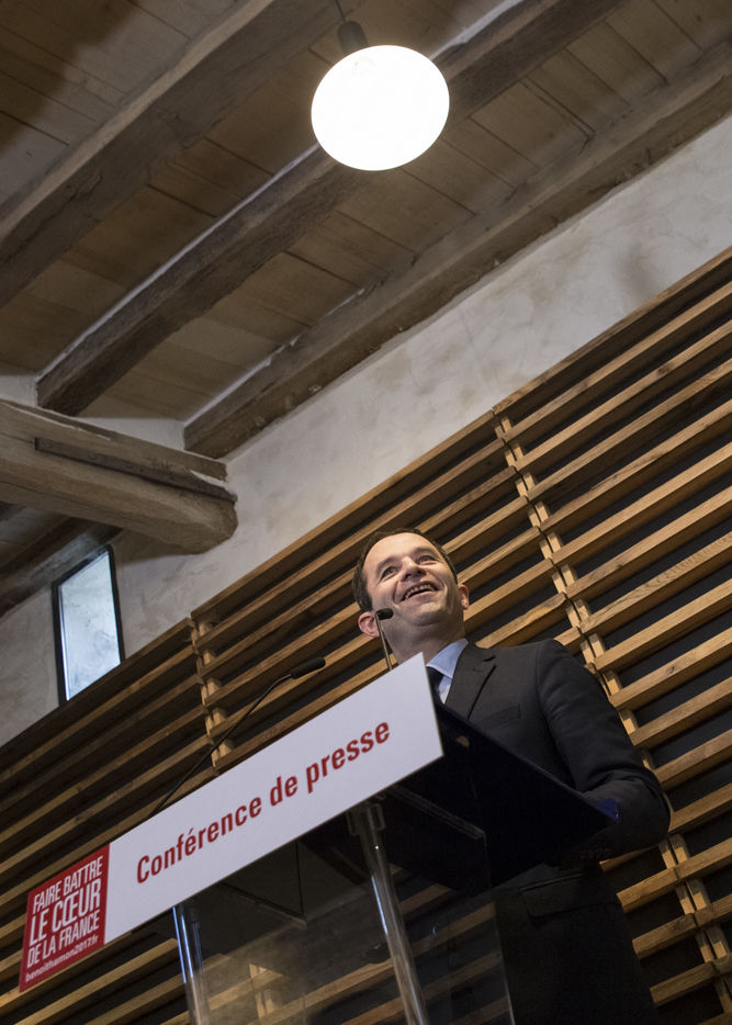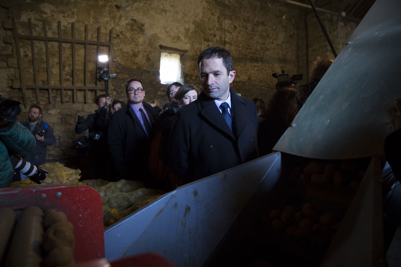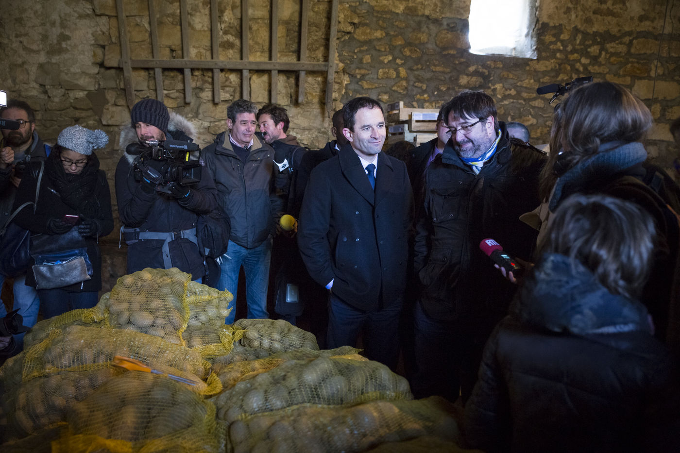 France, Chatenoy (77), le 13 fevrier 2017. Deplacement en Seine-et-Marne, du candidat PS a l election présidentielle Benoit HAMON, pour visiter la ferme bio autonome de Carine et Simon THIERRY. Le candidat livre ensuite ses 10 propositions pour l'alimentation lors d'une conférence de presse. Chatenoy, France, le 13 Fevrier 2017.