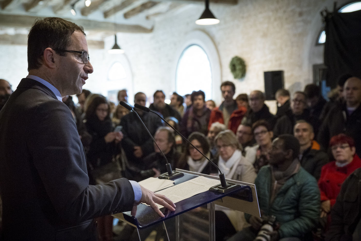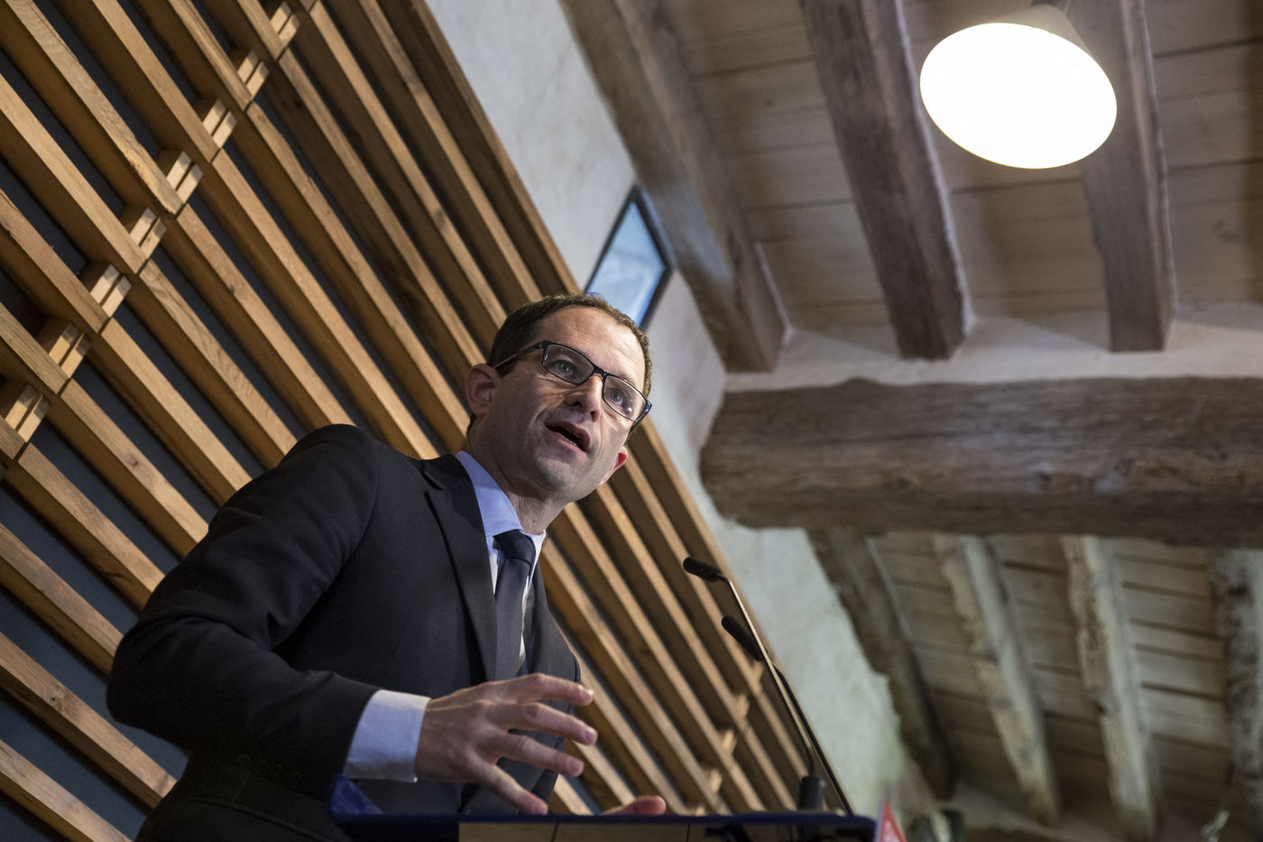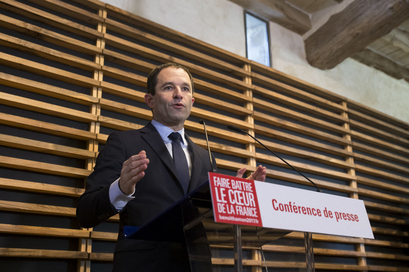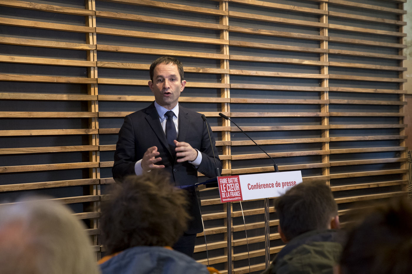France, Chatenoy (77), le 13 fevrier 2017. Deplacement en Seine-et-Marne, du candidat PS a l election présidentielle Benoit HAMON, pour visiter la ferme bio autonome de Carine et Simon THIERRY. Le candidat livre ensuite ses 10 propositions pour l'alimentation lors d'une conférence de presse. Chatenoy, France, le 13 Fevrier 2017.