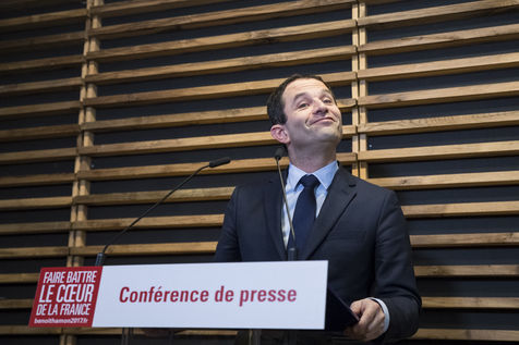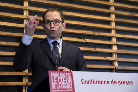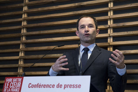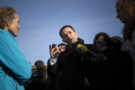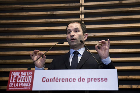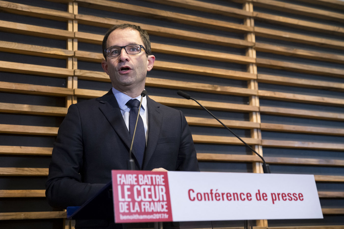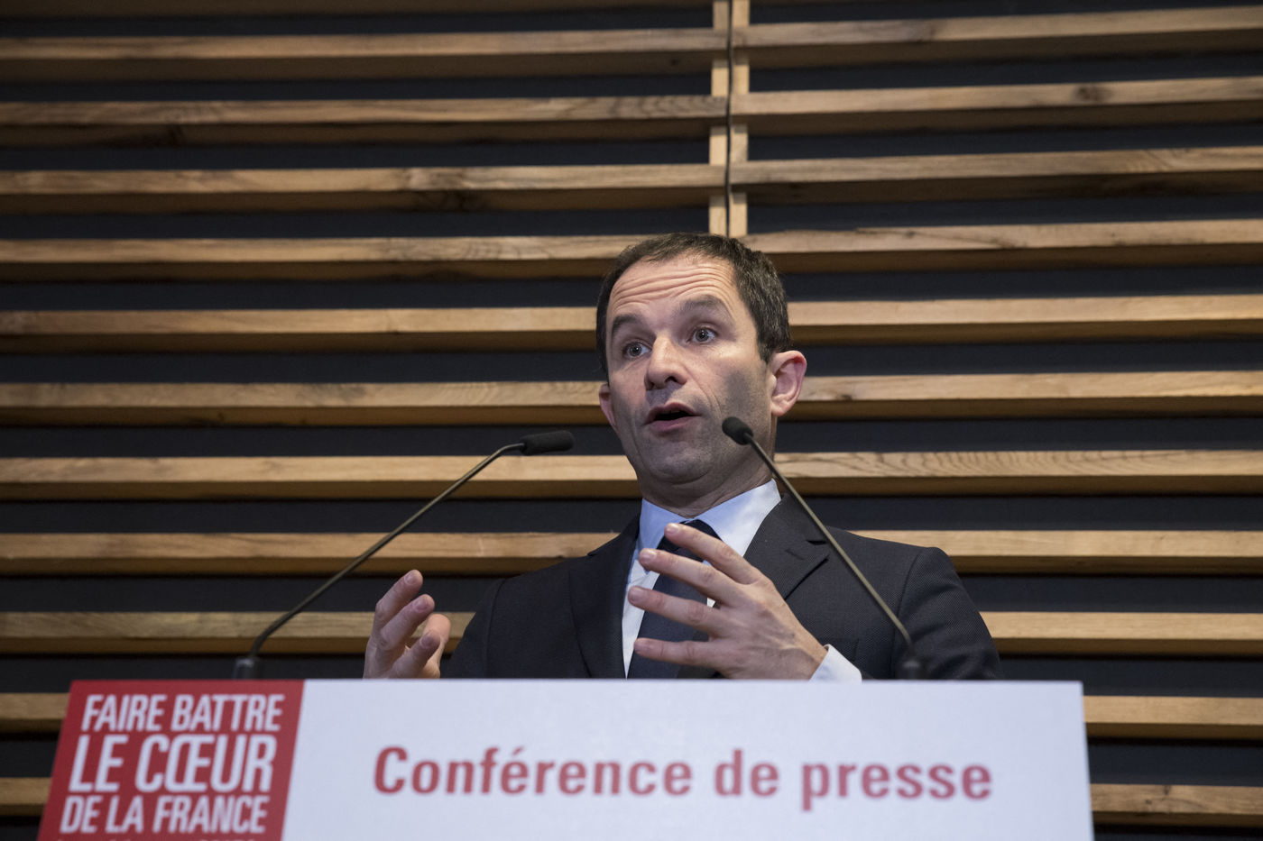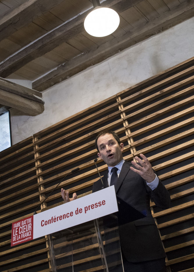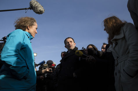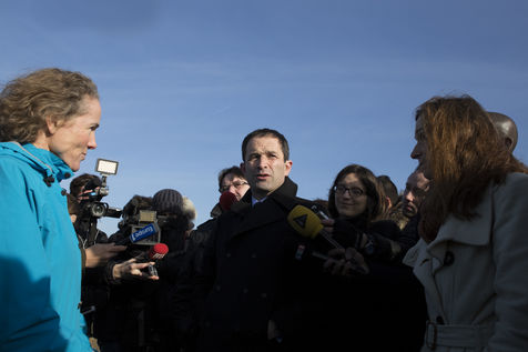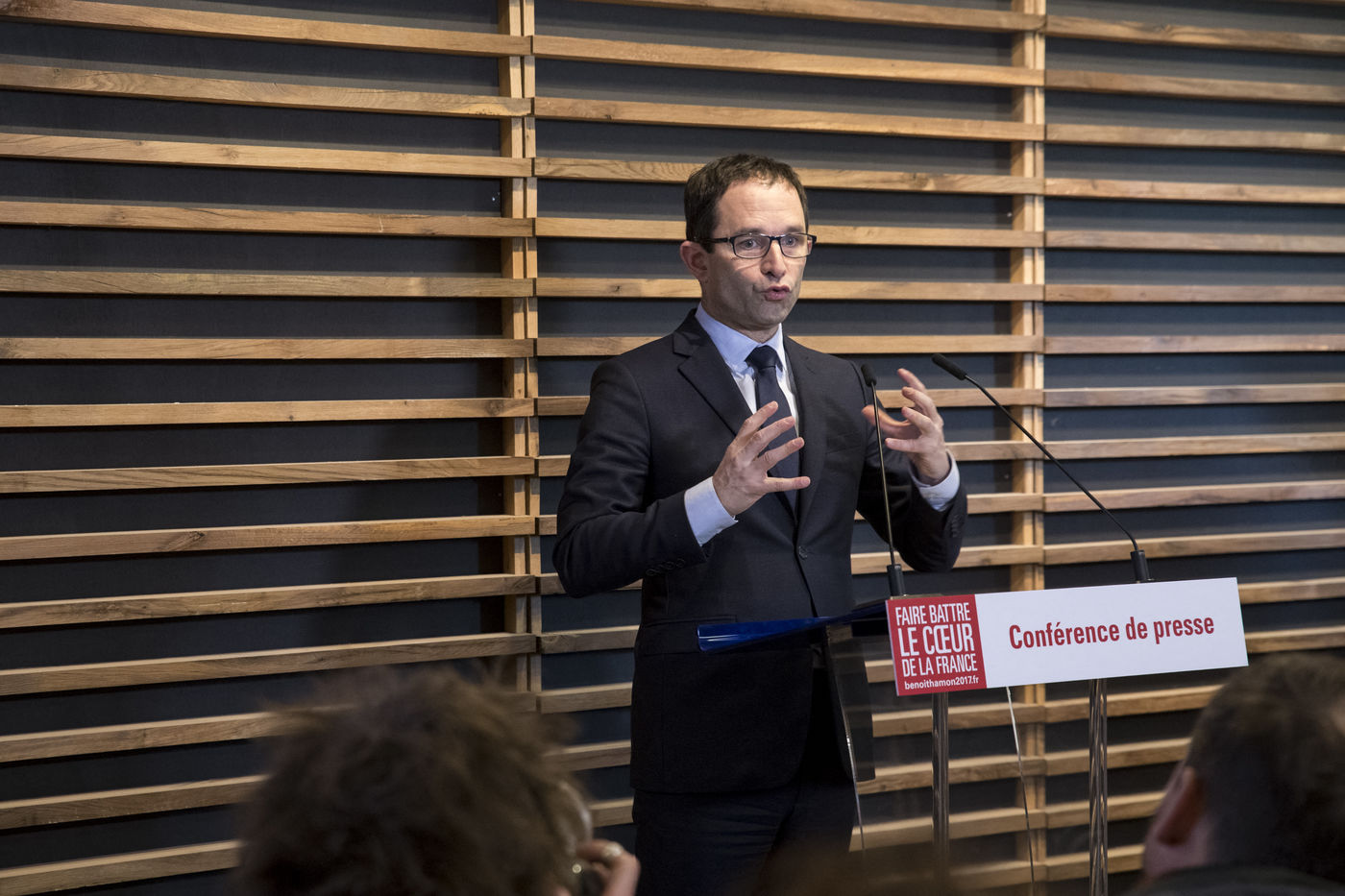 France, Chatenoy (77), le 13 fevrier 2017. Deplacement en Seine-et-Marne, du candidat PS a l election présidentielle Benoit HAMON, pour visiter la ferme bio autonome de Carine et Simon THIERRY. Le candidat livre ensuite ses 10 propositions pour l'alimentation lors d'une conférence de presse. Chatenoy, France, le 13 Fevrier 2017.