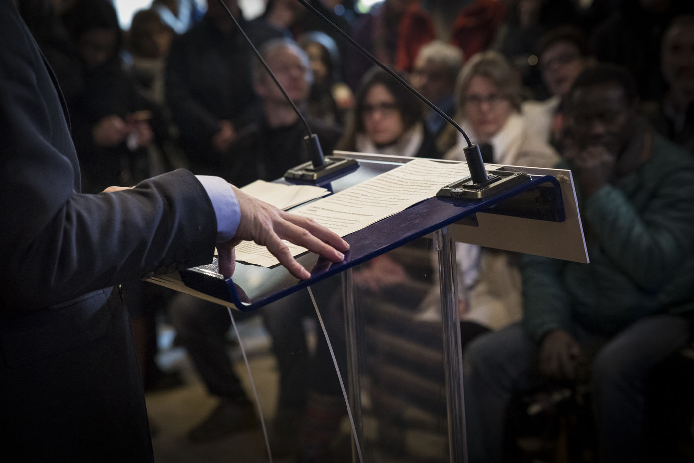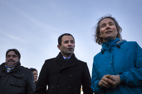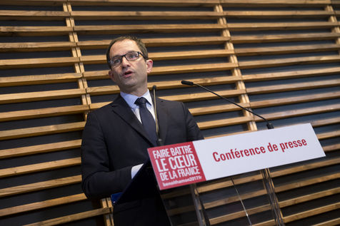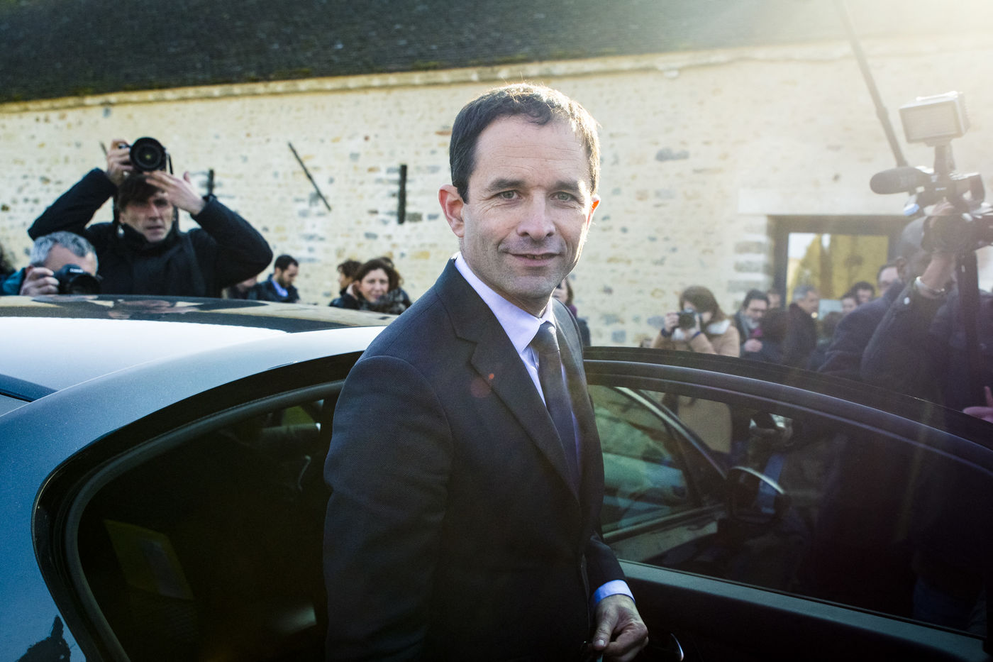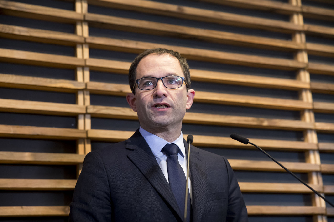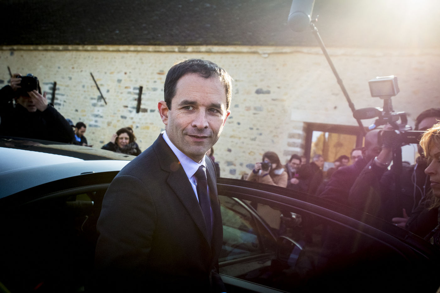 France, Chatenoy (77), le 13 fevrier 2017. Deplacement en Seine-et-Marne, du candidat PS a l election présidentielle Benoit HAMON, pour visiter la ferme bio autonome de Carine et Simon THIERRY. Le candidat livre ensuite ses 10 propositions pour l'alimentation lors d'une conférence de presse. Chatenoy, France, le 13 Fevrier 2017.
