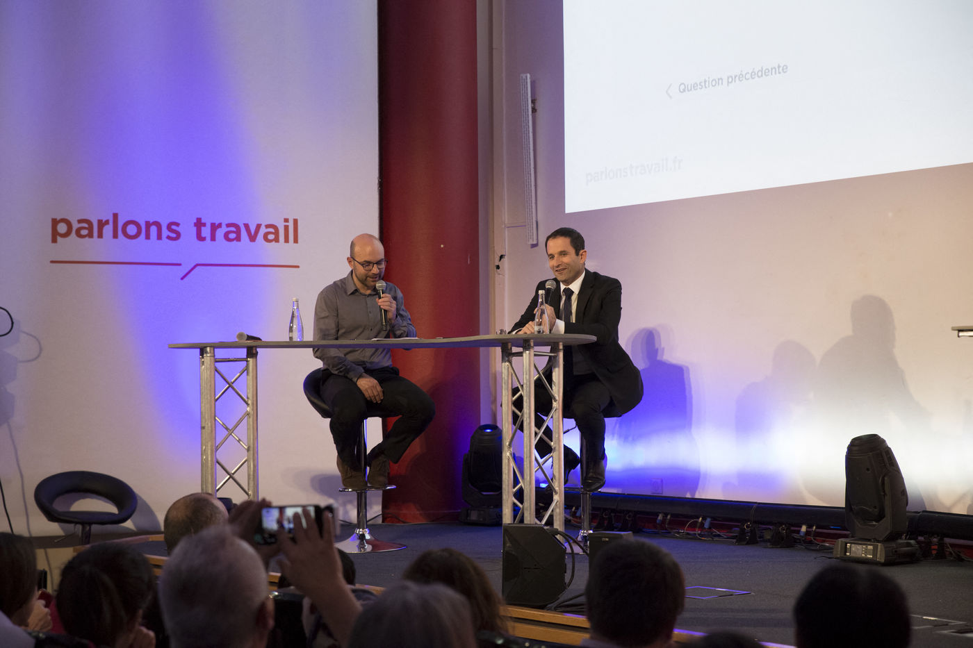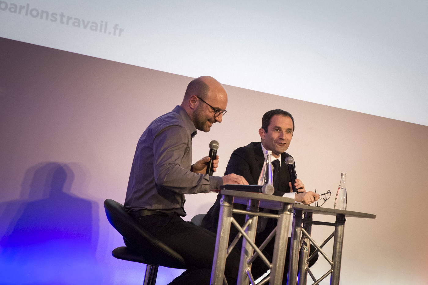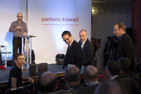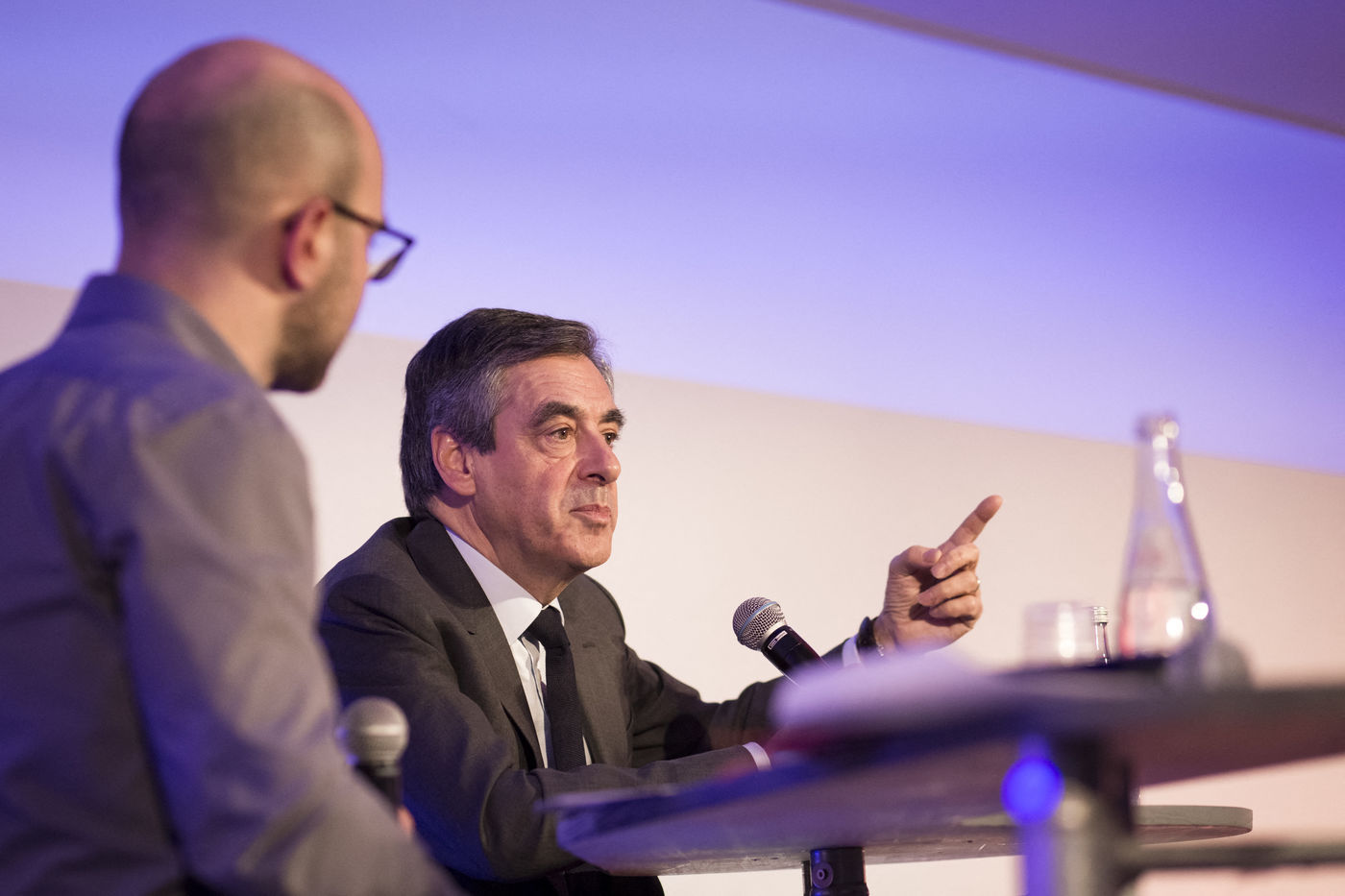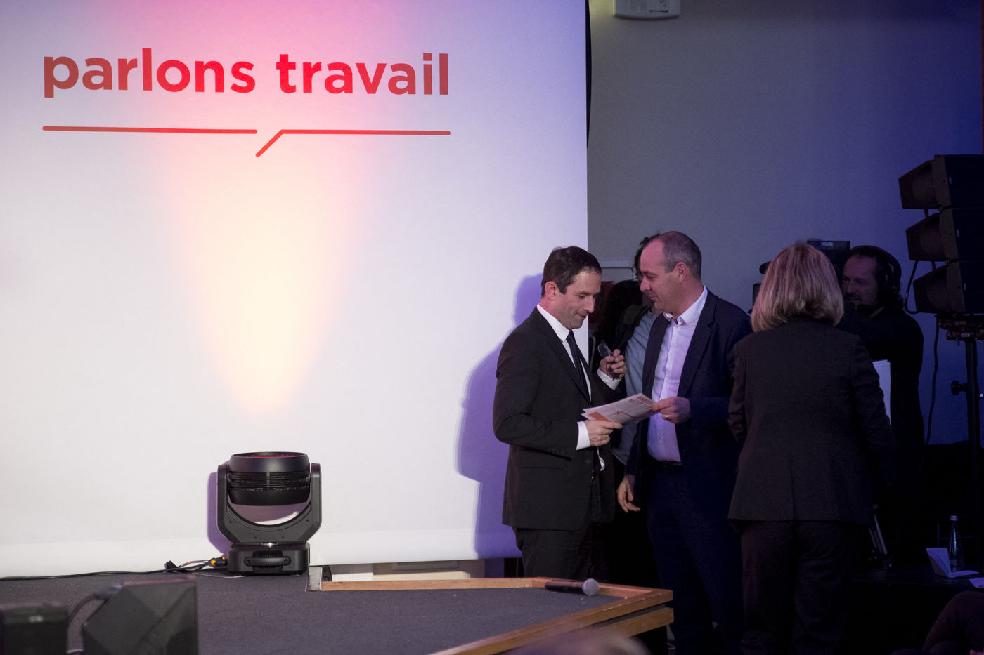 CFDT headquarters, Paris, France. On the occasion of the restitution of the results of its survey "Let's talk about work", the CFDT had invited 3 presidential candidates to come and debate on this theme. Benoit Hamon (PS), François Fillon (LR) and Alexis Corbière representing Jean-Luc Mélenchon for the occasion.