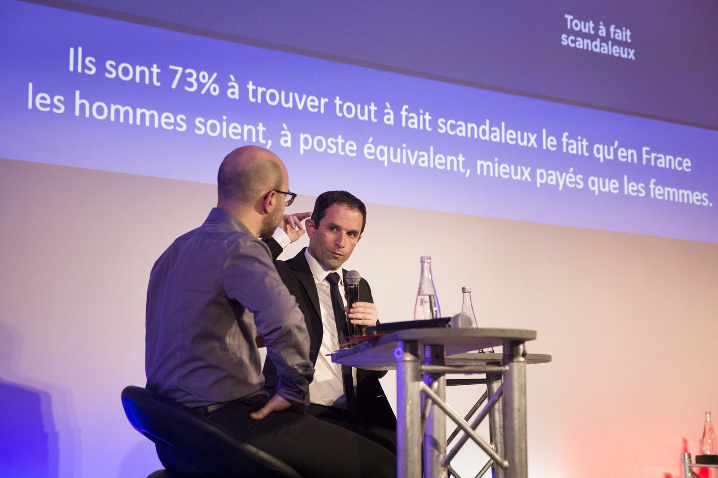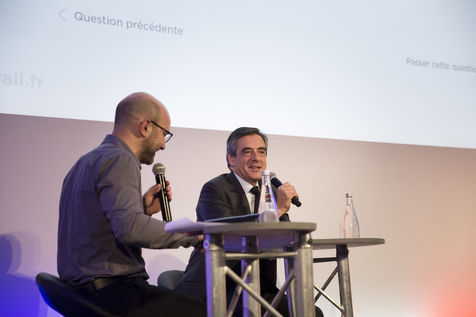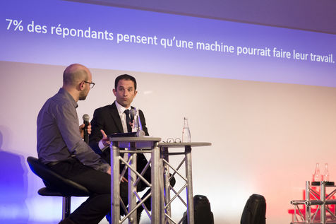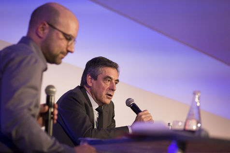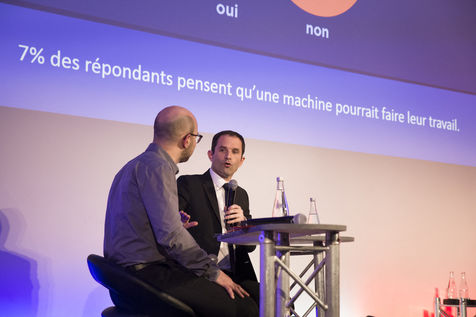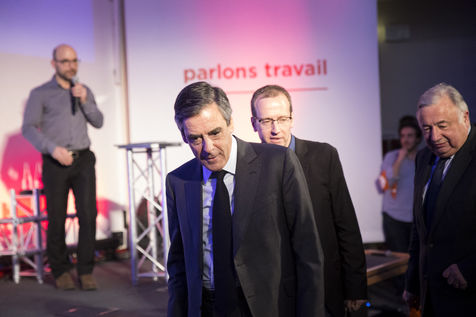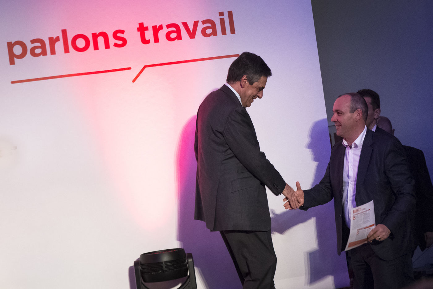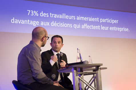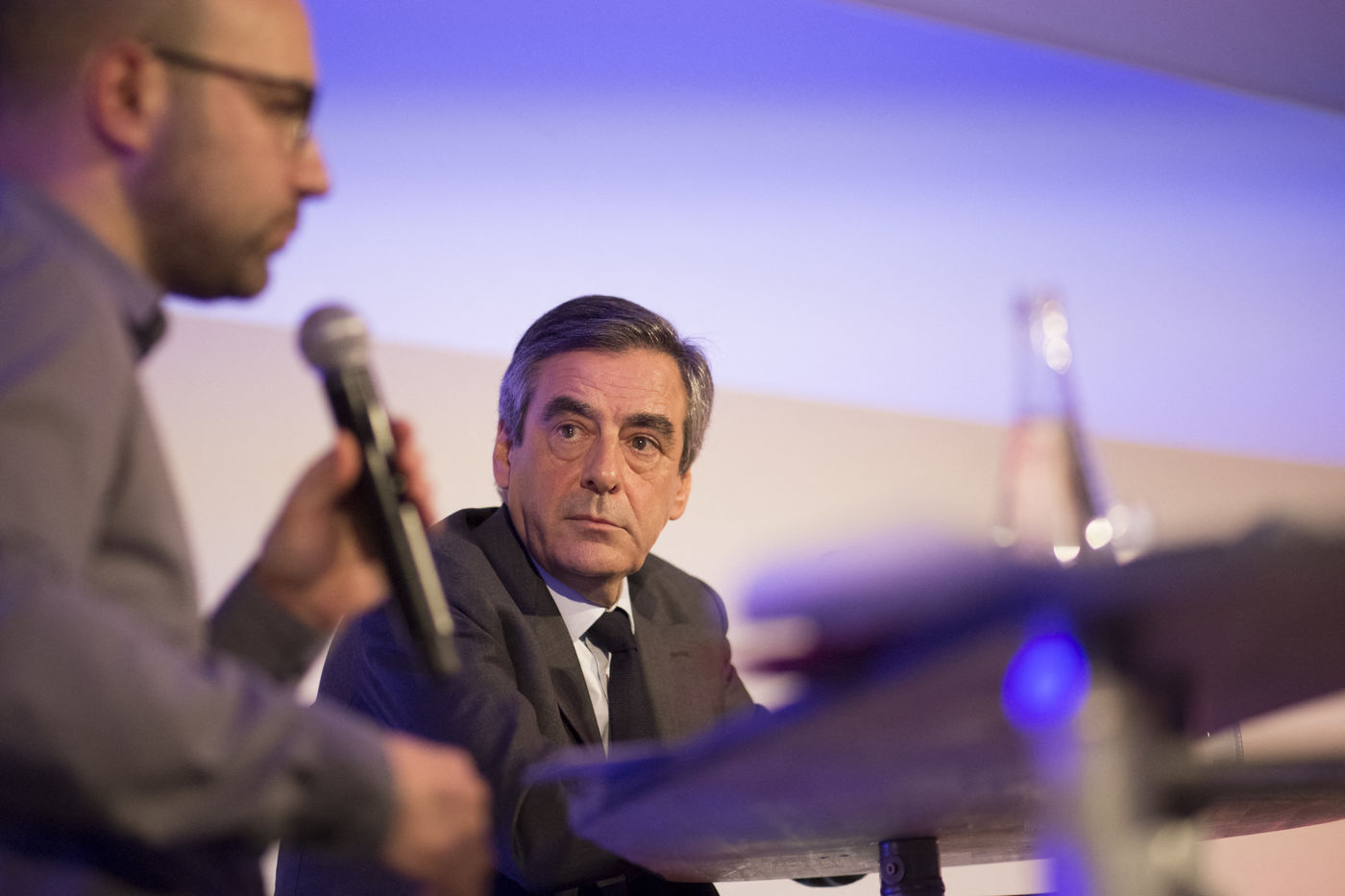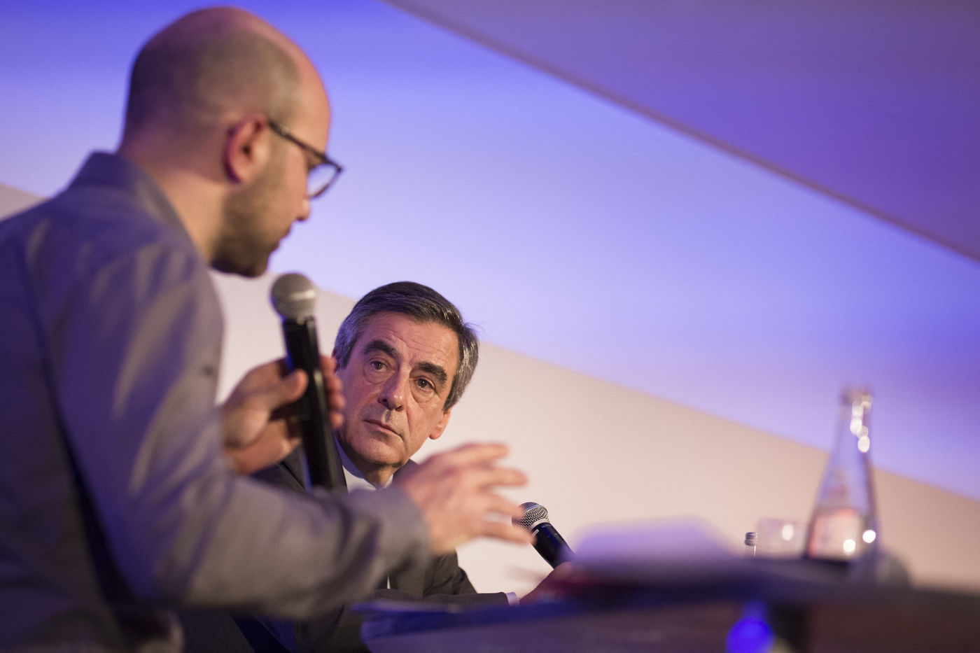 CFDT headquarters, Paris, France. On the occasion of the restitution of the results of its survey "Let's talk about work", the CFDT had invited 3 presidential candidates to come and debate on this theme. Benoit Hamon (PS), François Fillon (LR) and Alexis Corbière representing Jean-Luc Mélenchon for the occasion.