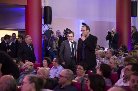 Siège de la CFDT, Paris, France. A l'occasion de la restitution des résultats de son enquète "Parlons travail", la CFDT avait invité 3 candidats à la présidentielle à venir debattre sur ce thème. Benoit Hamon (PS), François Fillon (LR) et Alexis Corbière représentant Jean-Luc Mélenchon pour l'occasion.