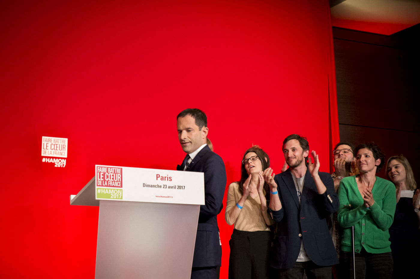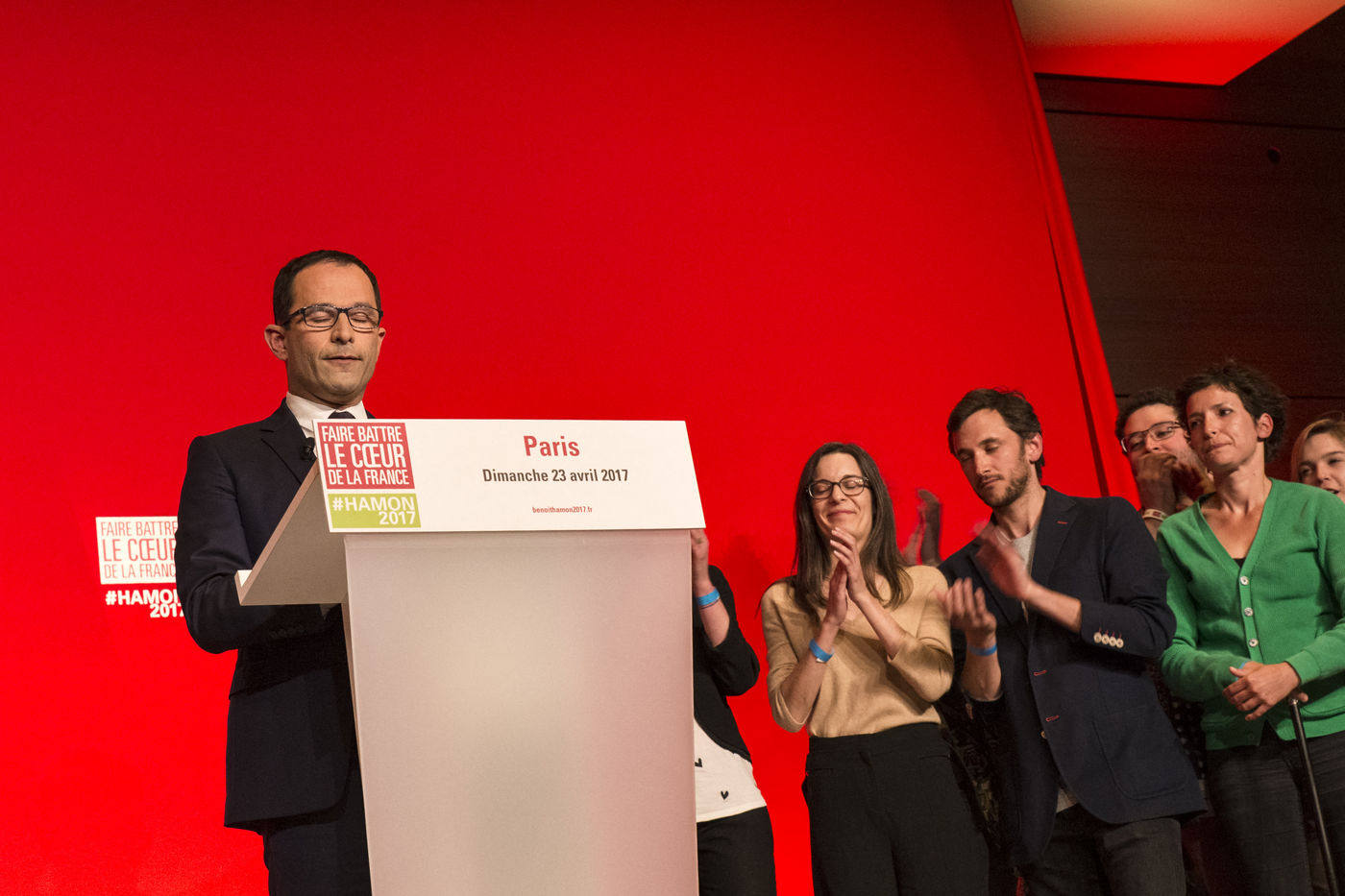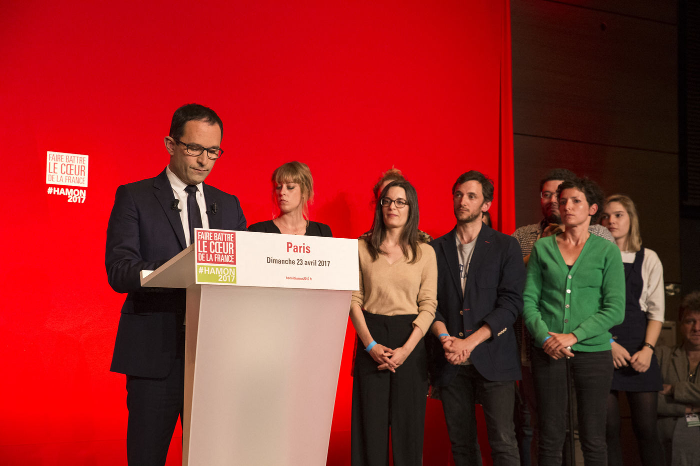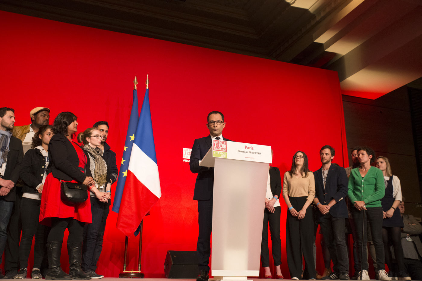 Maison de la Mutualite, Paris, France, April 23, 2017. First round of the presidential election: Electoral evening in the camp of Benoit Hamon.