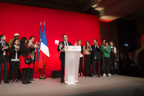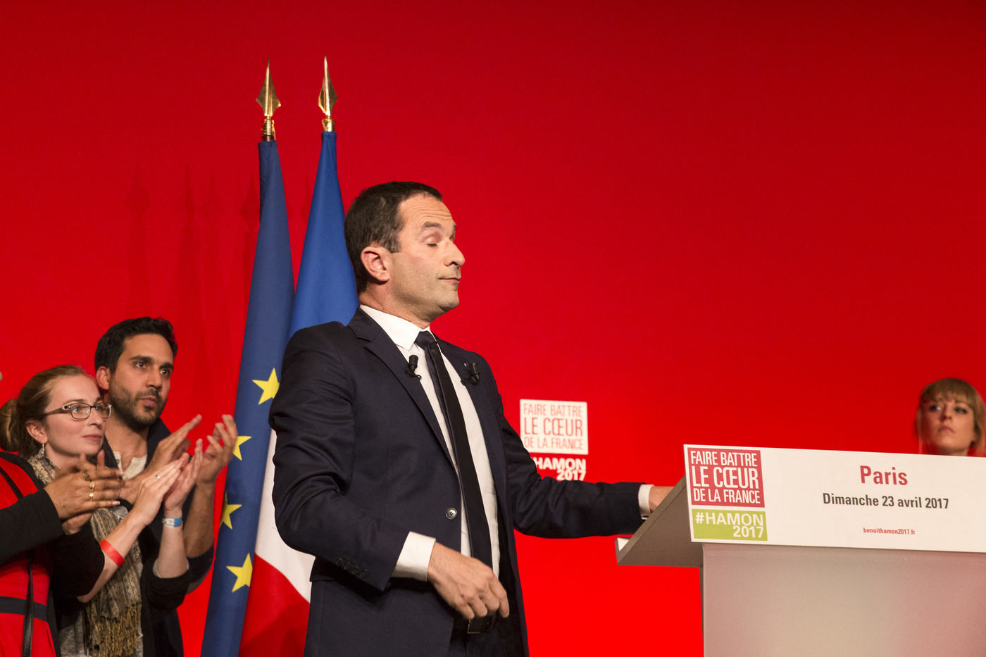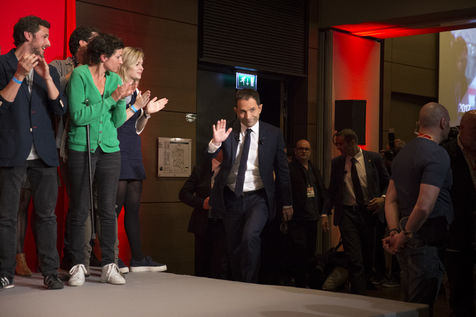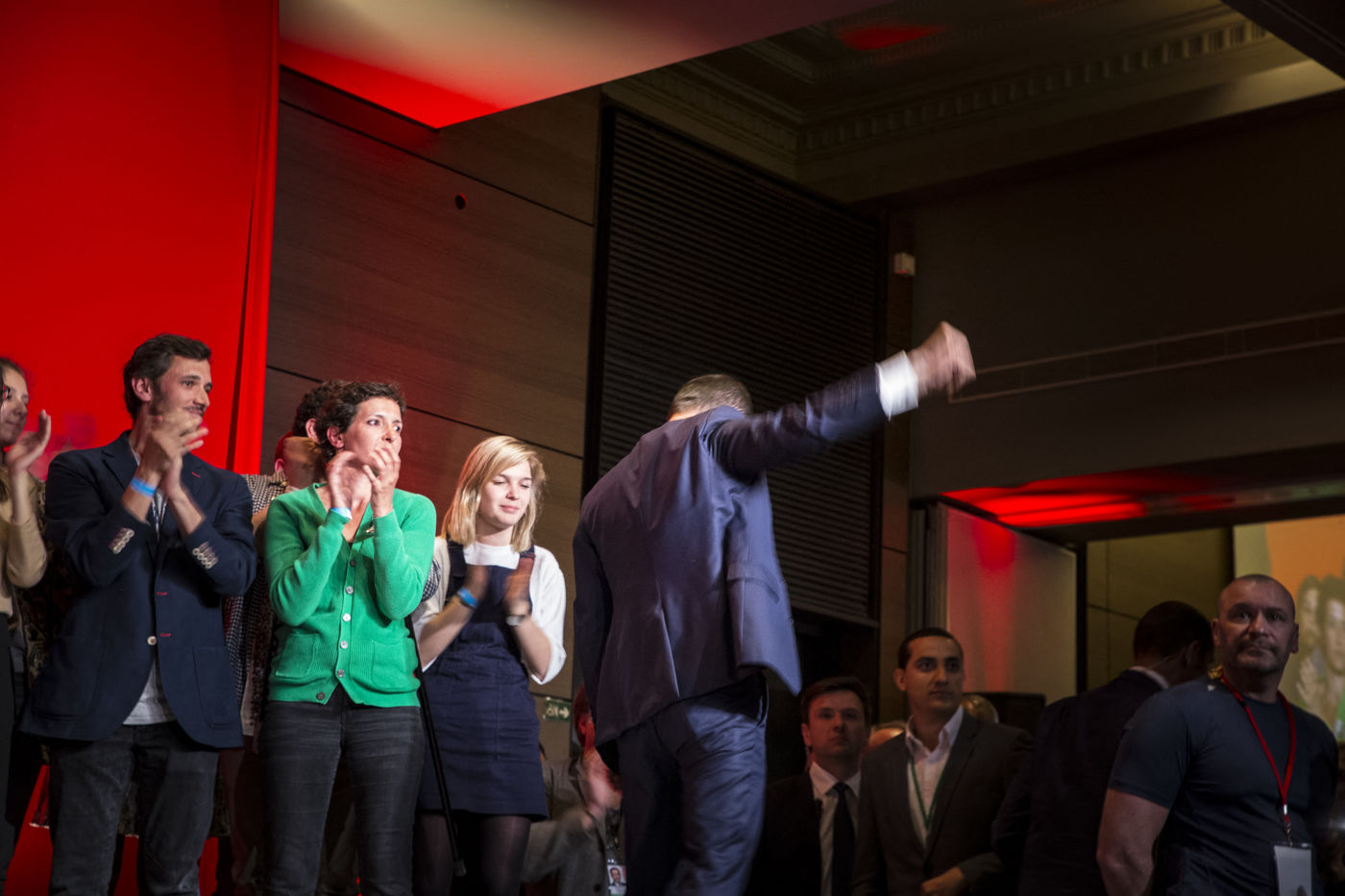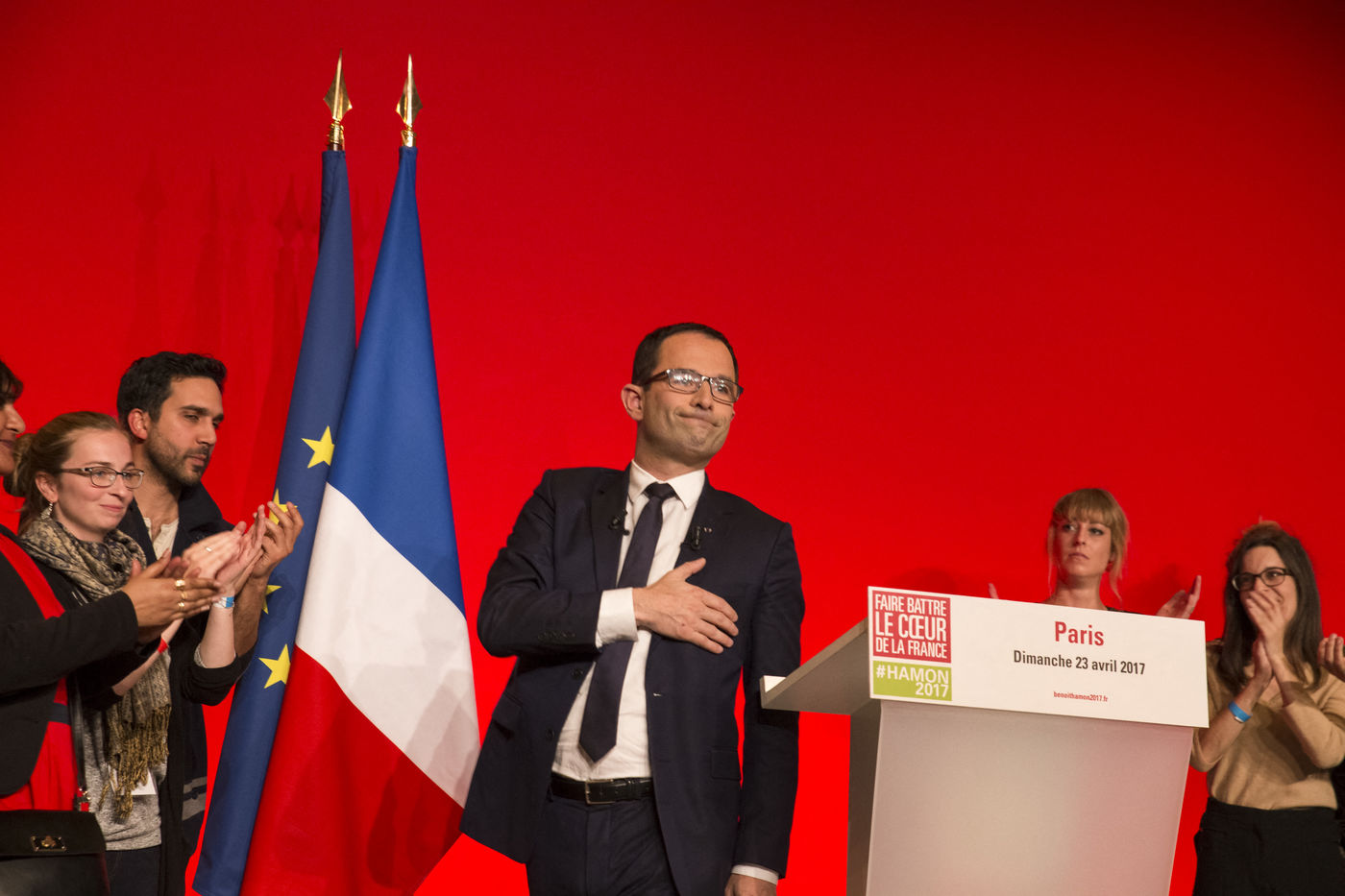 Maison de la Mutualite, Paris, France, April 23, 2017. First round of the presidential election: Electoral evening in the camp of Benoit Hamon.