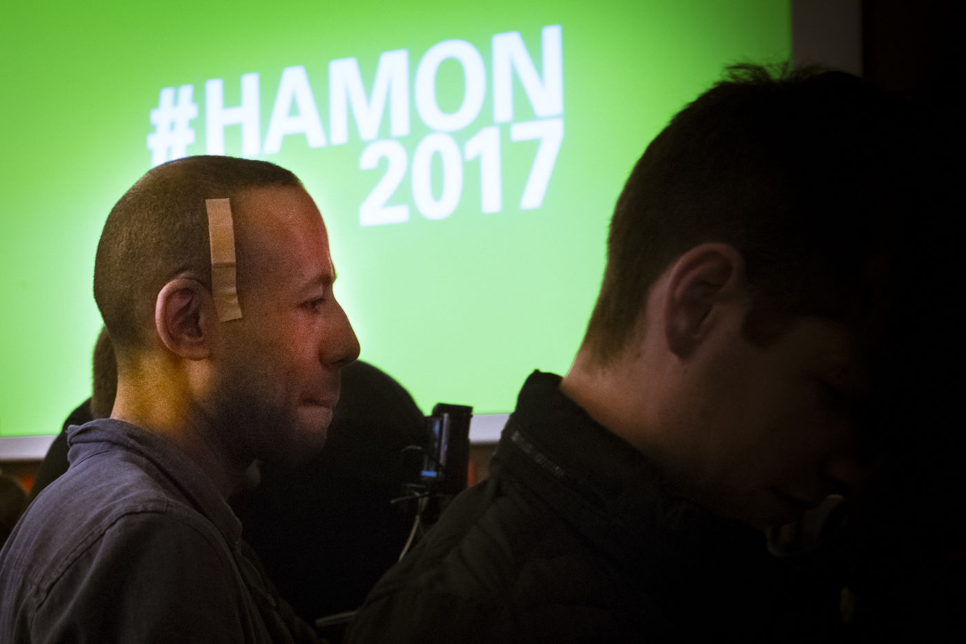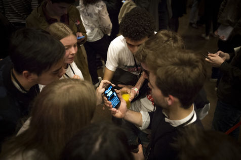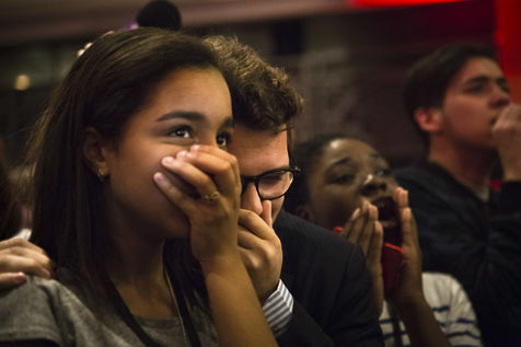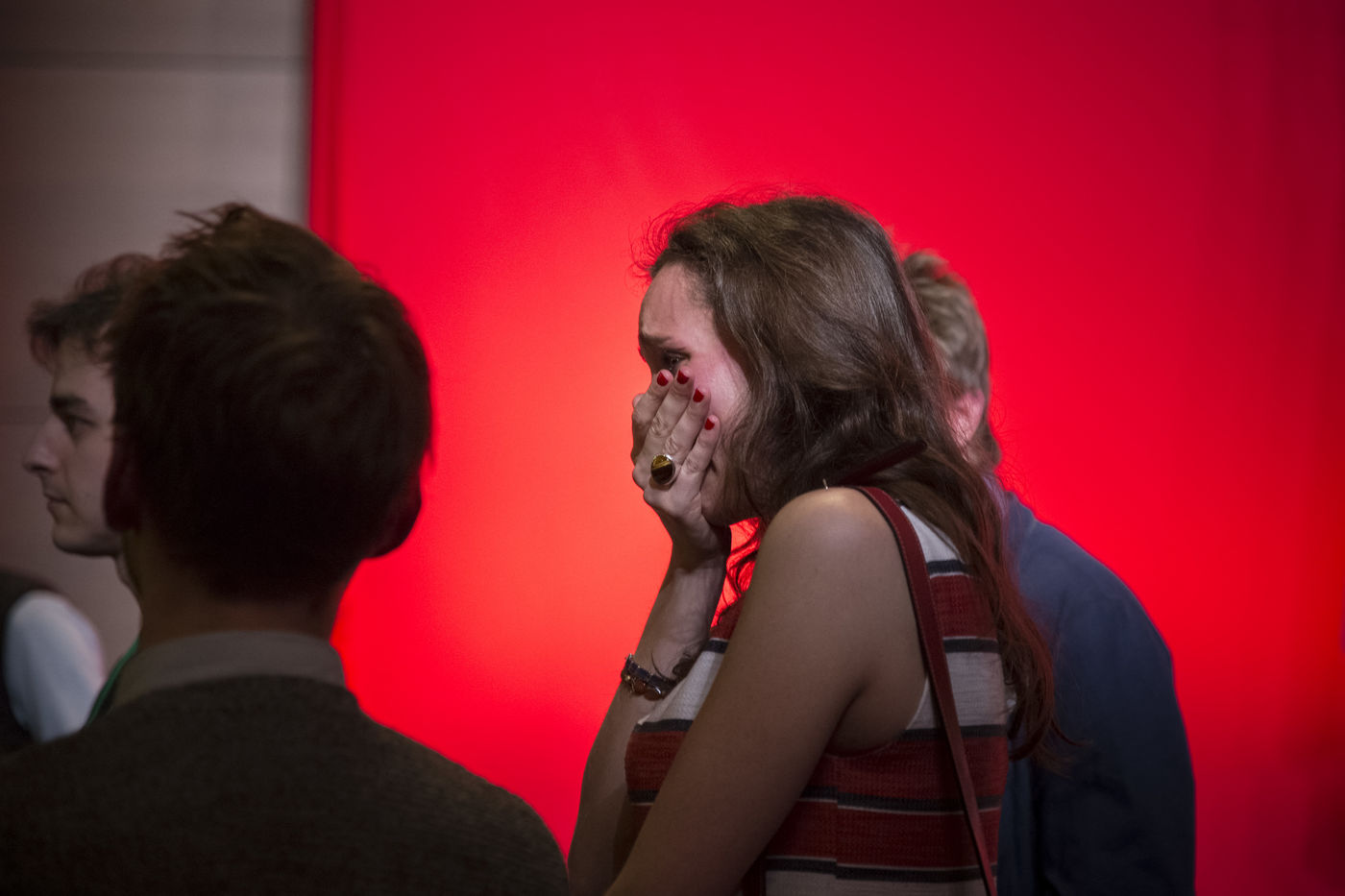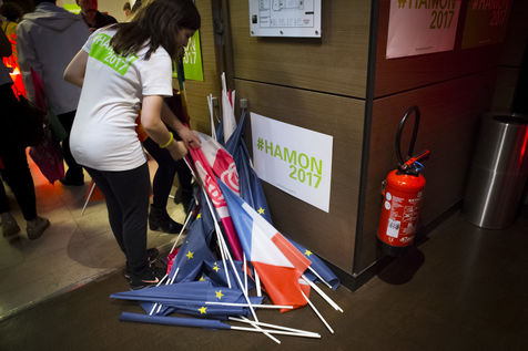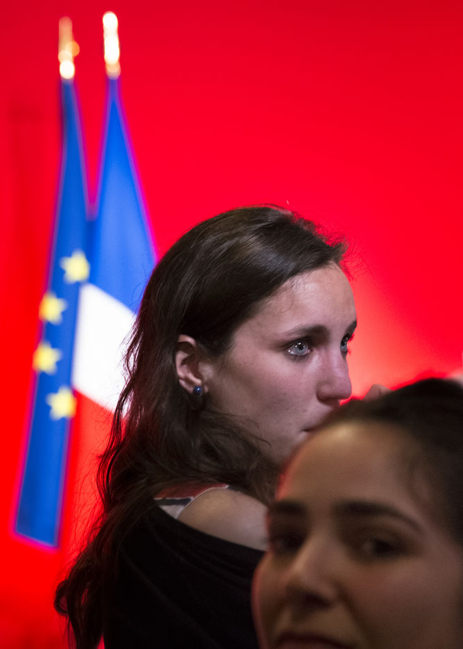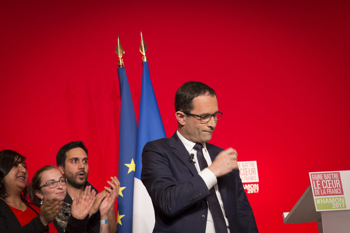 Maison de la Mutualite, Paris, France, April 23, 2017. First round of the presidential election: Electoral evening in the camp of Benoit Hamon.