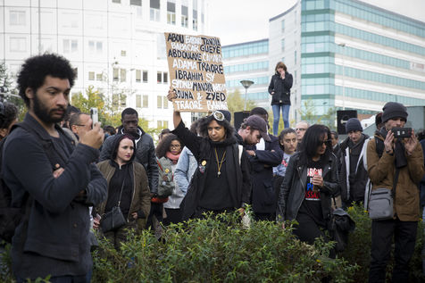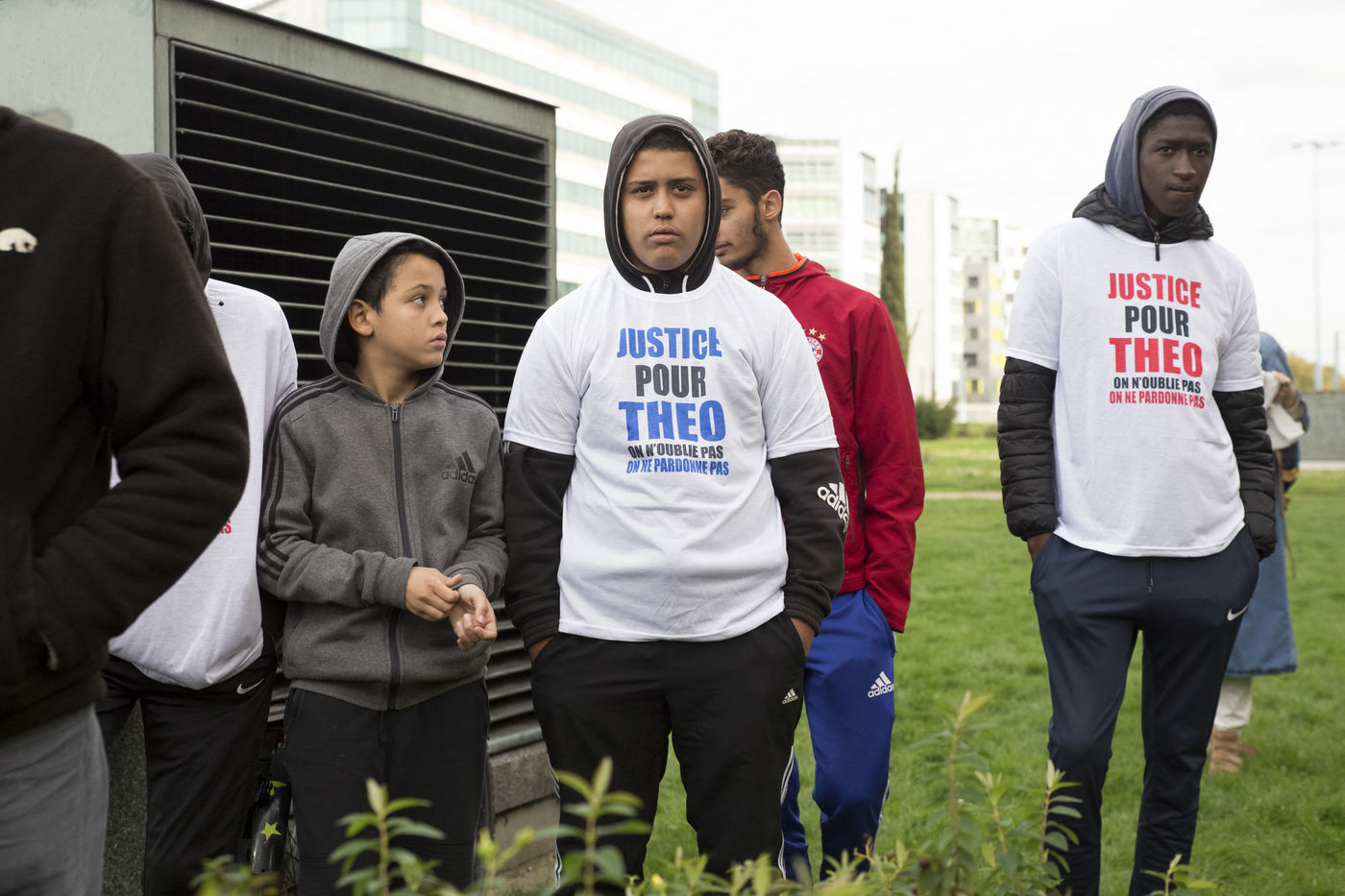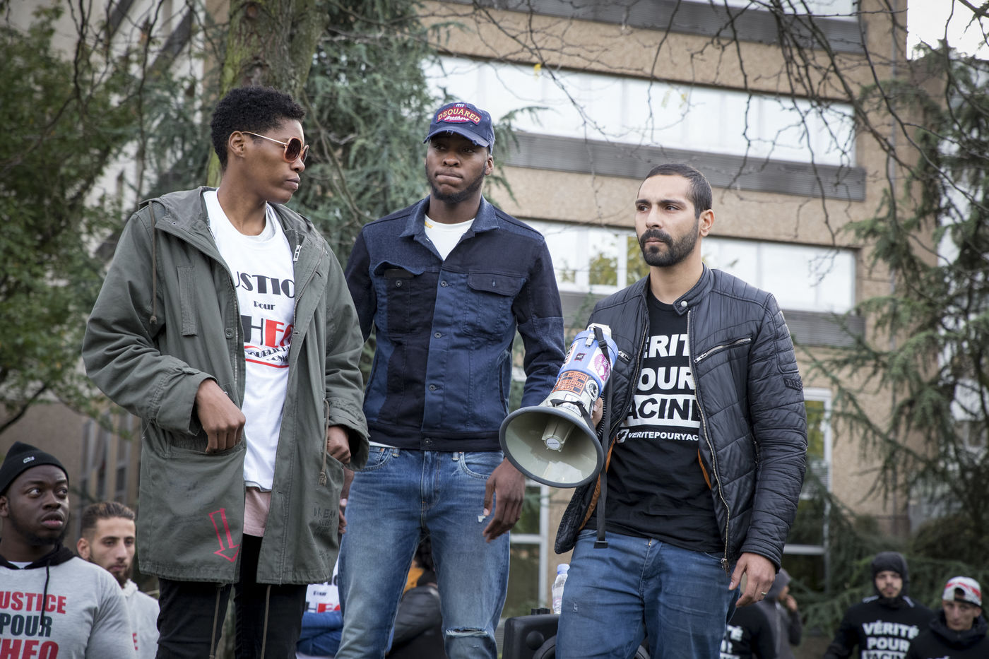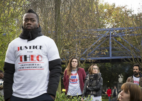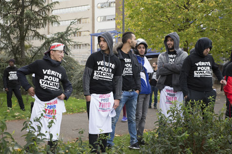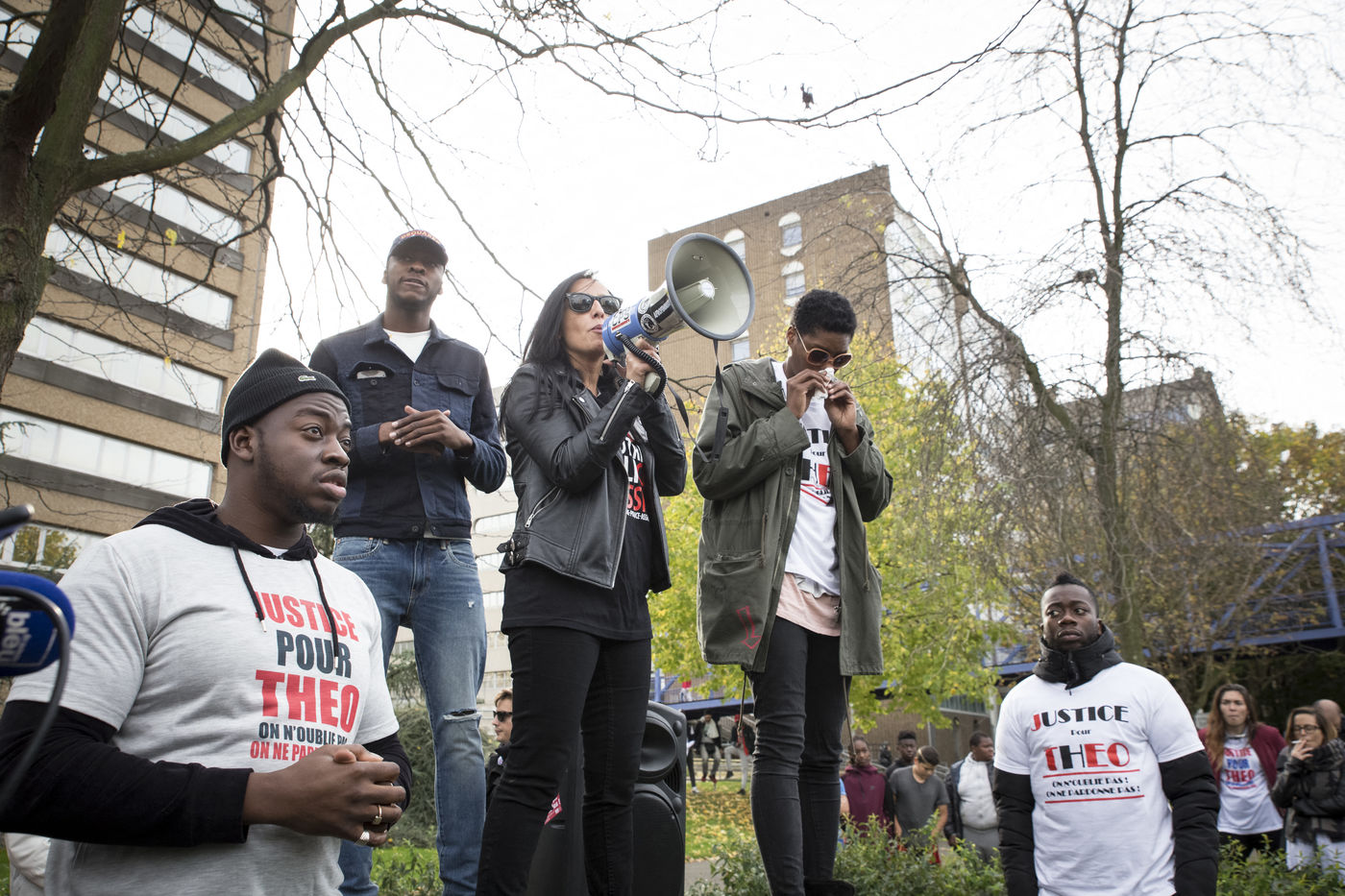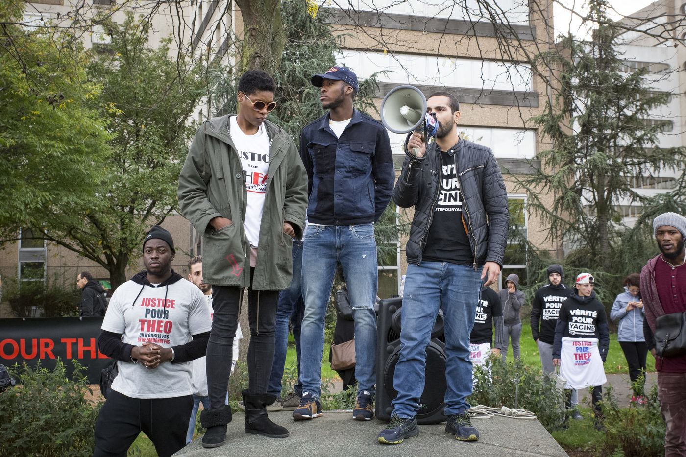 France, Bobigny (93), October 28, 2017. Gathering in front of the court of Justice in tribute and claiming Justice for Theo Luhaka, a young man seriously wounded and allegedly raped during a police control in Aulnay-sous-Bois.