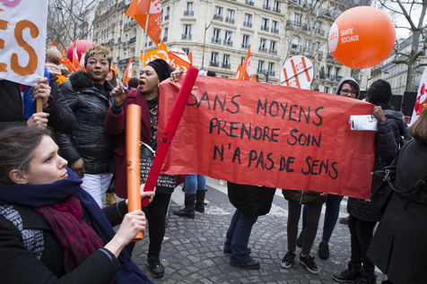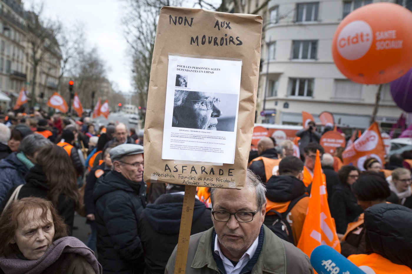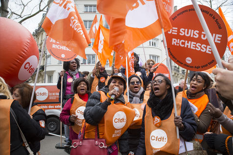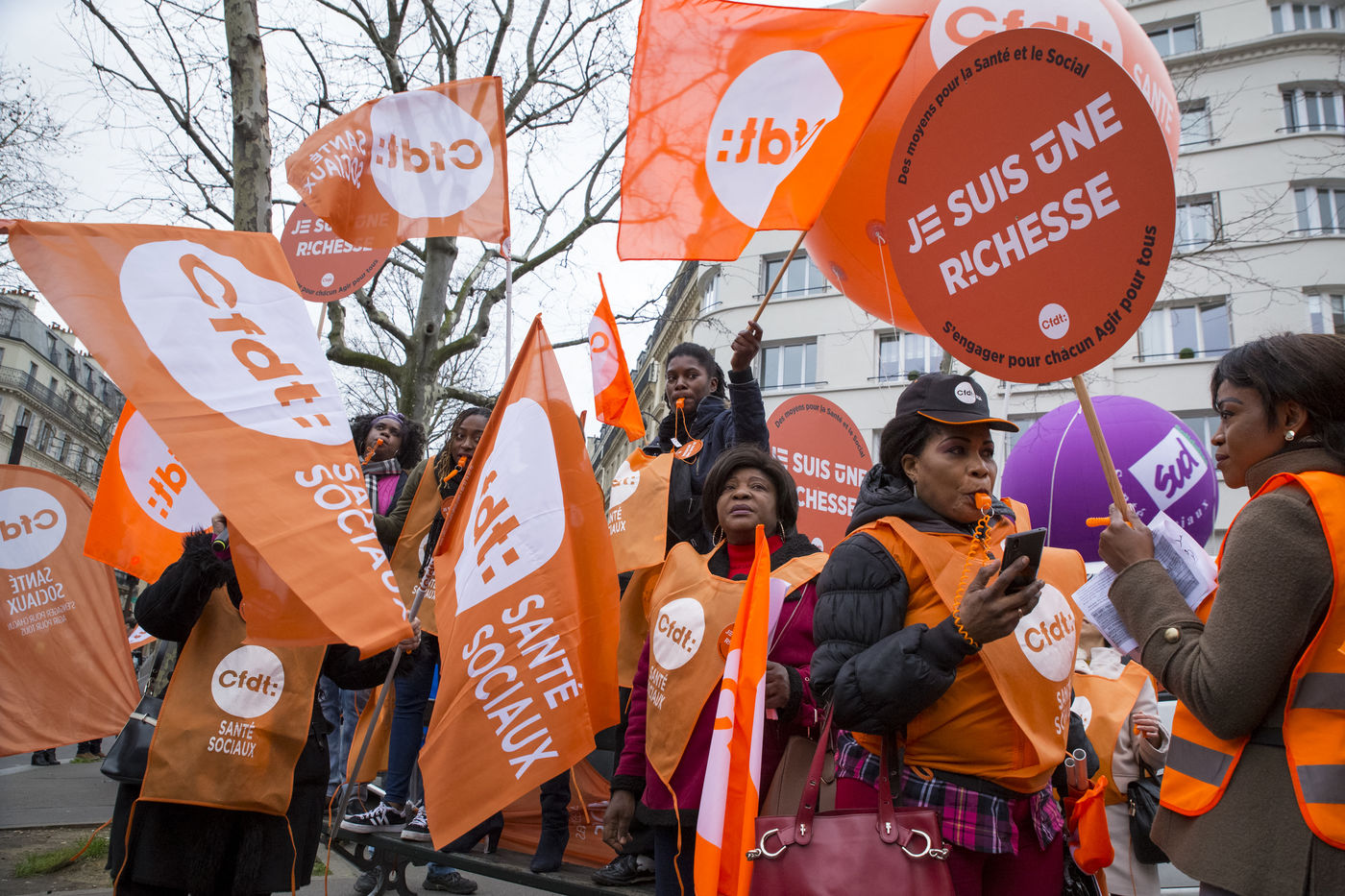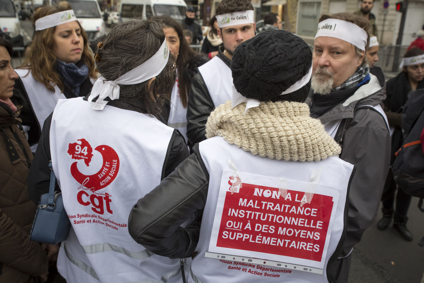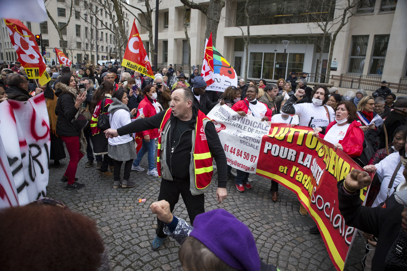Tuesday, January 30, 2018. Paris, France. The staff of EHPAD demonstrated in front of the Ministry of Solidarity and Health. Mobilization at the call of a large inter-union (CGT, CFDT, FO, Unsa, CFTC, CFE-CGC and SUD), with the support of the Association of Directors Serving the Elderly (AD-PA), the French Hospital Federation and several associations of retirees.